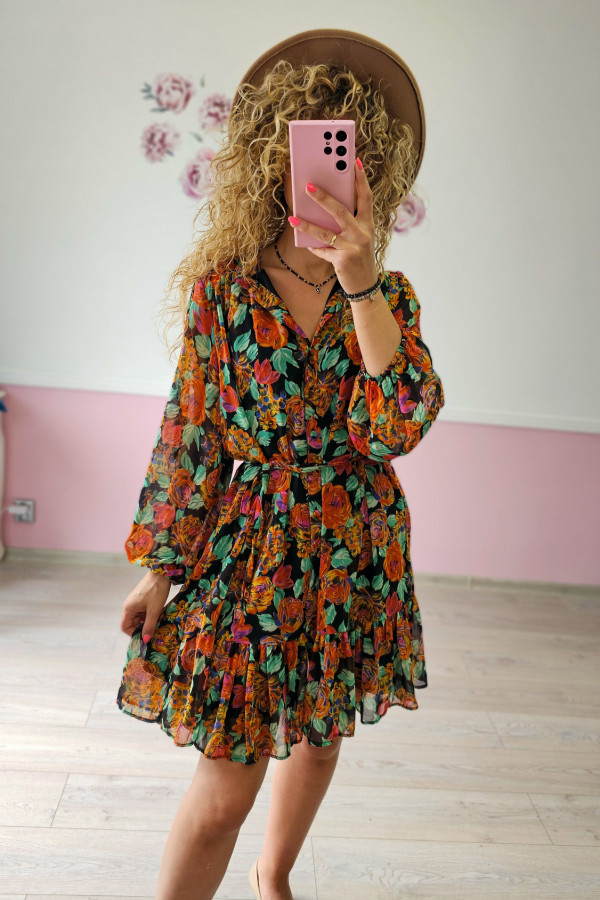 Ciemna sukienka z transparentnymi rękawami i delikatnym printem