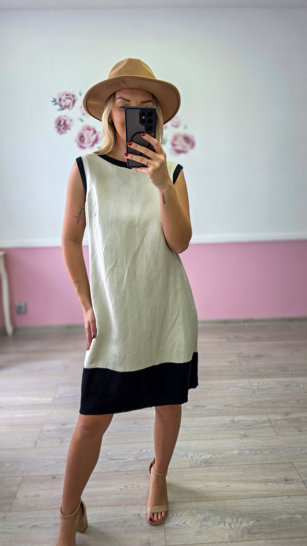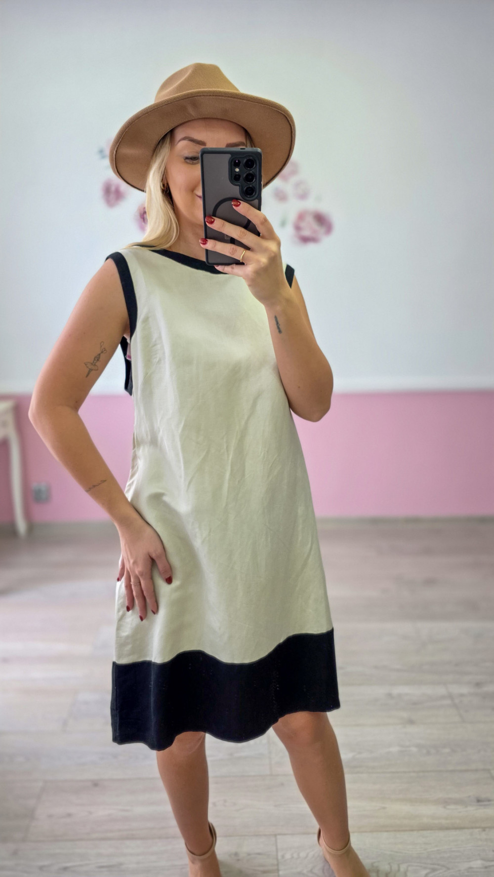 Elegancka sukienka damska wykonana z wysokiej jakości mieszanki lnu i wiskozy to idealny wybór na cieplejsze dni. Prosty, lekko luźny fason zapewnia komfort noszenia i swobodę ruchów, a kontrastowe czarne wykończenia przy ramionach i u dołu sukienki nadają całości nowoczesnego, stylowego charakteru. Naturalny materiał pozwala skórze oddychać, dzięki czemu sukienka doskonale sprawdzi się zarówno na co dzień, jak i na letnie spotkania, do pracy czy wakacyjne wyjazdy.