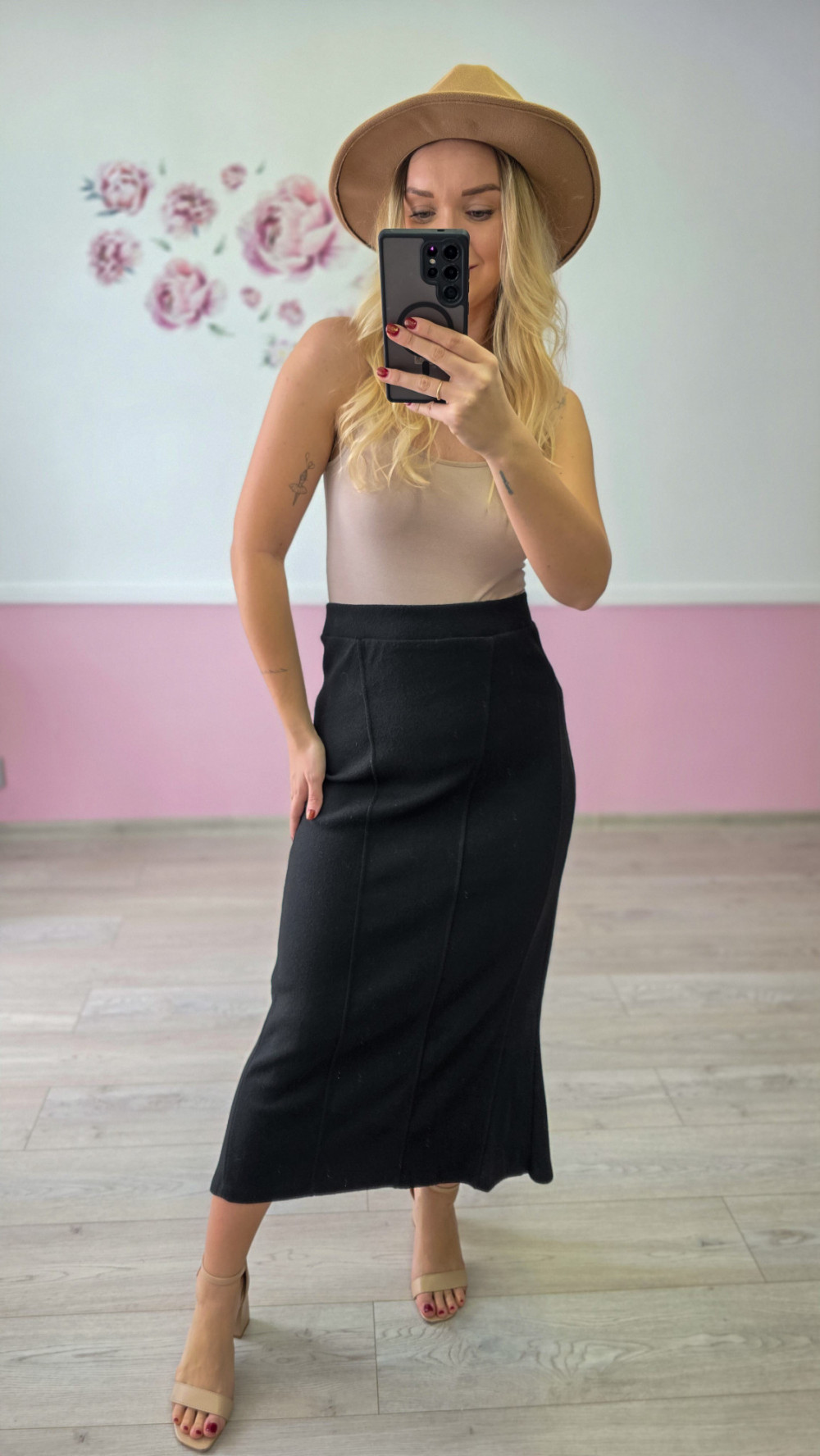 Czarna spódnica midi to klasyk, który powinien znaleźć się w każdej kobiecej szafie. Wysoki stan pięknie podkreśla talię, a subtelnie rozszerzany dół nadaje jej elegancji i lekkości. Spódnica świetnie sprawdzi się do pracy, na uroczyste wyjścia, rodzinne wydarzenia oraz jako element codziennych stylizacji. Uniwersalny czarny kolor pozwala łatwo dopasować ją do body, koszul oraz swetrów.