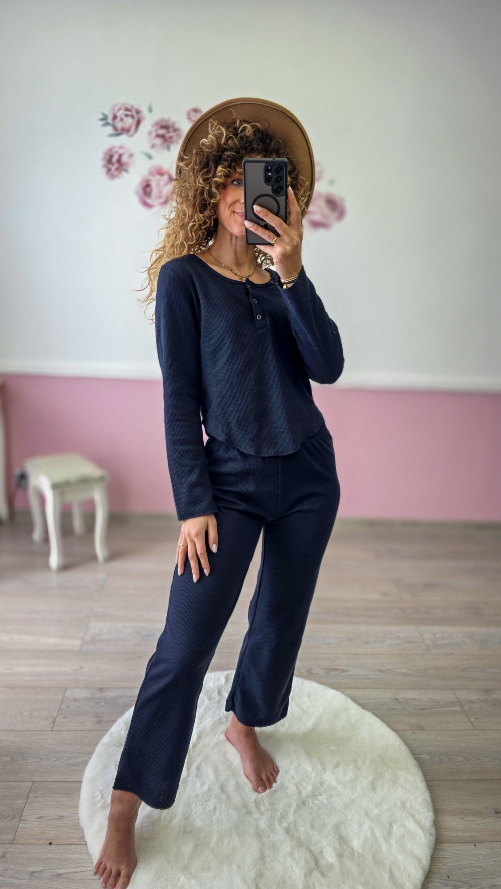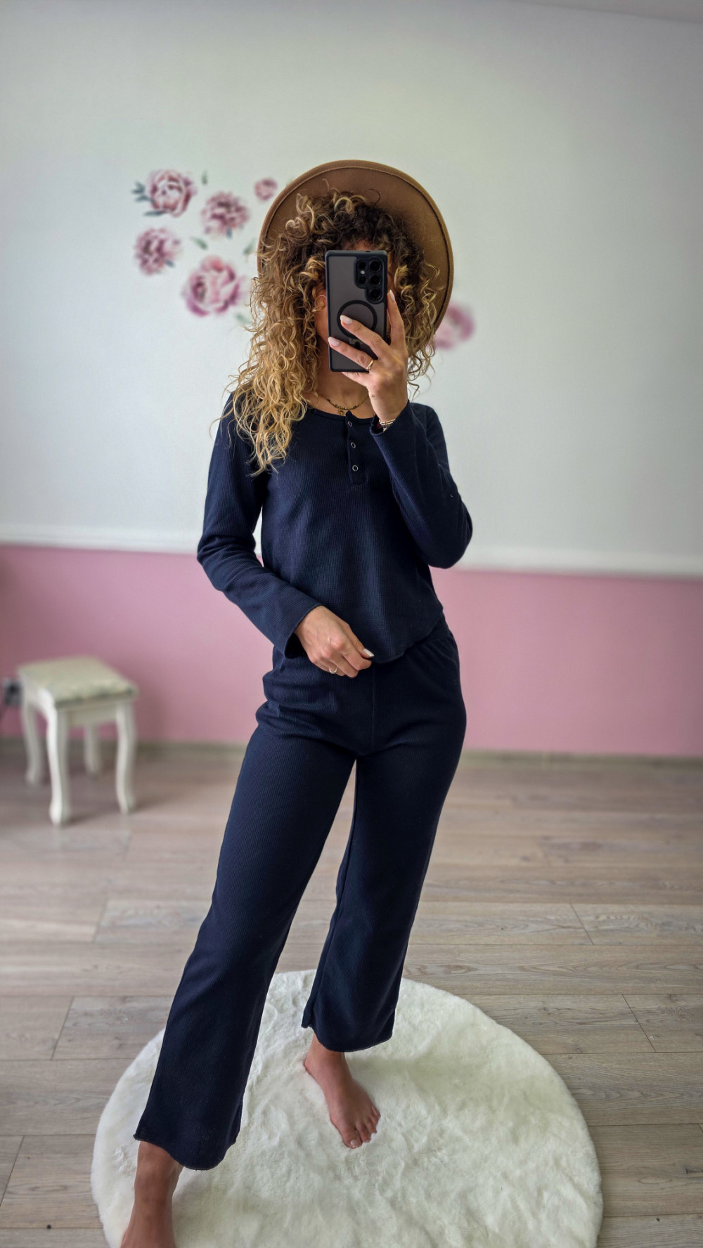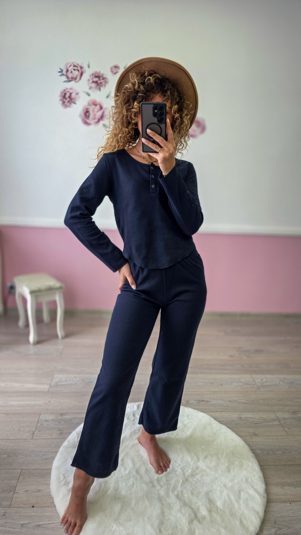 Stylowy granatowy komplet damski wykonany z miękkiej, przyjemnej w dotyku dzianiny o drobnej fakturze. Zestaw składa się z dopasowanej bluzki z dekoltem na guziki oraz prostych, wygodnych spodni o lekko rozszerzanej nogawce. Idealny do codziennego noszenia, pracy zdalnej, domowego relaksu czy spokojnych spacerów.