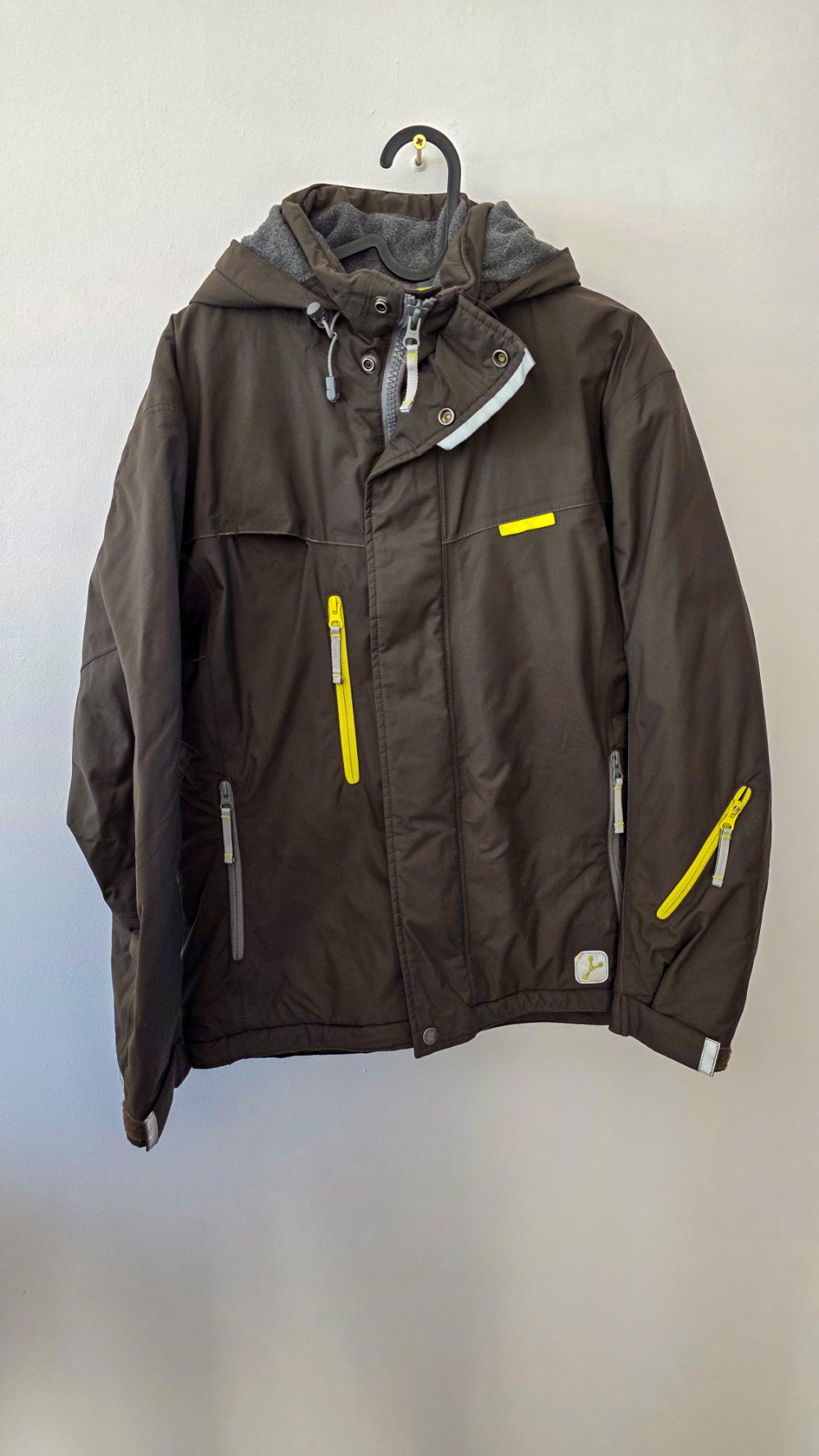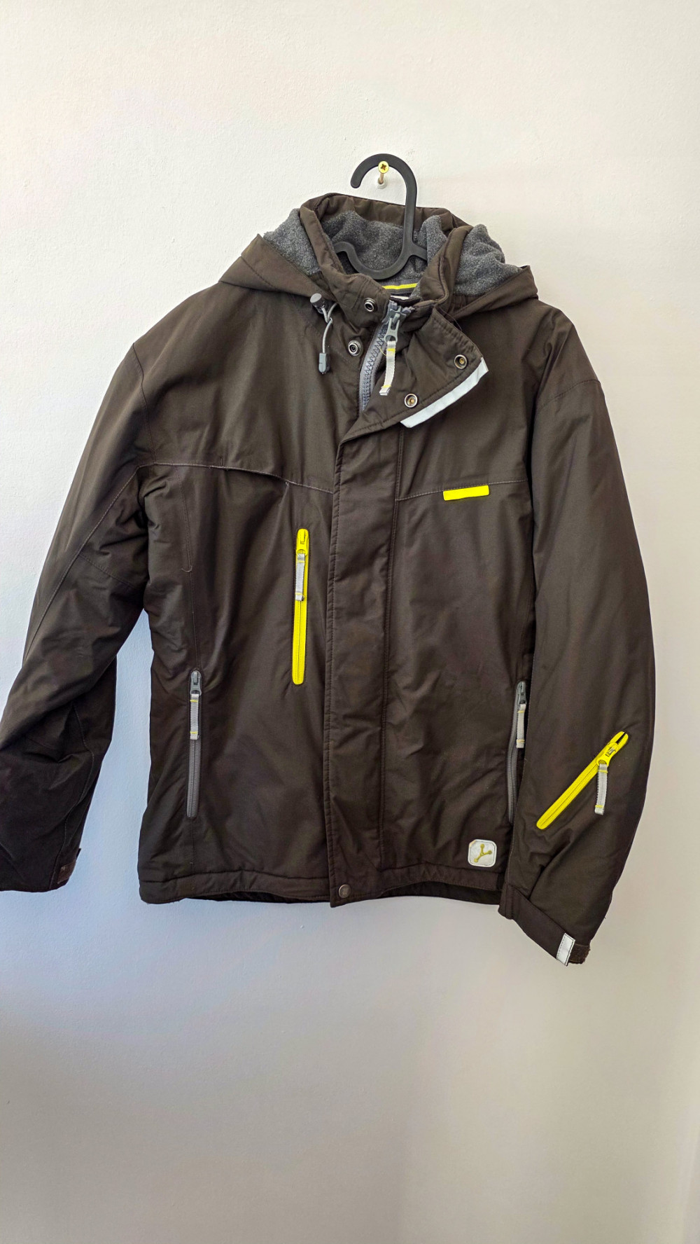Brązowa męska kurtka zimowa z żółtymi suwakami S/M