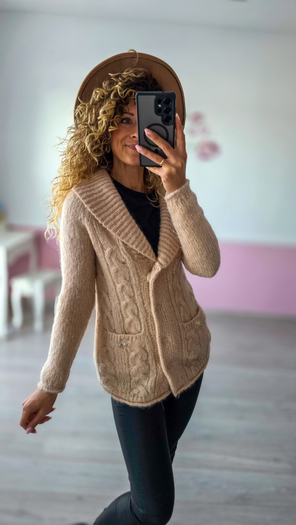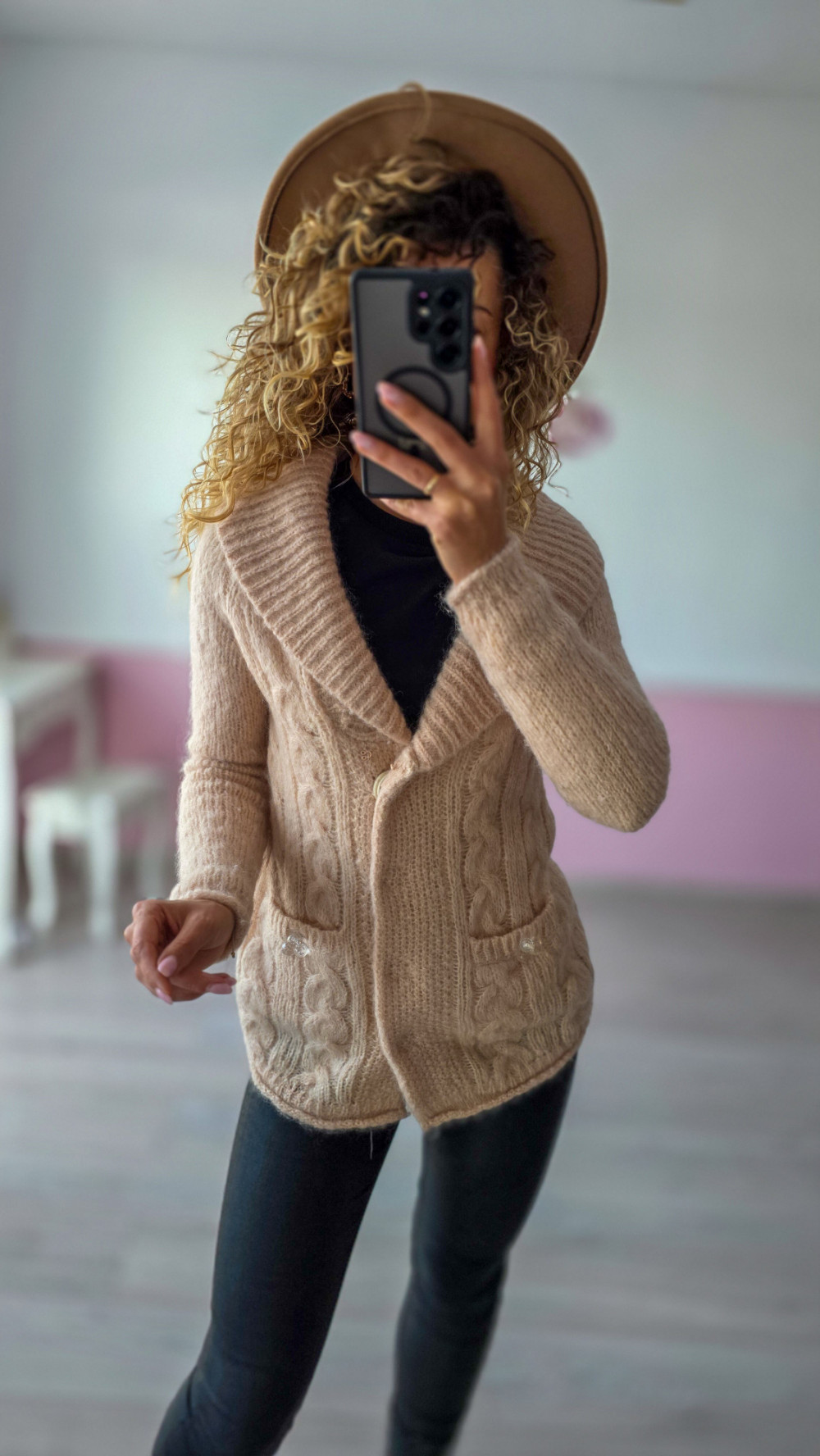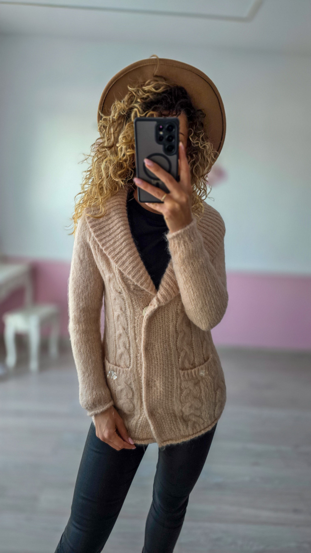 Kardigan damski pudrowy jasny z wełną i moherem – elegancki sweter zapinany