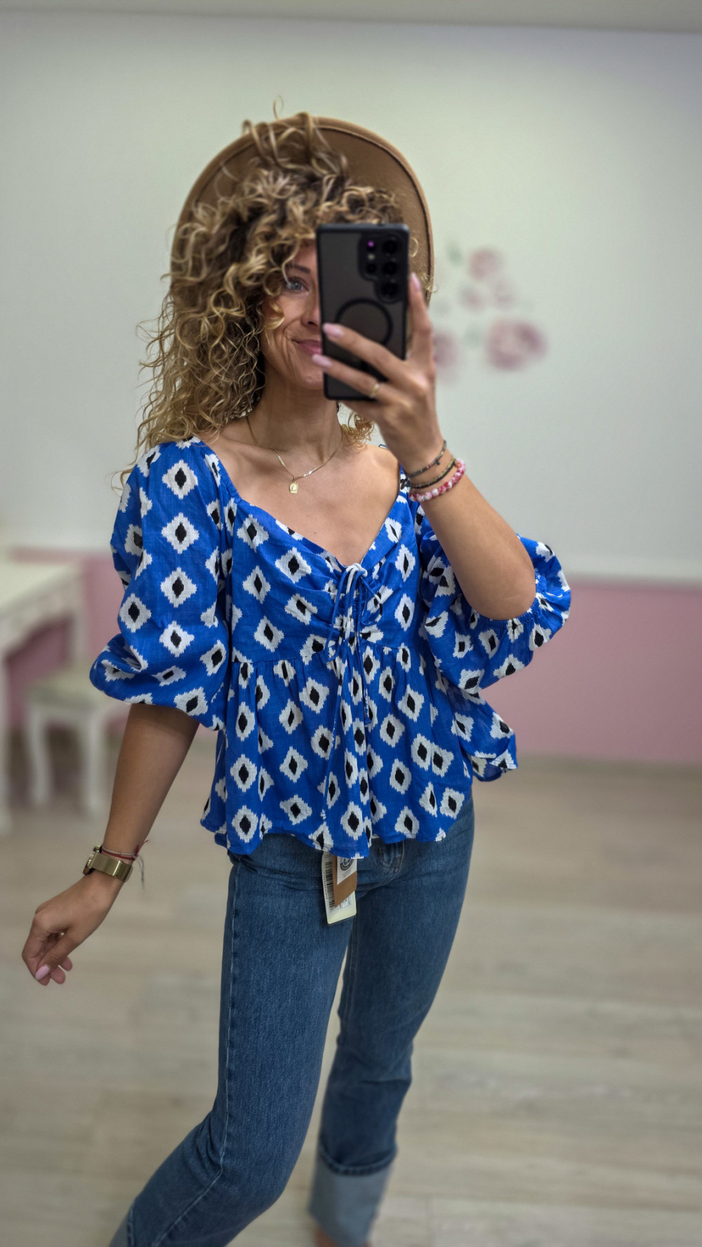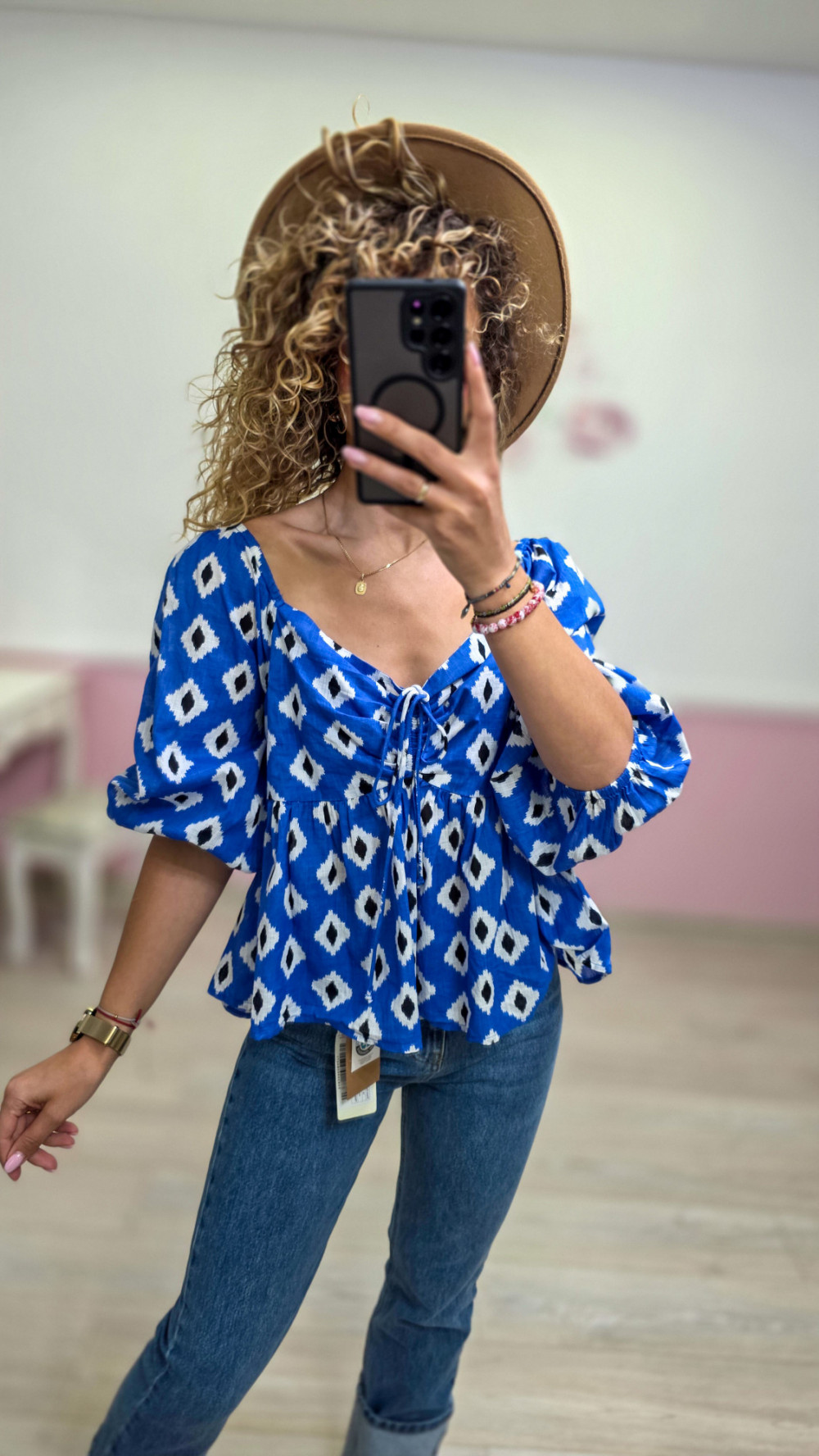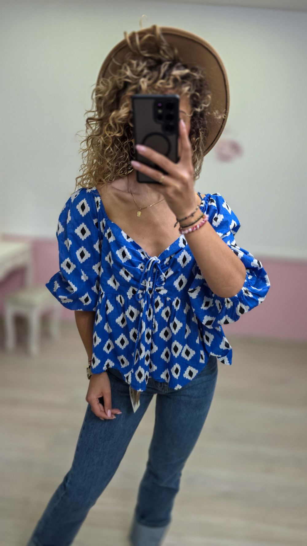 Ta niebieska bluzka w stylu boho przyciąga uwagę intensywnym kolorem i modnym geometrycznym wzorem. Dekolt regulowany ozdobnym wiązaniem pięknie podkreśla szyję i obojczyki, a bufiaste rękawy dodają jej wyjątkowego charakteru. Luźny, przewiewny fason świetnie układa się na sylwetce, zapewniając komfort i swobodę przez cały dzień. To idealna propozycja na cieplejsze dni, wakacyjne wyjazdy, letnie spacery lub stylizacje w klimacie boho-chic. Z jeansami wygląda lekko i dziewczęco, a w zestawie ze spódnicą stworzy pełen luzu, a jednocześnie efektowny outfit.
