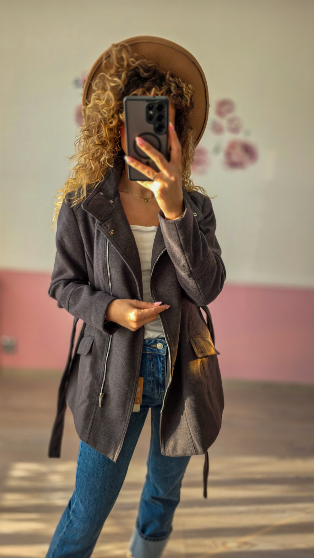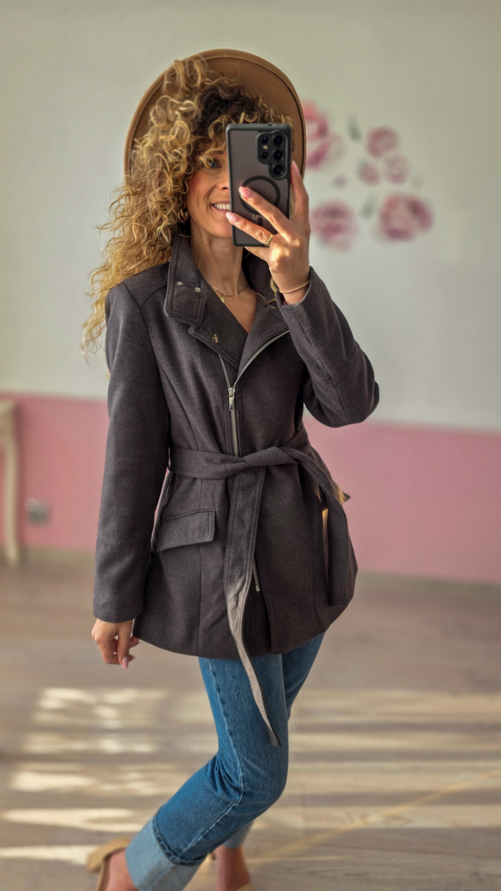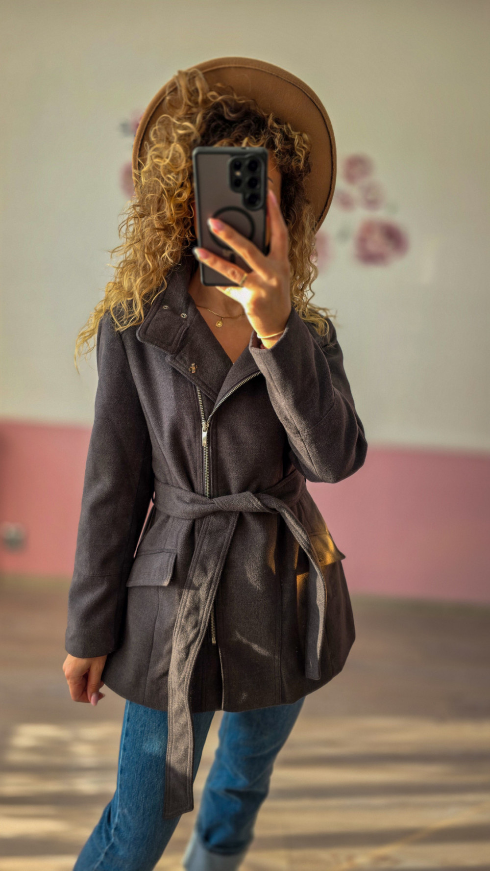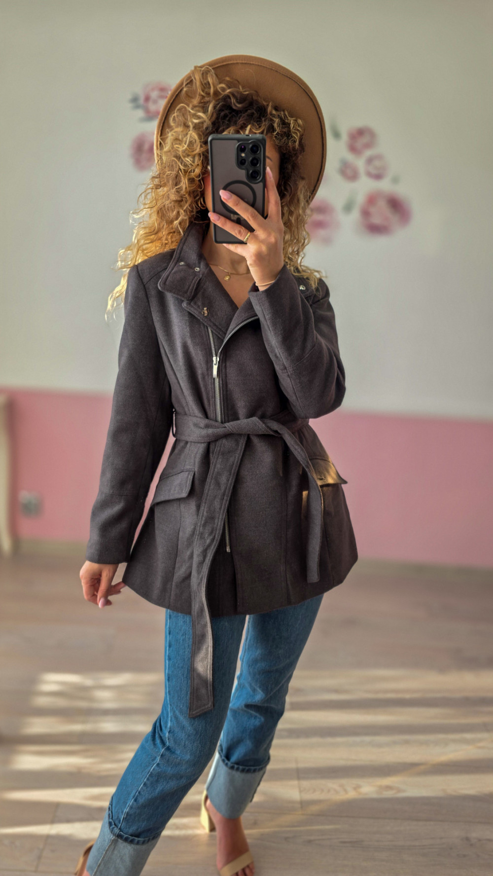Grafitowy płaszcz z paskiem to połączenie klasycznego fasonu z nowoczesnymi detalami. Asymetryczny zamek i dopasowanie w talii wysmuklają sylwetkę, a elegancki kolor sprawia, że to model idealny na każdy dzień — od pracy po miejskie spacery.