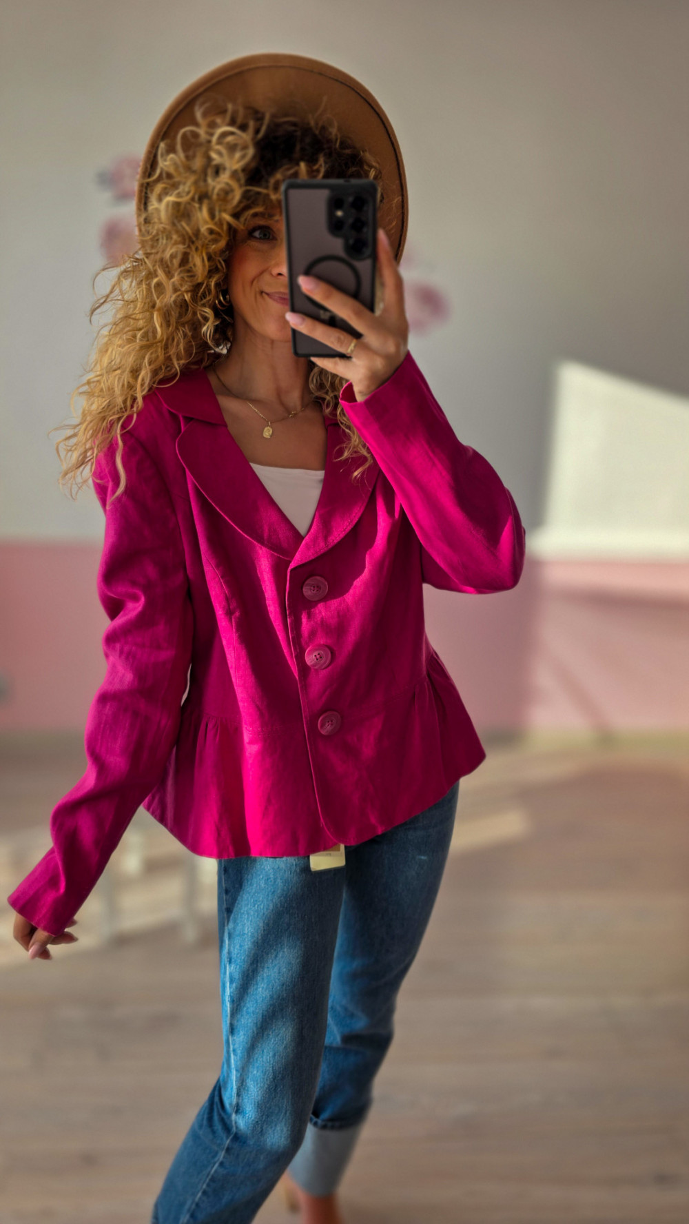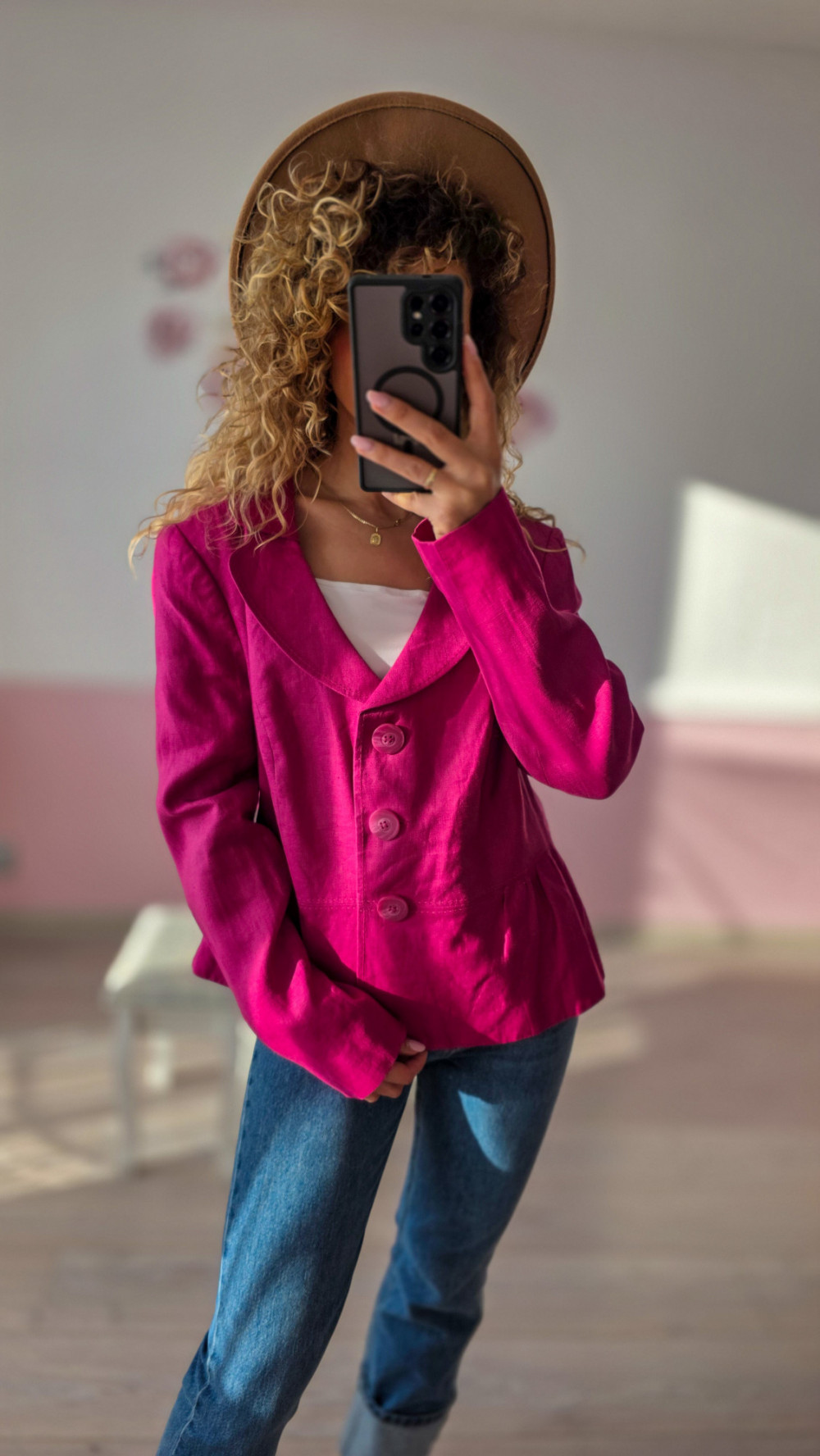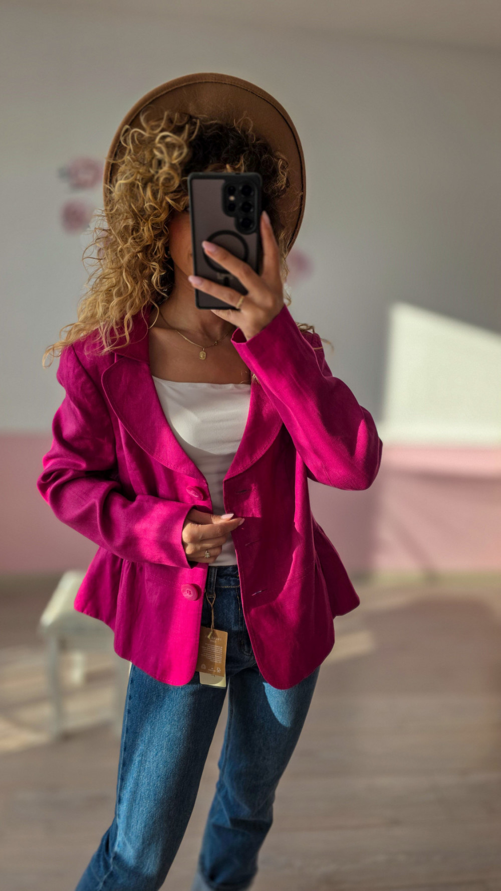 Fuksjowa marynarka lniana 100% – wyrazista elegancja na lato