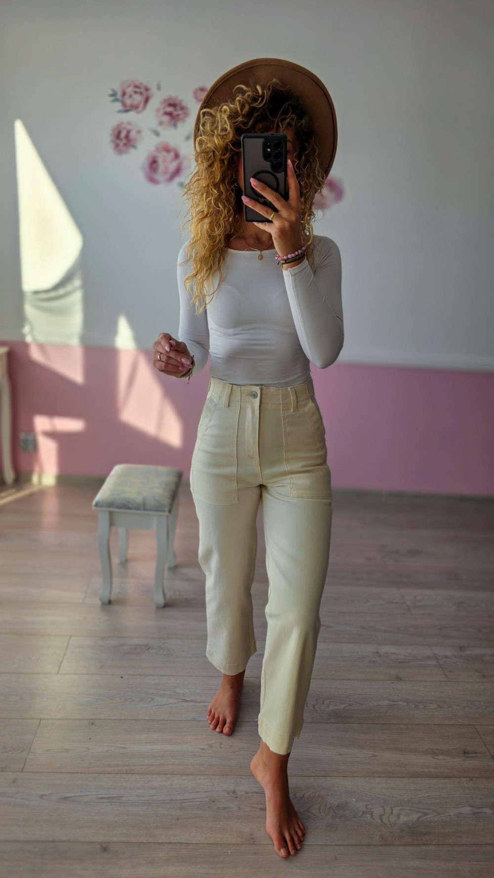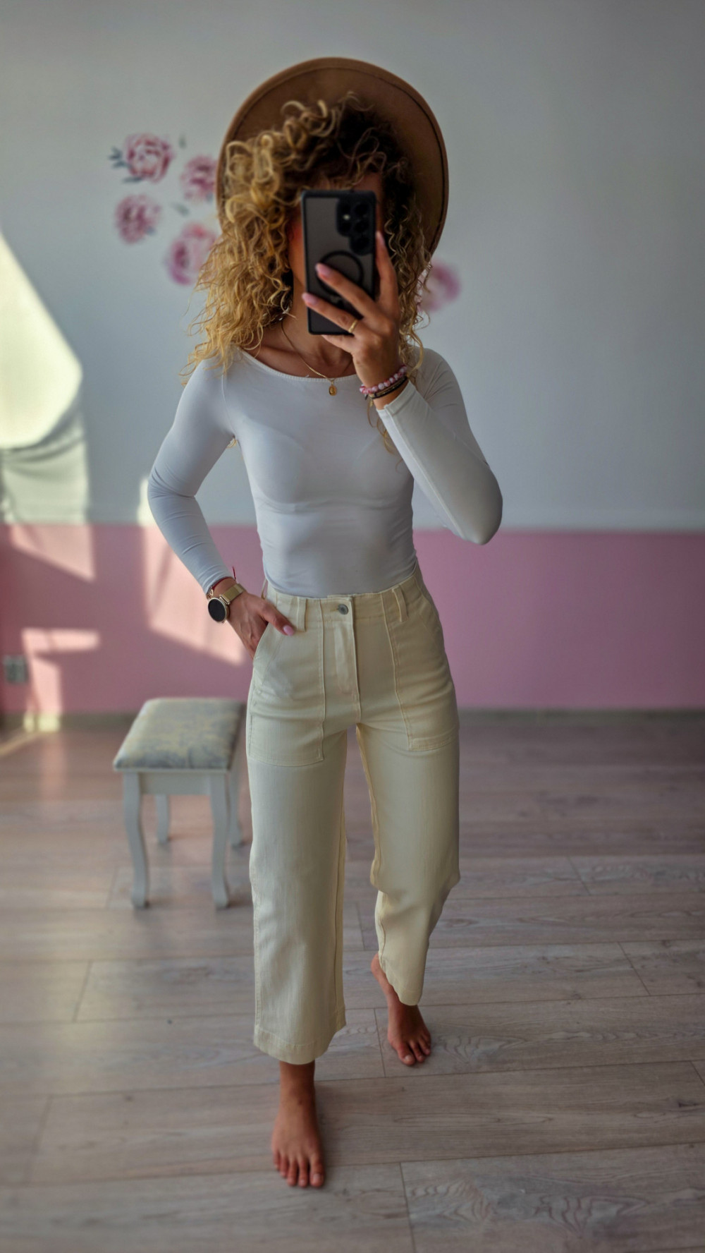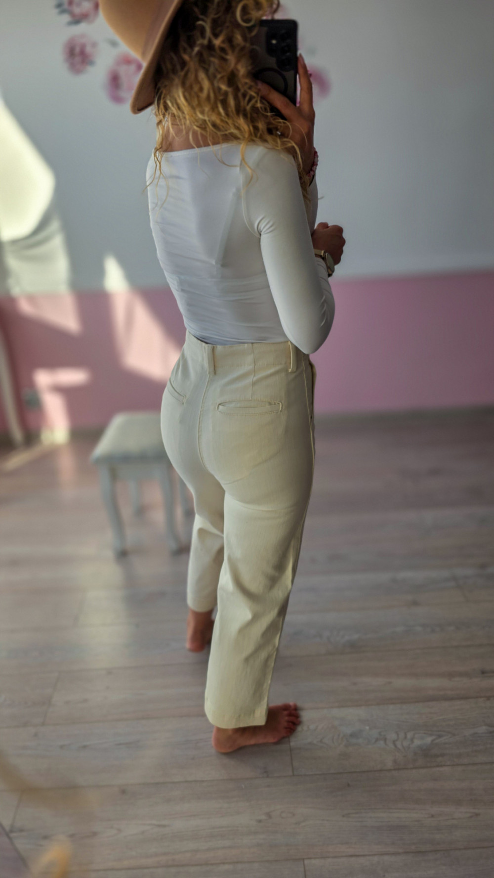 Kremowe spodnie z wysokim stanem to idealna propozycja dla kobiet, które lubią minimalistyczny styl i wygodę. Model pięknie podkreśla talię, ma prostą nogawkę i świetnie sprawdzi się zarówno w eleganckich, jak i codziennych stylizacjach. Doskonałe do białych topów, koszul i swetrów na każdą porę roku.