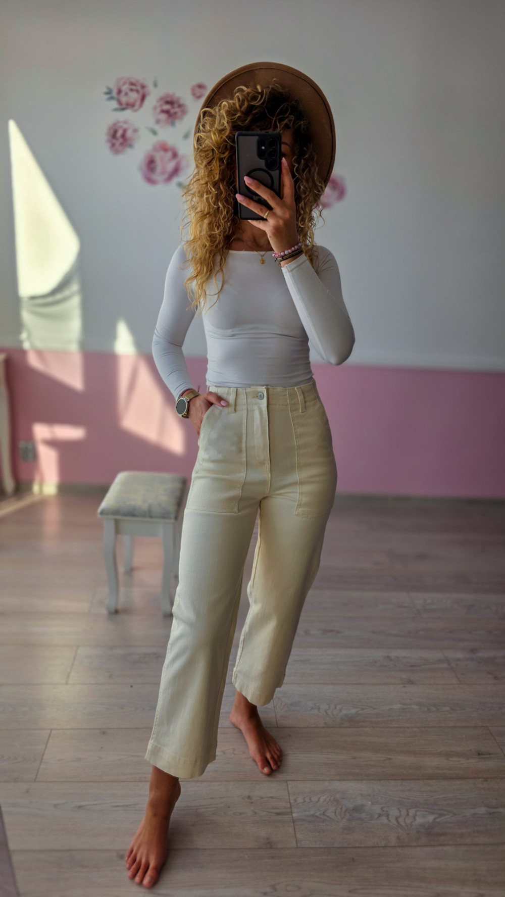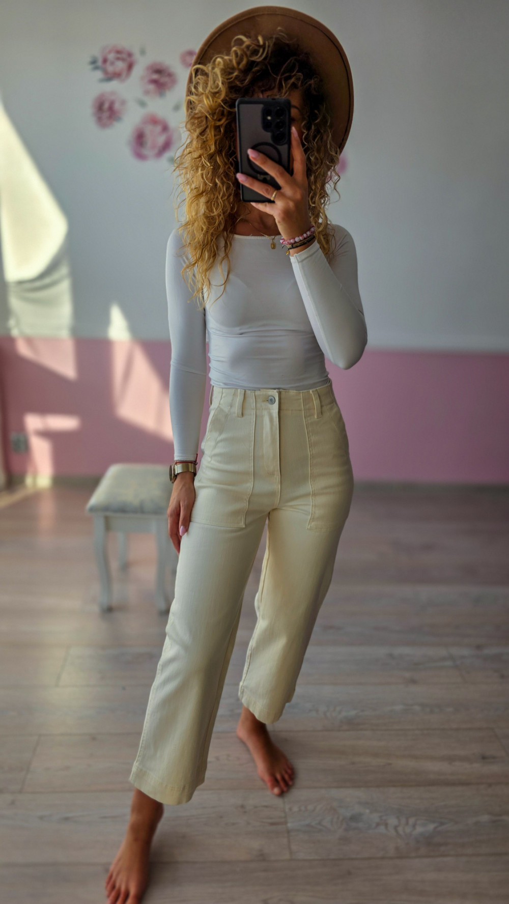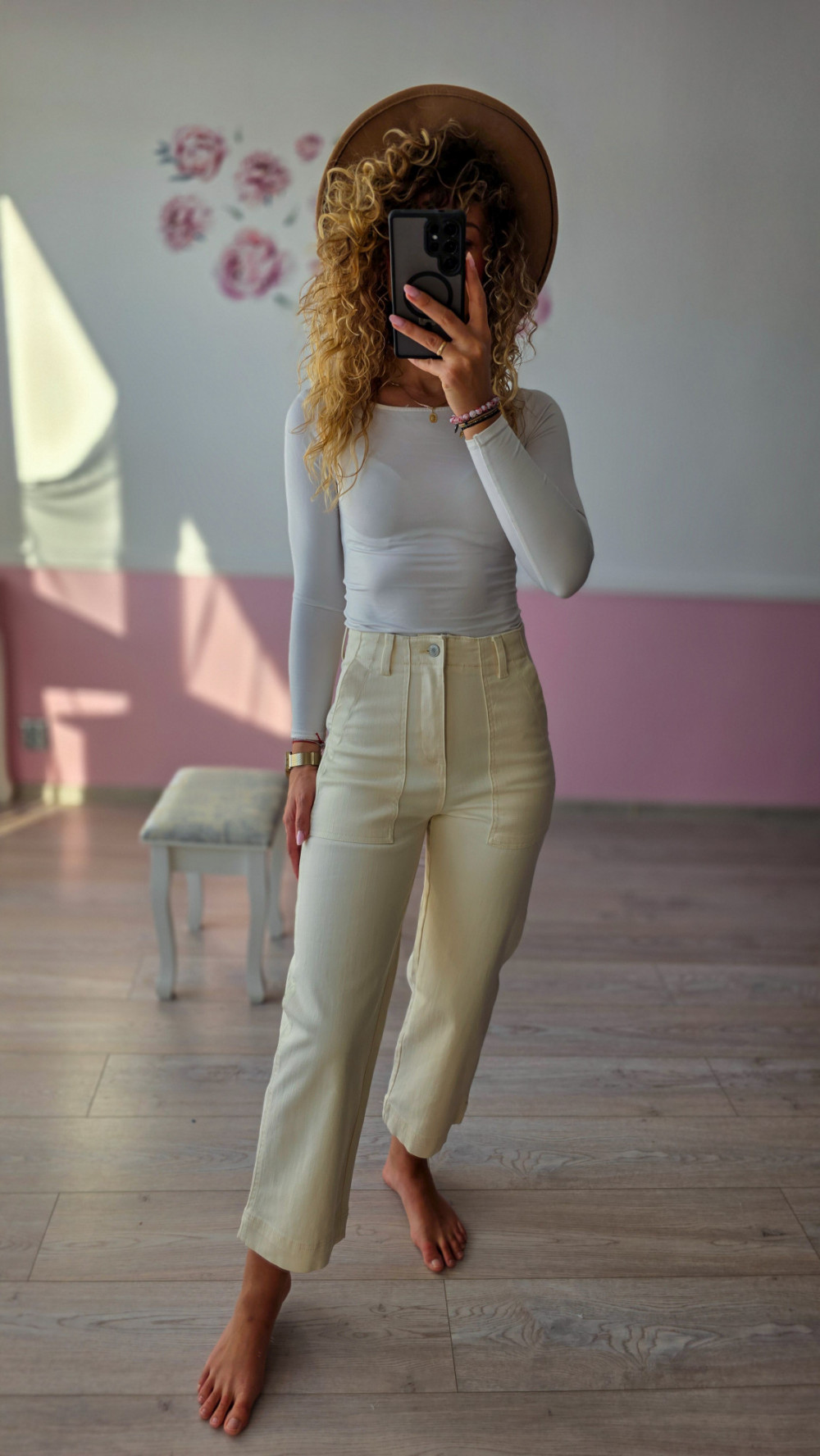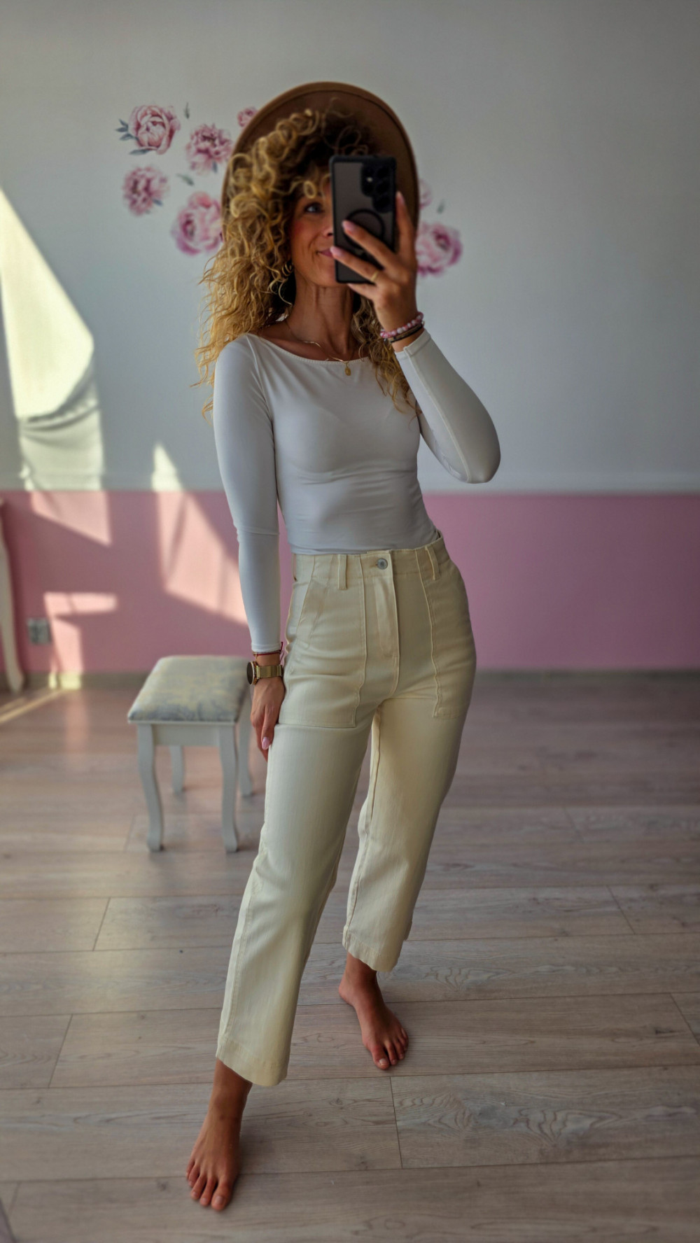 Kremowe spodnie z wysokim stanem to idealna propozycja dla kobiet, które lubią minimalistyczny styl i wygodę. Model pięknie podkreśla talię, ma prostą nogawkę i świetnie sprawdzi się zarówno w eleganckich, jak i codziennych stylizacjach. Doskonałe do białych topów, koszul i swetrów na każdą porę roku.