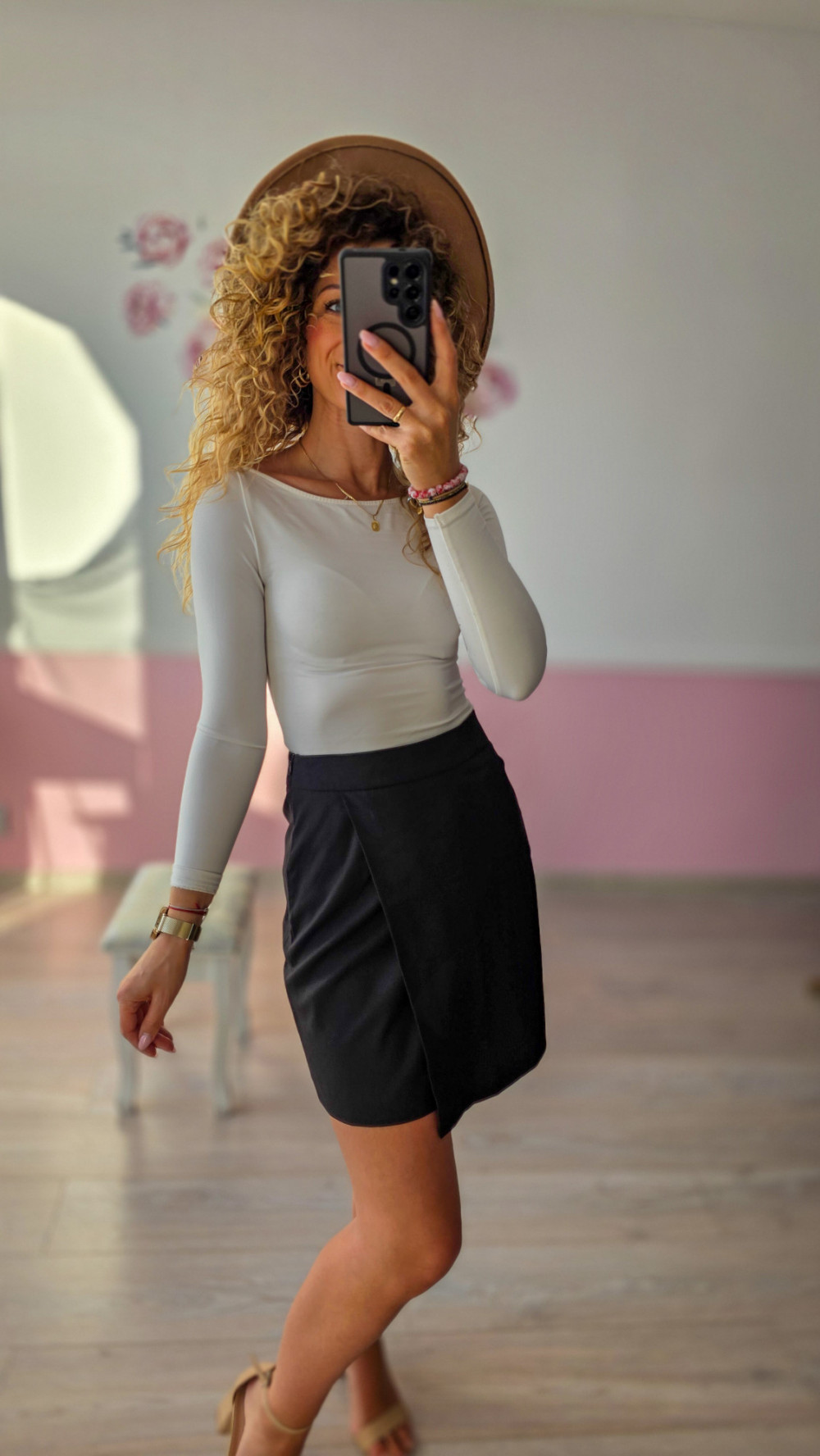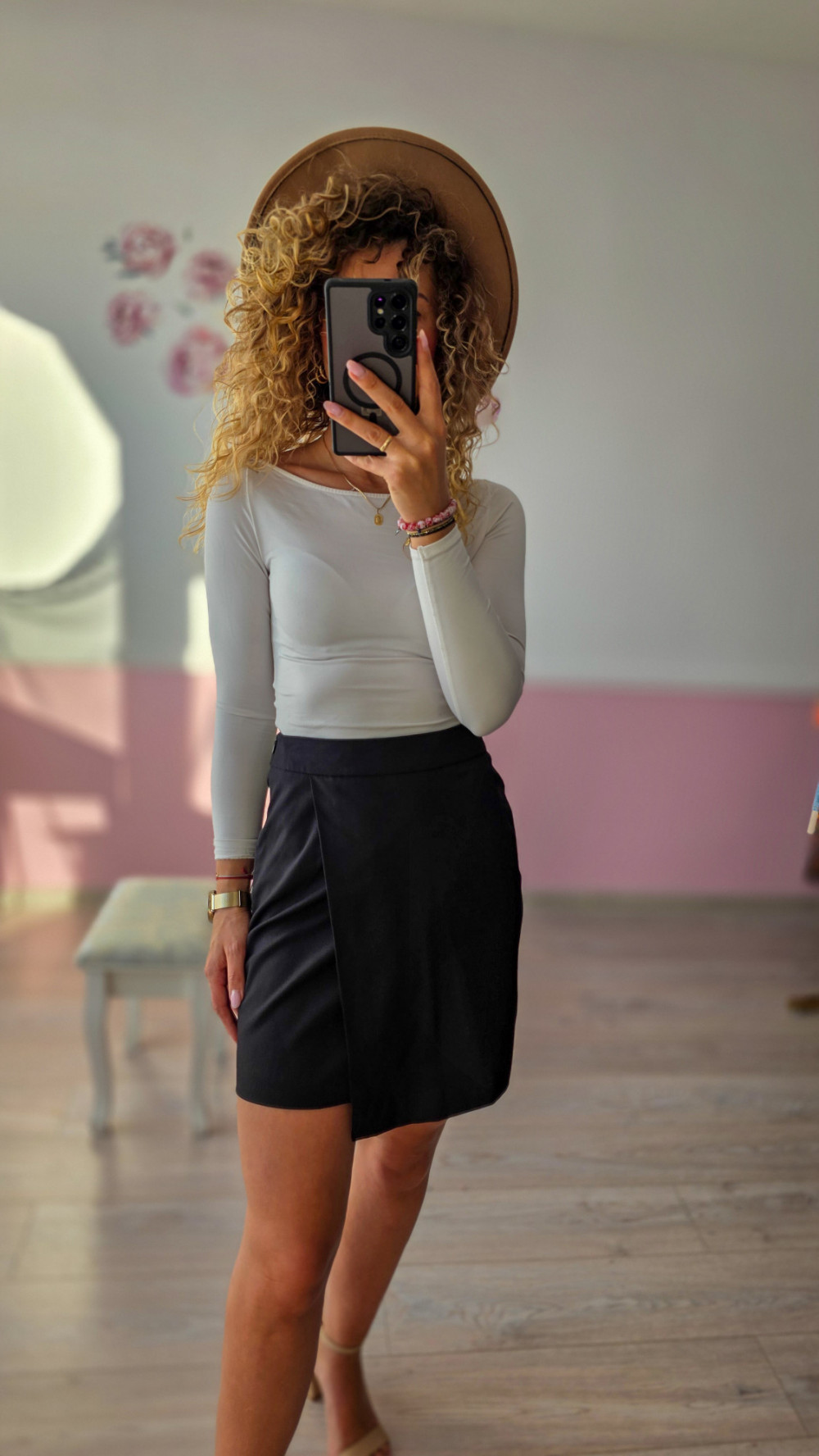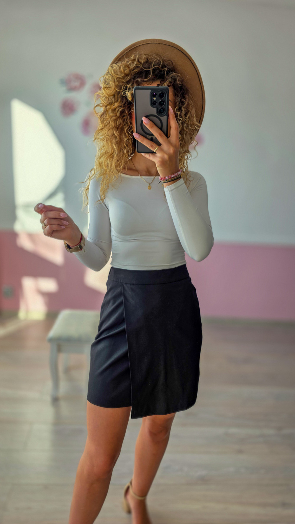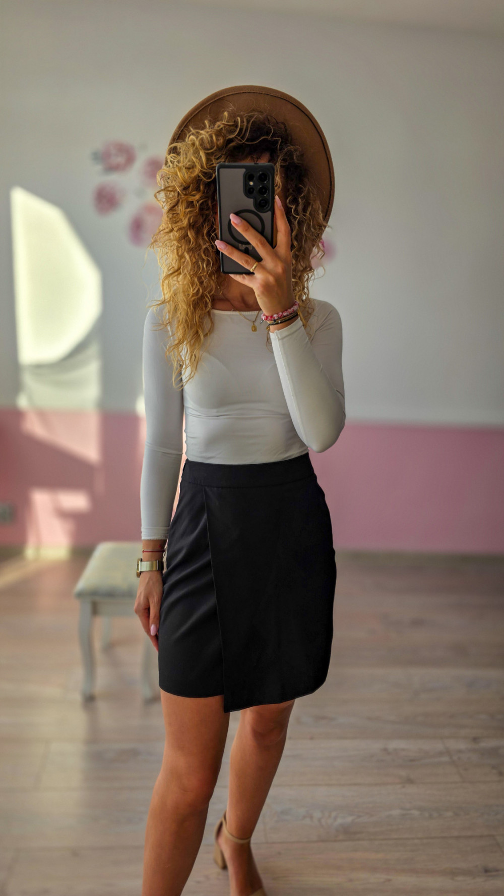 Czarna spódniczka mini z elegancką zakładką to ponadczasowy element garderoby, który sprawdzi się w stylizacjach casualowych, biznesowych i wieczorowych. Minimalistyczny krój wysmukla nogi, a miękki materiał gwarantuje wygodę noszenia przez cały dzień. Uniwersalny czarny kolor pozwala łączyć ją z każdym topem, koszulą czy swetrem, co czyni ją wyjątkowo praktyczną bazą stylizacyjną. Świetna na co dzień, do biura, ale i na kolację czy wyjście z przyjaciółmi.