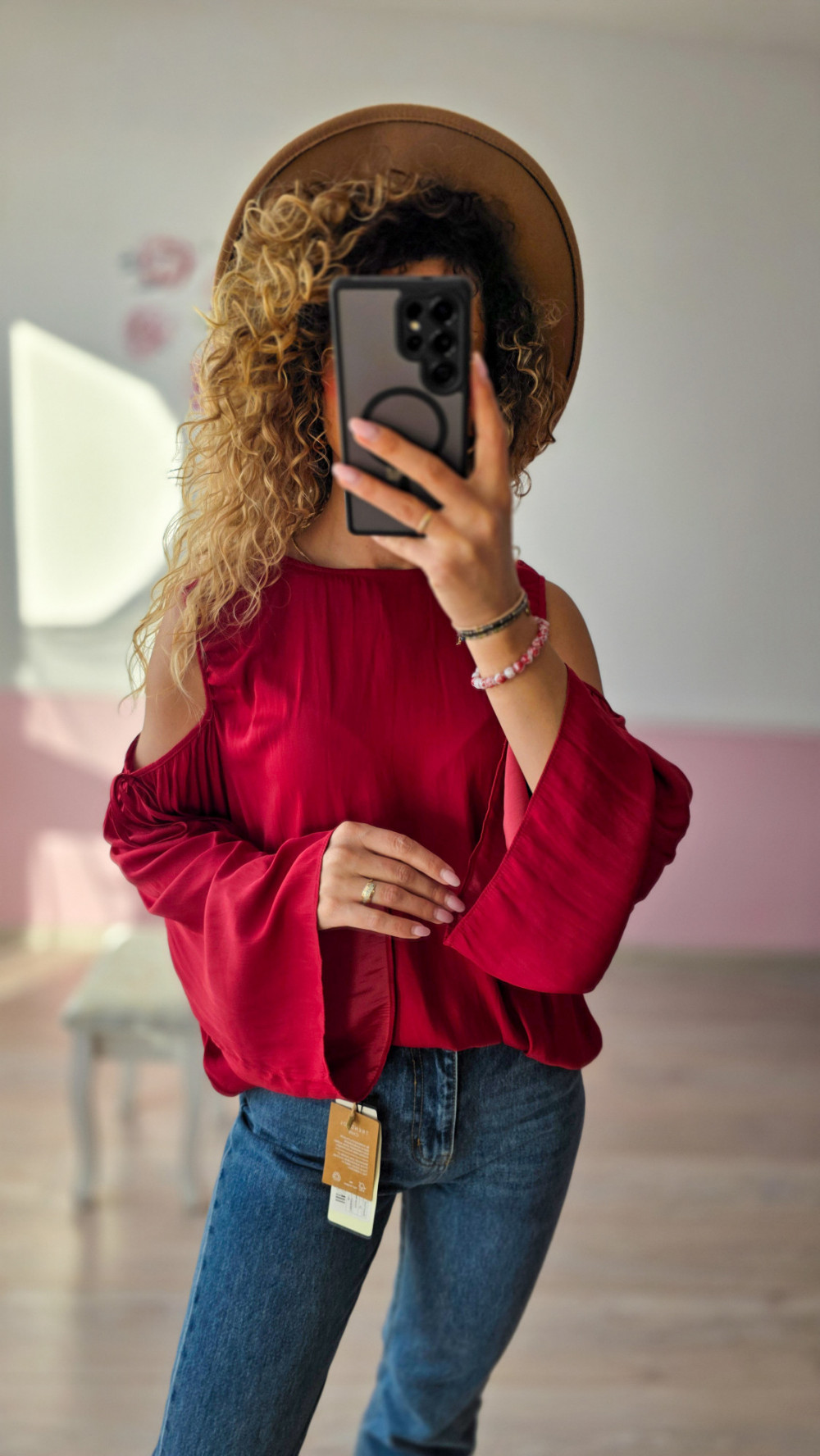 Elegancka czerwona bluzka z odkrytymi ramionami to idealna propozycja dla kobiet, które kochają efektowne, kobiece stylizacje. Model posiada szerokie, zwiewne rękawy oraz dekoracyjne rozcięcia, nadające mu wyjątkowej lekkości i nowoczesnego charakteru. Intensywny czerwony kolor pięknie podkreśla urodę i świetnie sprawdzi się na randkę, imprezę, rodzinne uroczystości czy wieczorne wyjścia. Bluzka świetnie prezentuje się zarówno z jeansami, jak i eleganckimi spodniami lub spódnicą. To stylowy, modny top dla kobiet ceniących wygodę, elegancję i oryginalny design.
