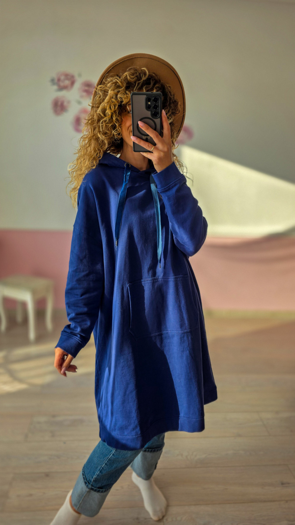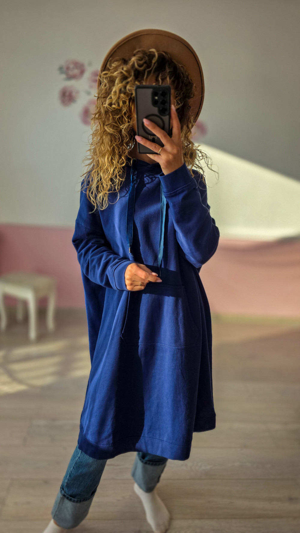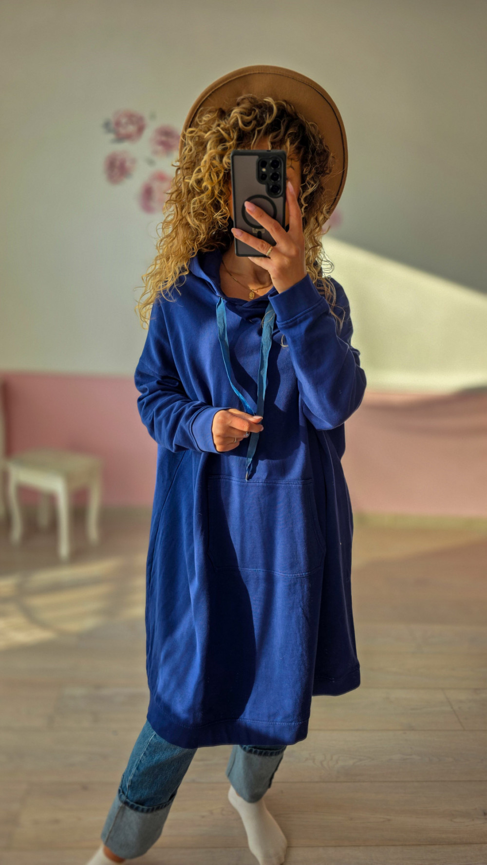 Długa, oversize’owa bluza damska w intensywnym niebieskim kolorze to idealna propozycja dla kobiet ceniących wygodę i swobodny styl. Model posiada obszerny kaptur z regulowanymi troczkami oraz dużą kieszeń typu kangurka, która dodaje sportowego charakteru. Wydłużony fason zapewnia komfort i świetnie wygląda zarówno z jeansami, jak i legginsami. Bluza sprawdzi się na spacer, podróż, do pracy zdalnej czy codziennych, casualowych stylizacji.