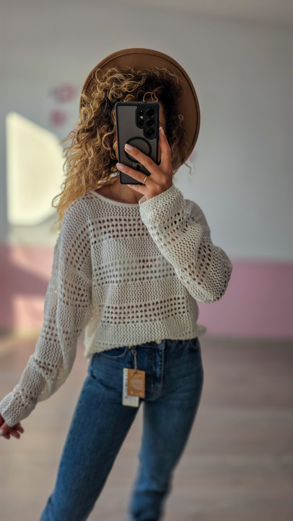 Kremowy sweter ażurowy w stylu boho