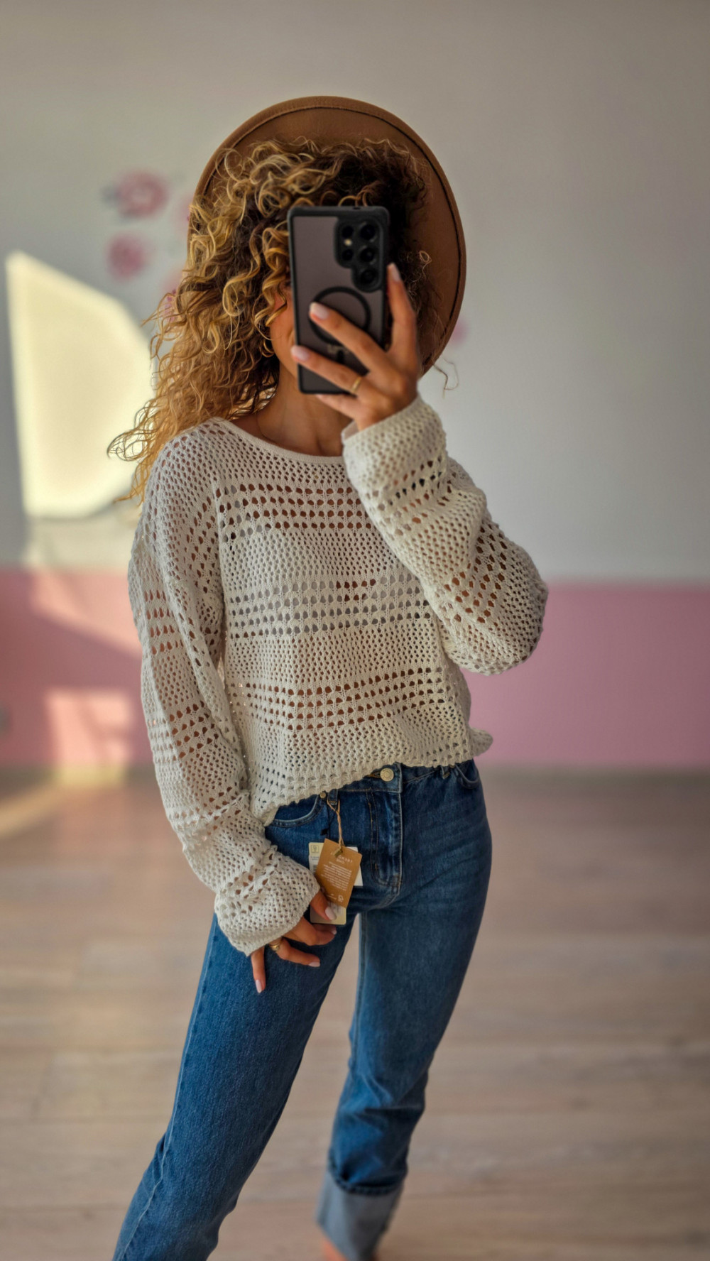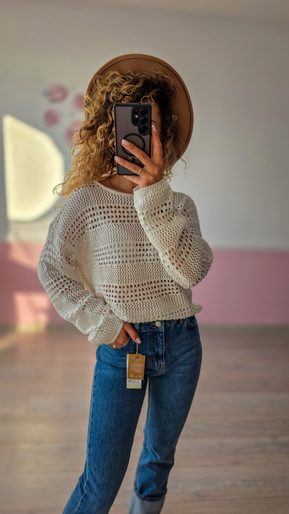 Ten sweter wykonany jest z delikatnej, ażurowej dzianiny w kremowym odcieniu, dzięki czemu prezentuje się niezwykle lekko i romantycznie. Luźny krój i nieco krótsza długość sprawiają, że świetnie wygląda w połączeniu z wysokimi spodniami lub spódnicą. Ażurowy splot dodaje boho charakteru i pozwala na noszenie swetra jako narzutki na top lub sukienkę. Idealny na cieplejsze dni, wakacyjne wypady oraz do tworzenia warstwowych stylizacji.