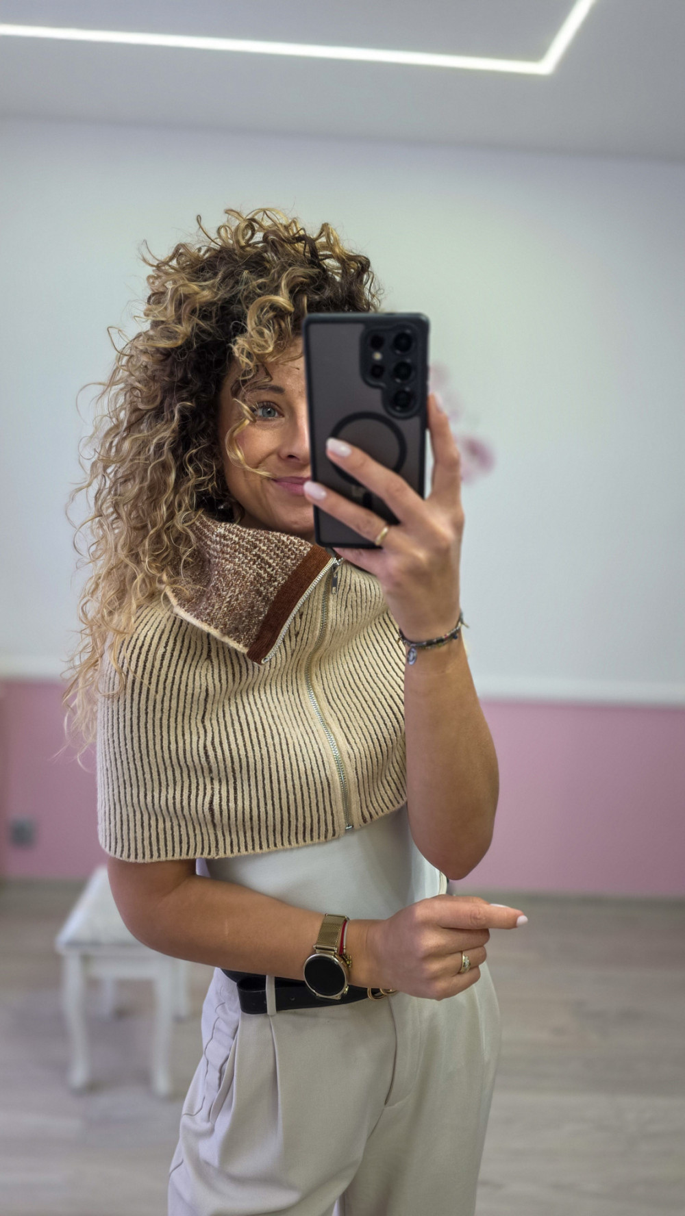 Model ma formę krótkiej narzutki/ocieplacza – otula ramiona, nadając stylizacji elegancji i nowoczesnego charakteru. Dzięki praktycznemu zamkowi z przodu możesz nosić go na wiele sposobów: rozpięty, częściowo zapięty lub całkowicie zasunięty, tworząc efekt stójki.