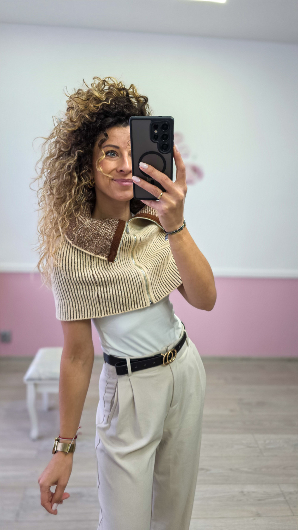 Ciepła beżowo-brązowa kolorystyka oraz subtelny prążkowany splot sprawiają, że kołnierz pasuje do płaszczy, kurtek i gładkich bluzek. To idealny wybór dla kobiet, które lubią wyjątkowe, niebanalne dodatki.