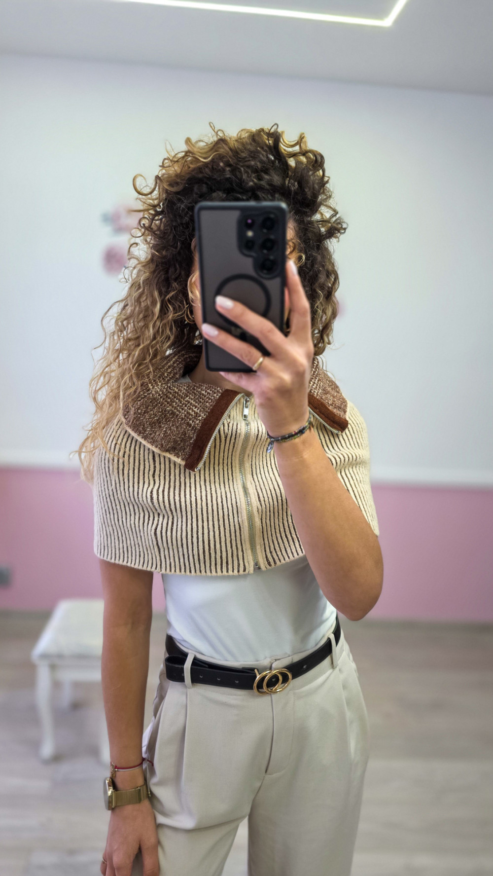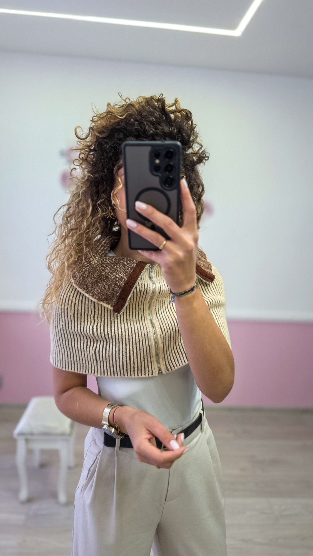 Beżowo-brązowy dzianinowy kołnierz z zamkiem to wyjątkowy dodatek, który łączy praktyczność z modnym designem. Wykonany z miękkiej, przytulnej dzianiny, świetnie układa się na ramionach i stanowi idealne uzupełnienie jesiennych, zimowych oraz wiosennych stylizacji.