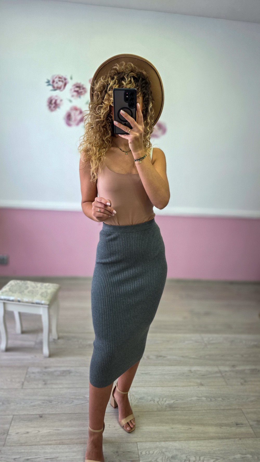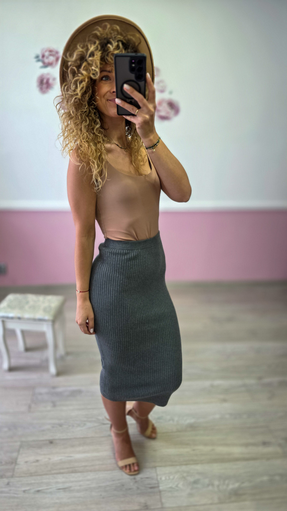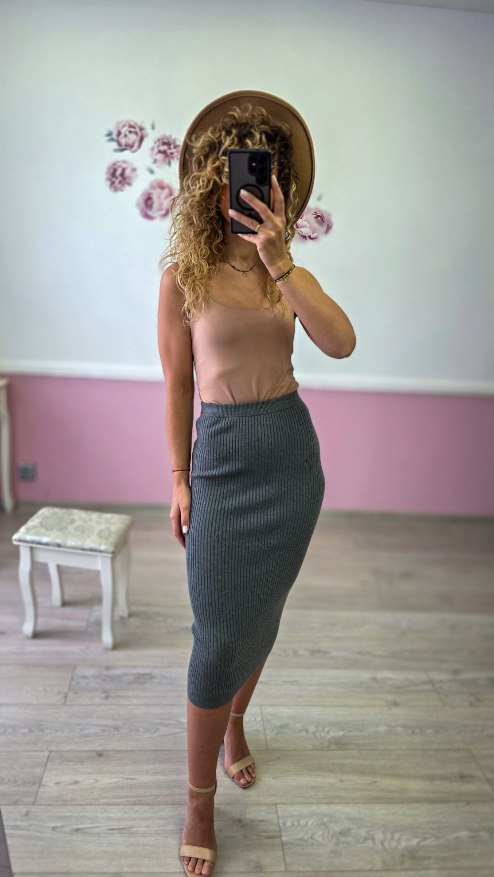 Dzianinowa spódnica ołówkowa midi grafitowa – prążkowana, elastyczna, kobieca