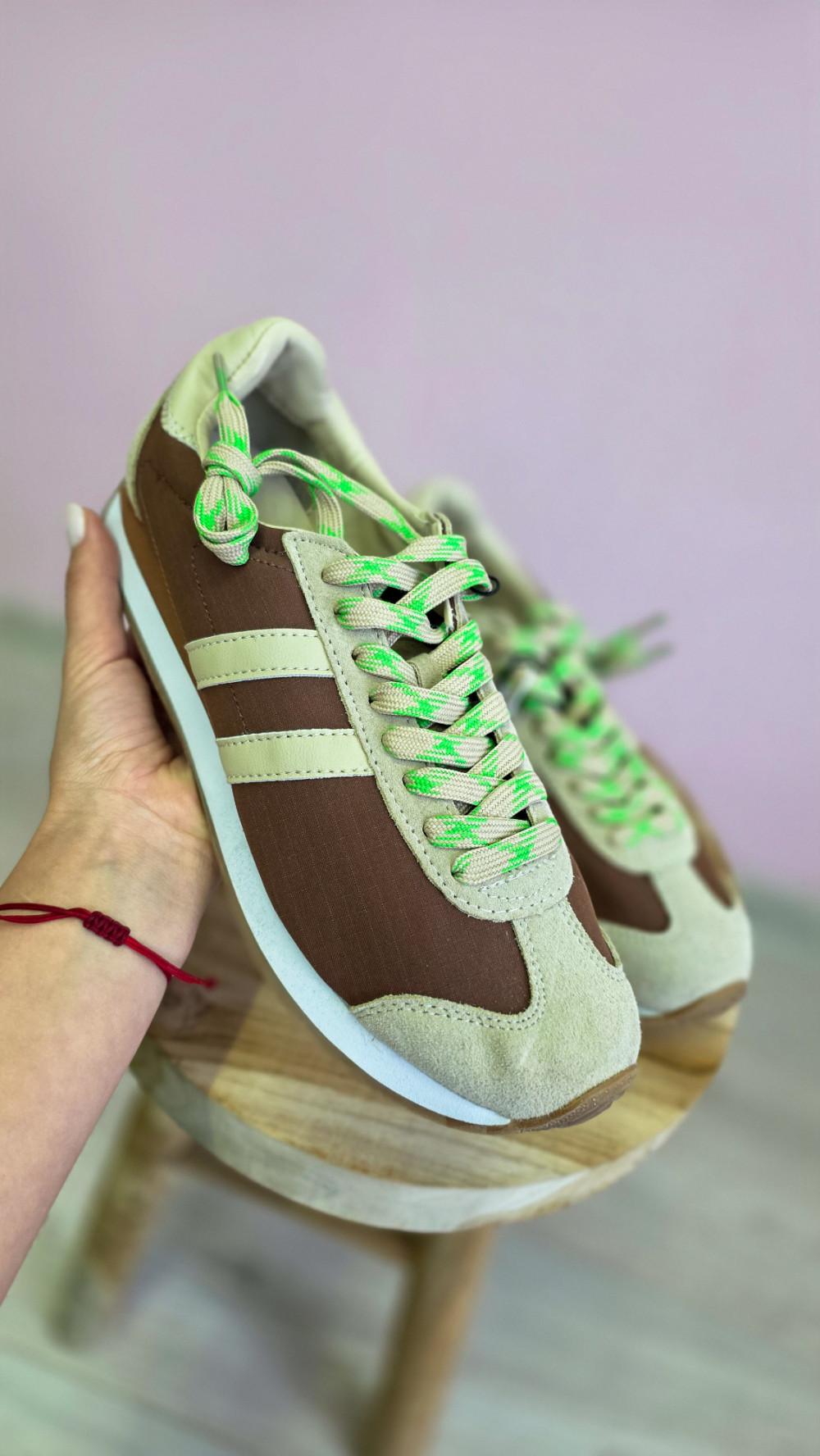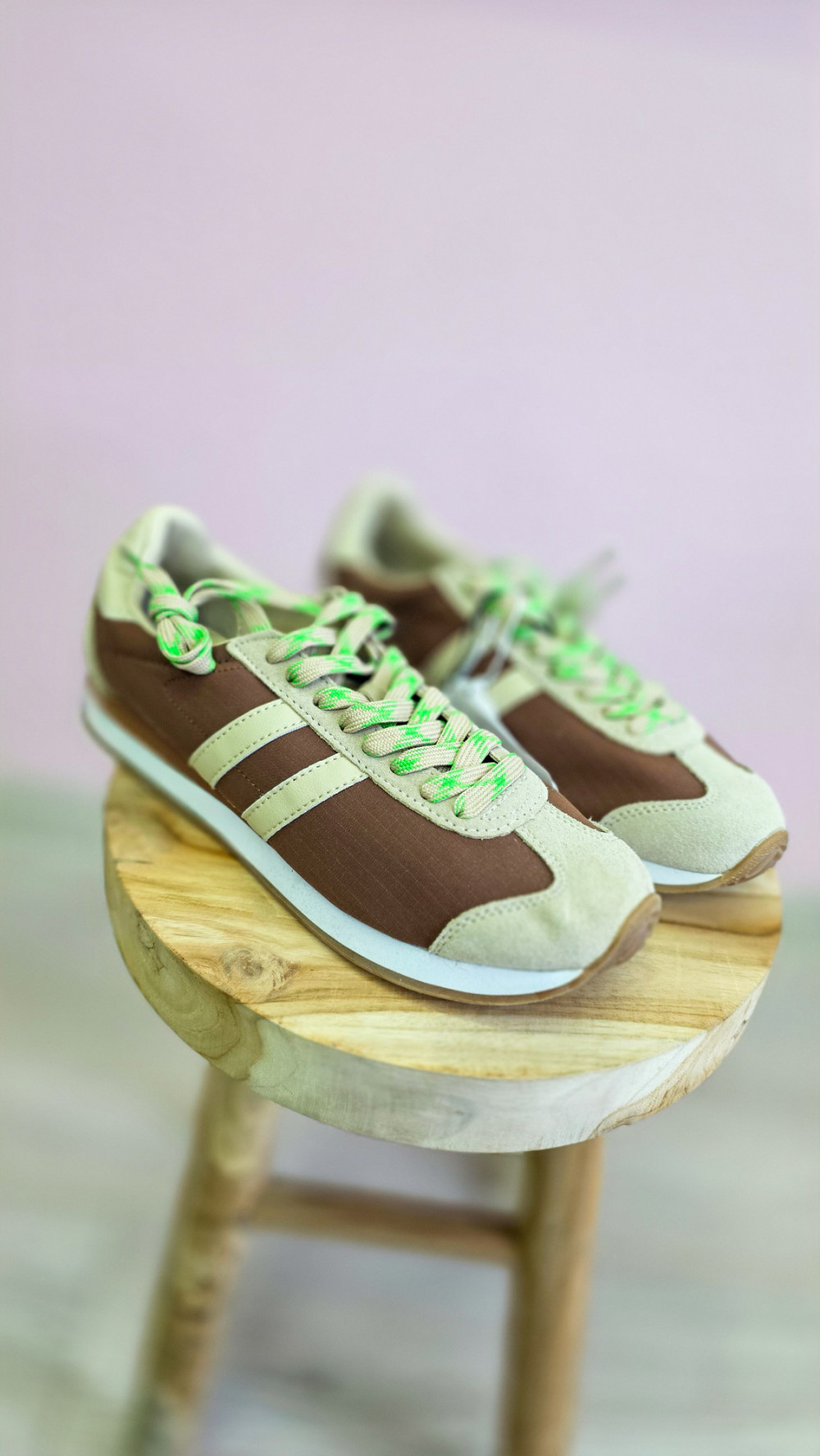 Męskie beżowo-brązowe sneakersy retro z neonowymi sznurówkami – lekkie i wygodne