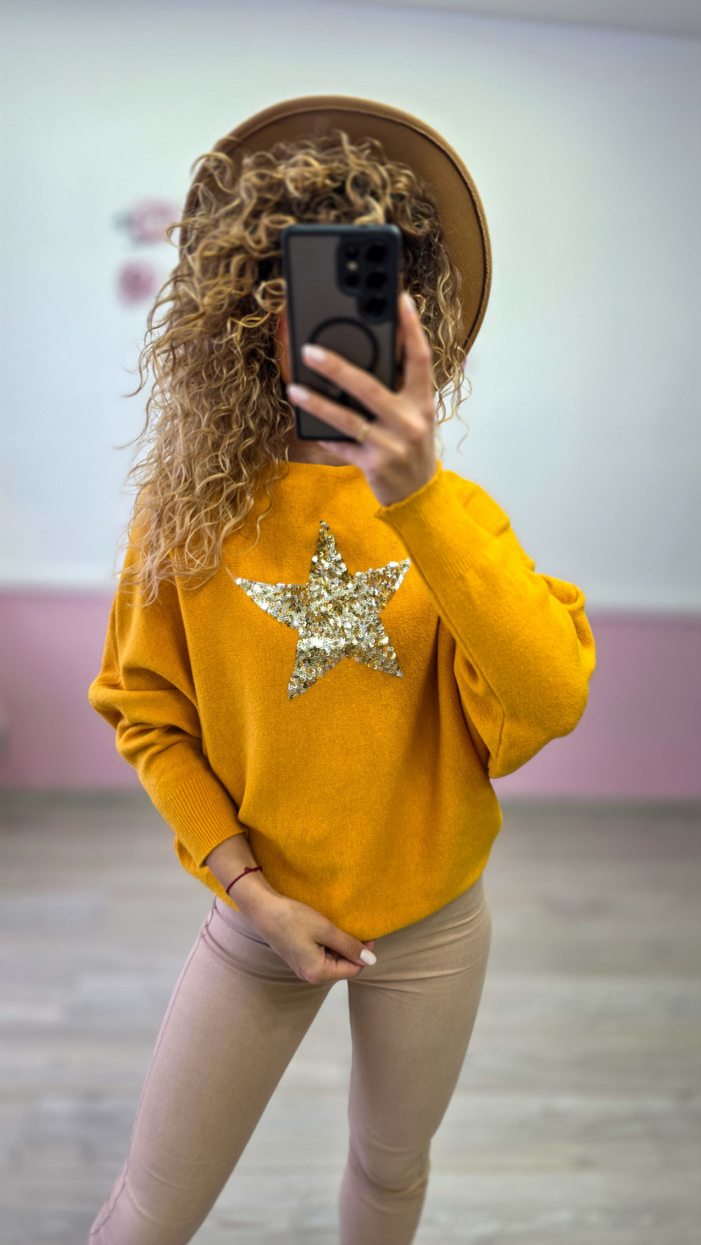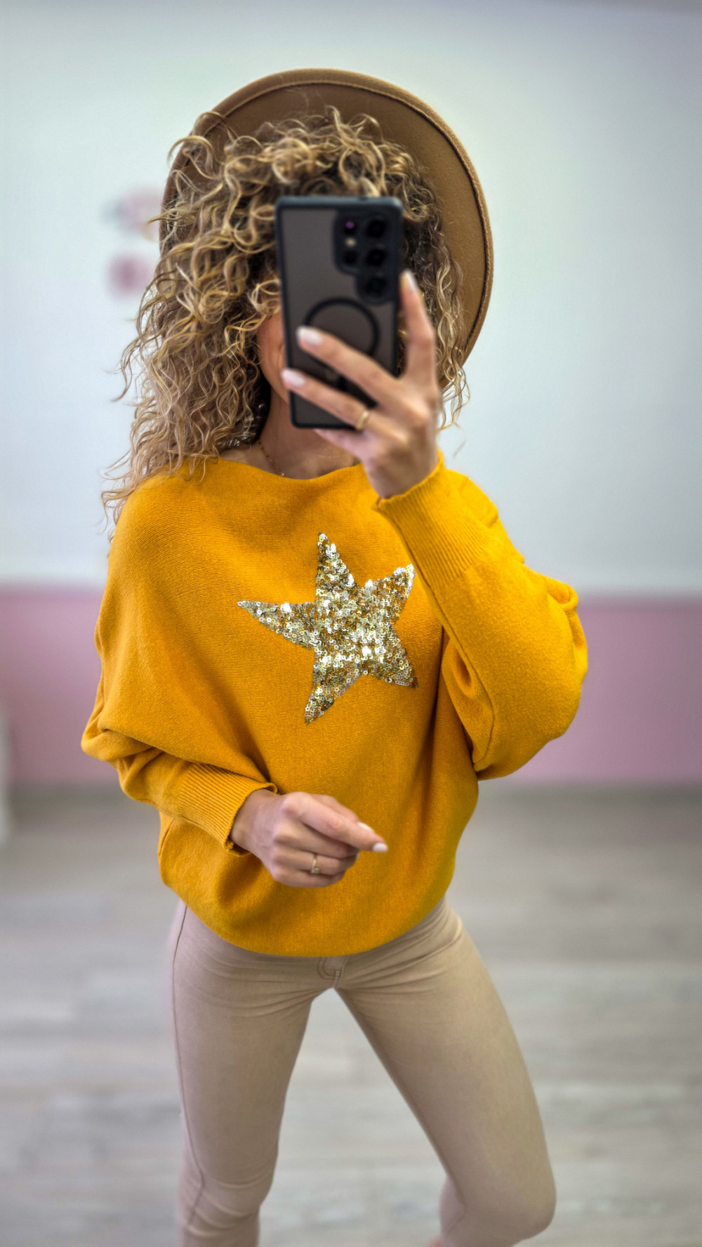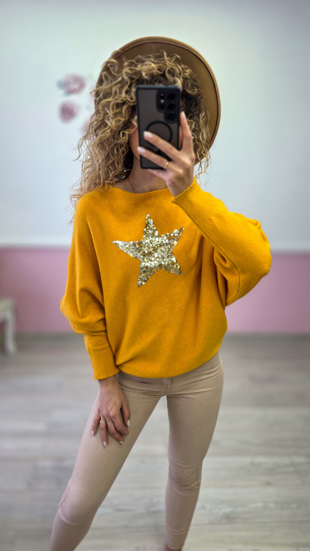Musztardowy sweter z cekinową gwiazdą