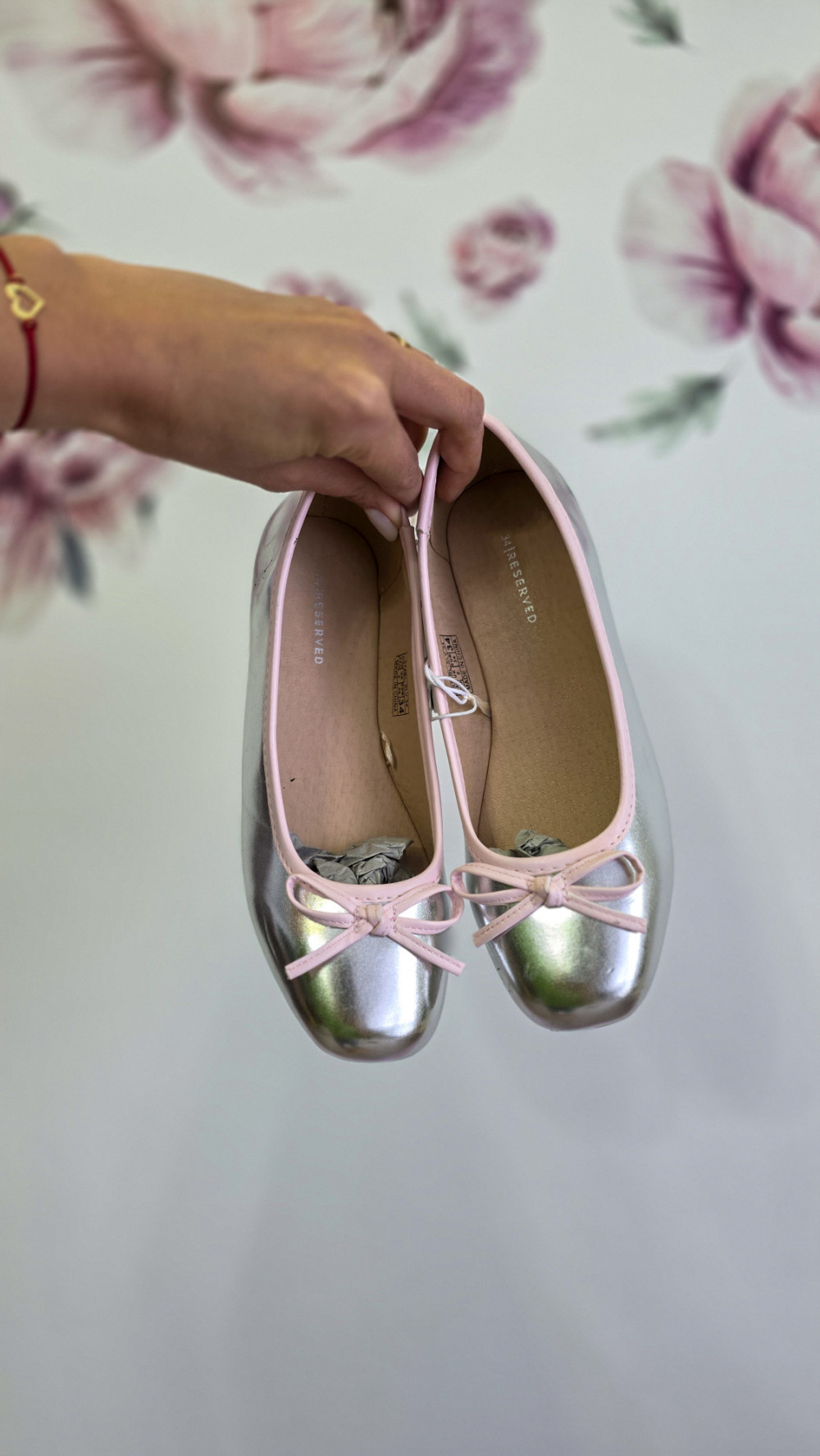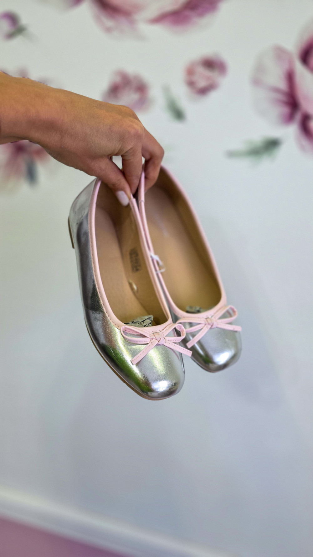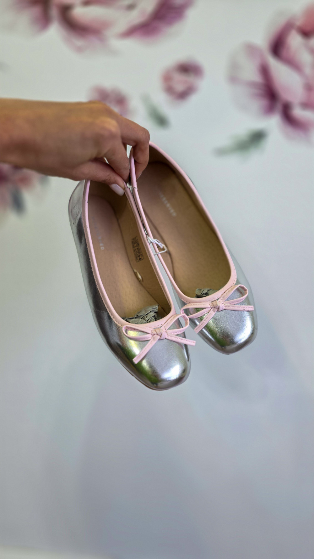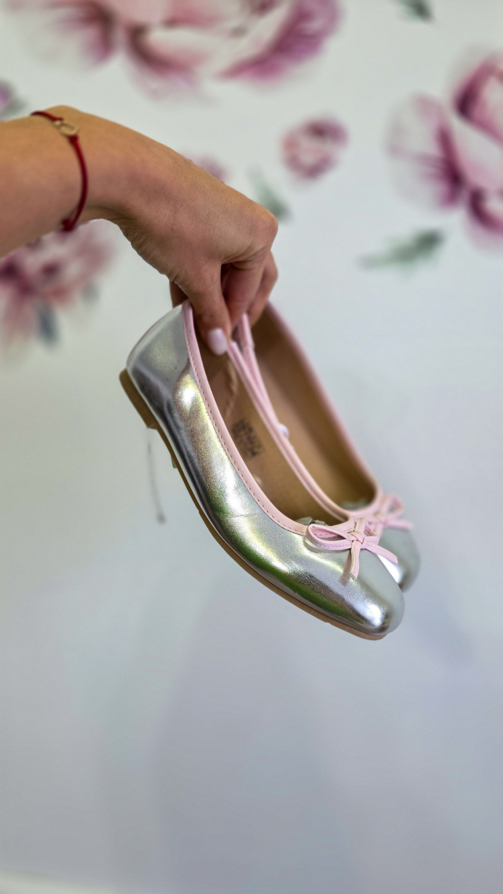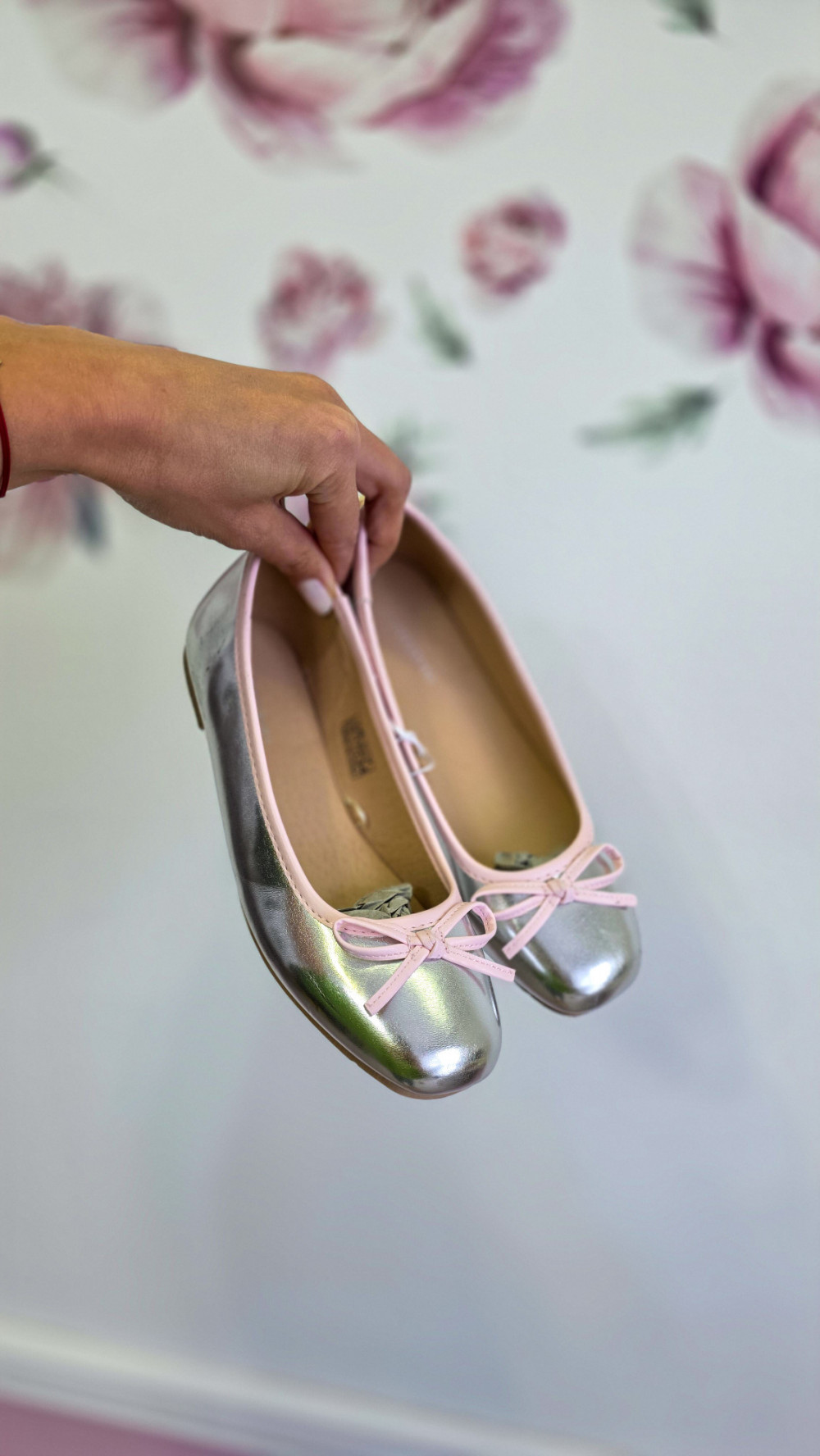 Srebrne baleriny z delikatną różową kokardką to idealny model dla dziewczynek i kobiet, które kochają połączenie elegancji i subtelnej słodyczy. Metaliczny połysk pięknie odbija światło i dodaje butom wyjątkowego uroku, a różowe wykończenia nadają im dziewczęcego charakteru. Miękka wkładka i lekka konstrukcja sprawiają, że baleriny są bardzo wygodne w noszeniu — świetnie sprawdzą się do sukienek, spódnic oraz codziennych stylizacji. To idealny wybór na ważne okazje, rodzinne uroczystości, sesje zdjęciowe, jak i na co dzień dla małych i dużych miłośniczek stylu.
