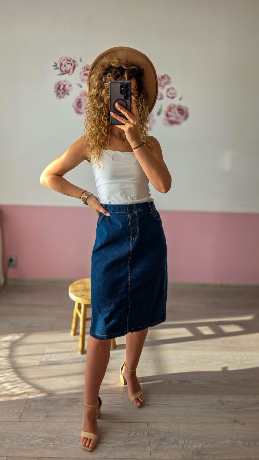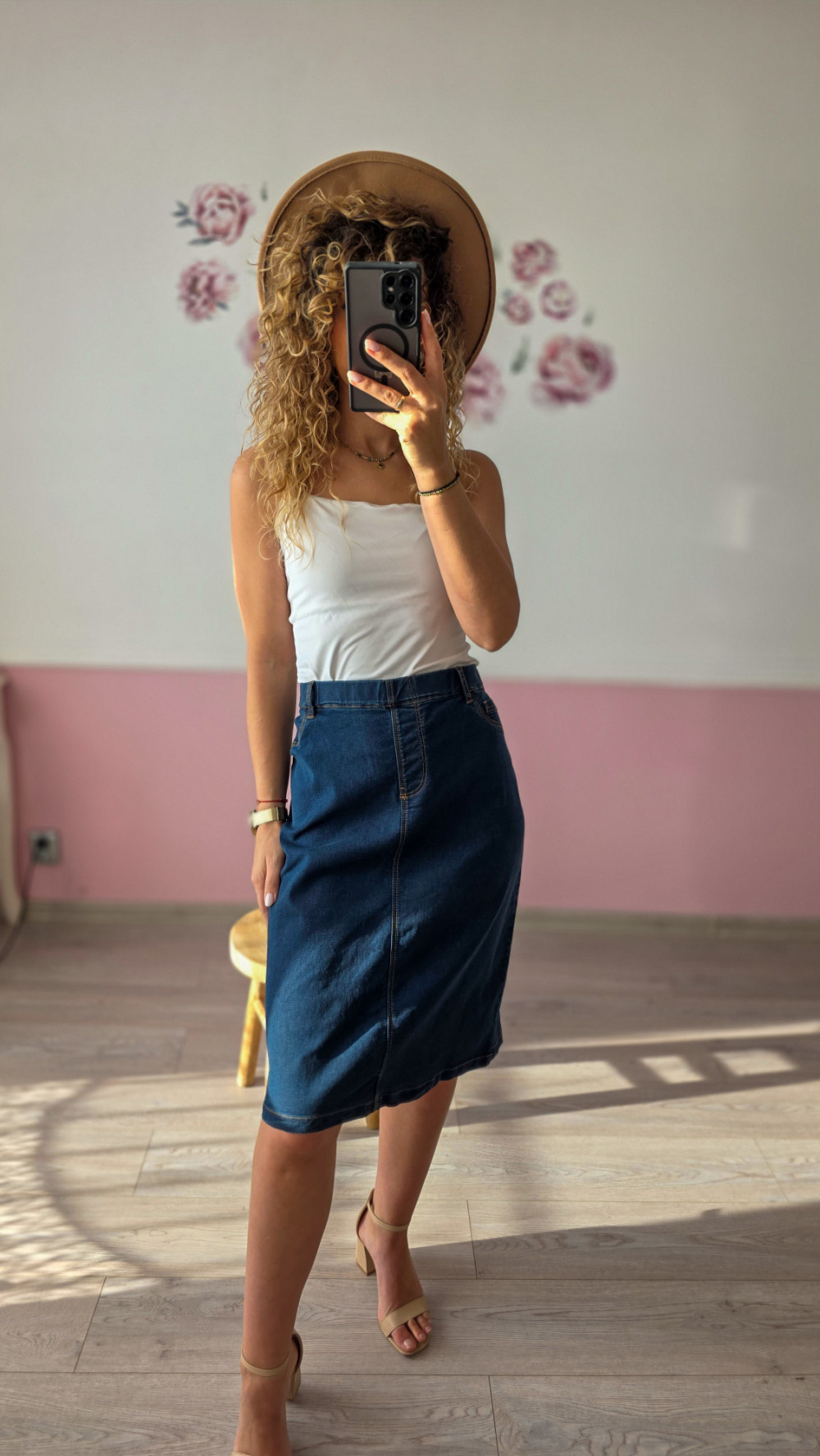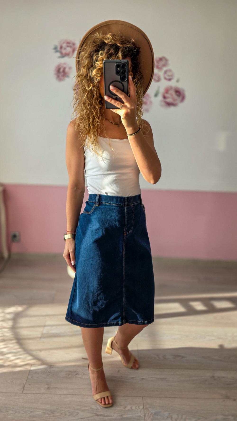Ciemna spódnica jeansowa midi z wysokim stanem – klasyczna, wygodna i ponadczasowa denimowa spódnica