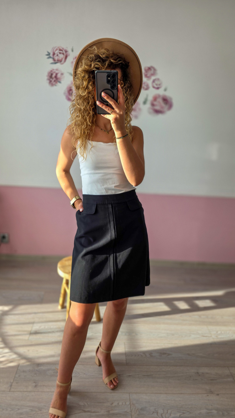 Elegancka czarna spódnica ołówkowa, która łączy klasykę z nowoczesną formą. Wysoki stan pięknie podkreśla sylwetkę, a ozdobne klapki przy kieszeniach dodają jej charakteru i wyjątkowego stylu.