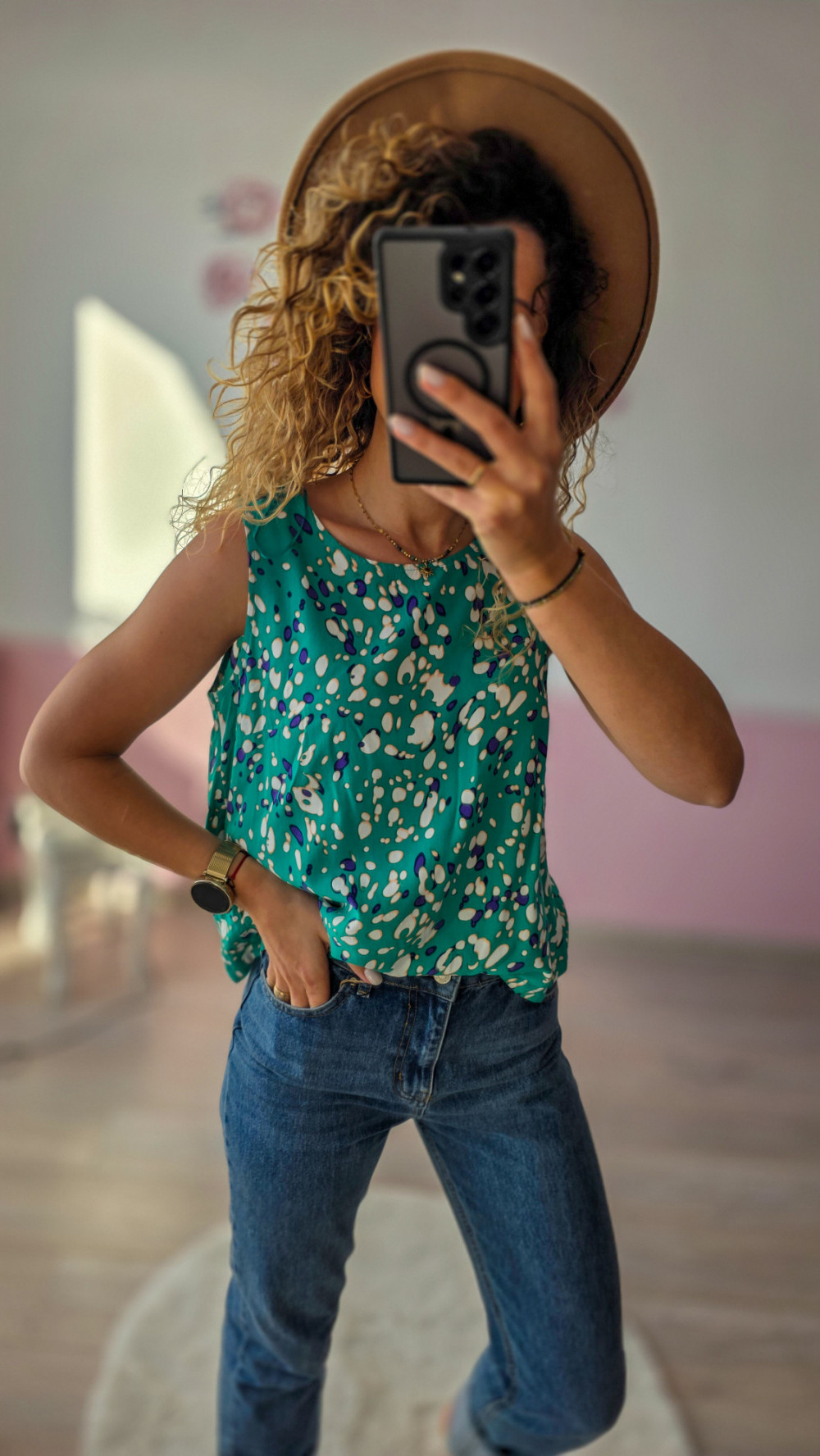 Zielony top damski bez rękawów z abstrakcyjnym wzorem – lekka letnia bluzka