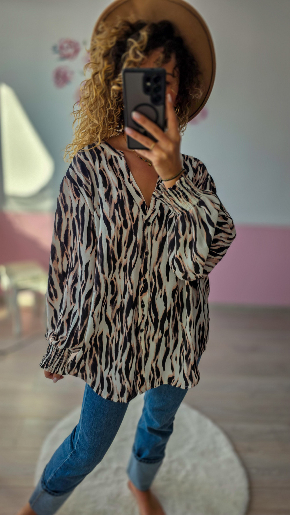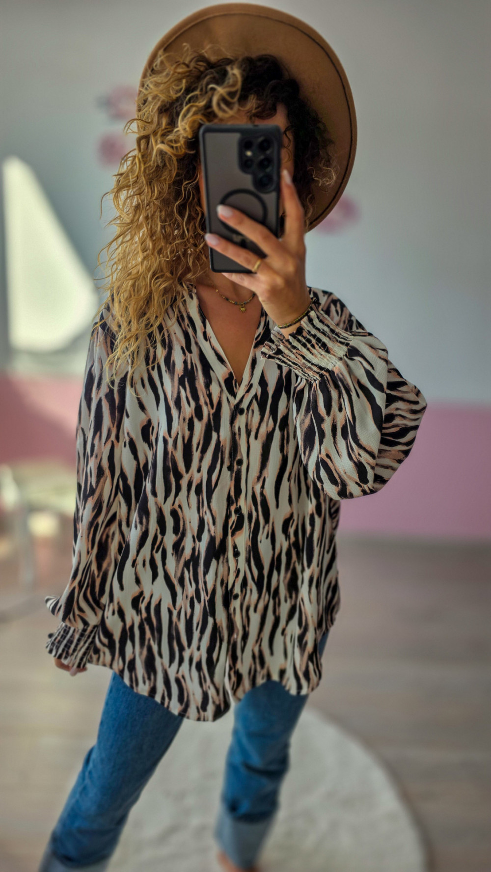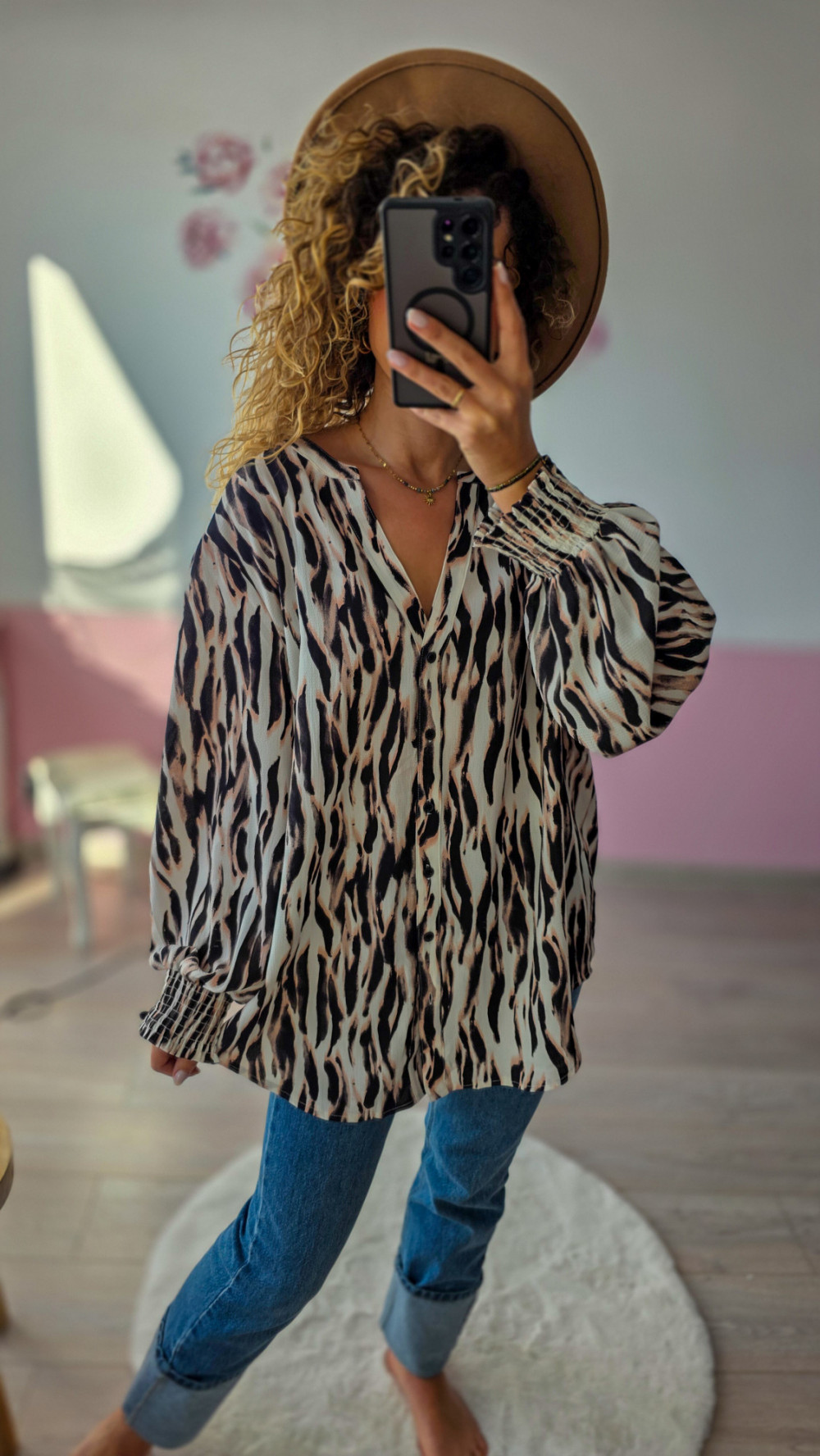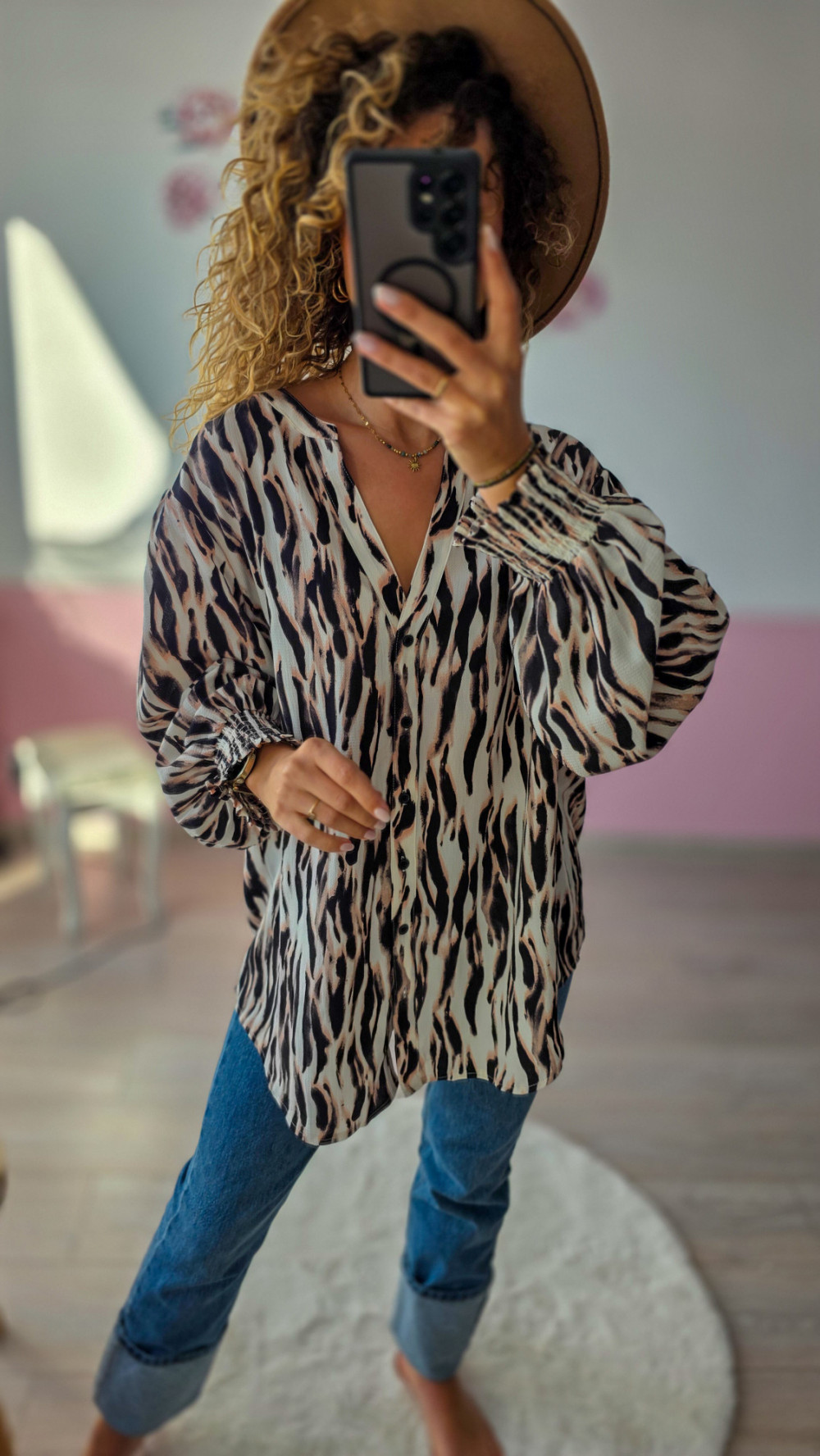 Stylowa bluzka oversize w zwierzęcy print to idealny wybór dla kobiet, które kochają modę i wygodę. Lekka, przewiewna tkanina pięknie układa się na sylwetce, a luźny krój zapewnia pełen komfort noszenia. Świetnie sprawdzi się zarówno do jeansów, jak i eleganckich spodni. Idealna na co dzień i do pracy.