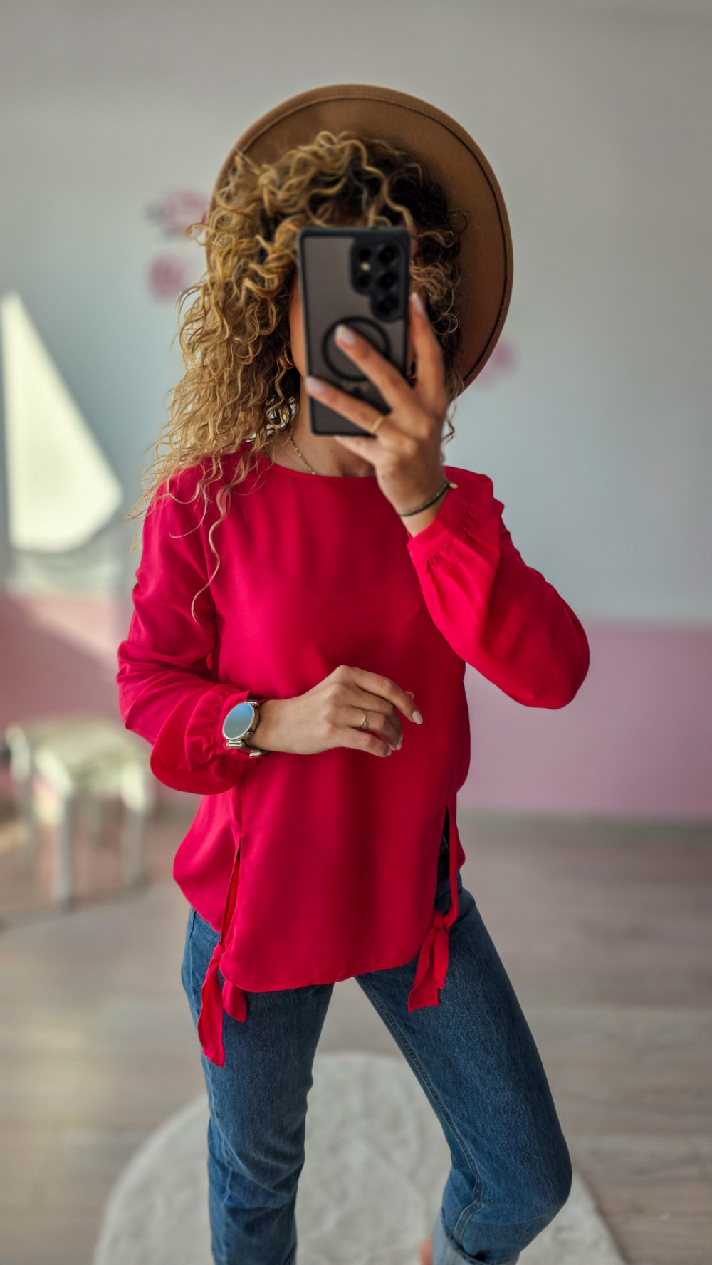 Elegancka fuksjowa bluzka z ozdobnymi wiązaniami to propozycja dla kobiet, które chcą dodać koloru swoim stylizacjom. Model z rozcięciami po bokach i delikatnie bufowanym rękawem prezentuje się wyjątkowo kobieco. Rewelacyjna do stylizacji casual oraz smart casual.