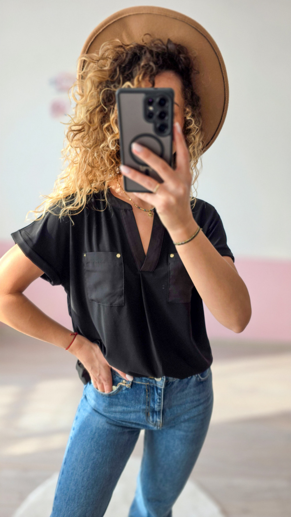 Czarna bluzka z dekoltem V i kieszonkami – klasyka na co dzień