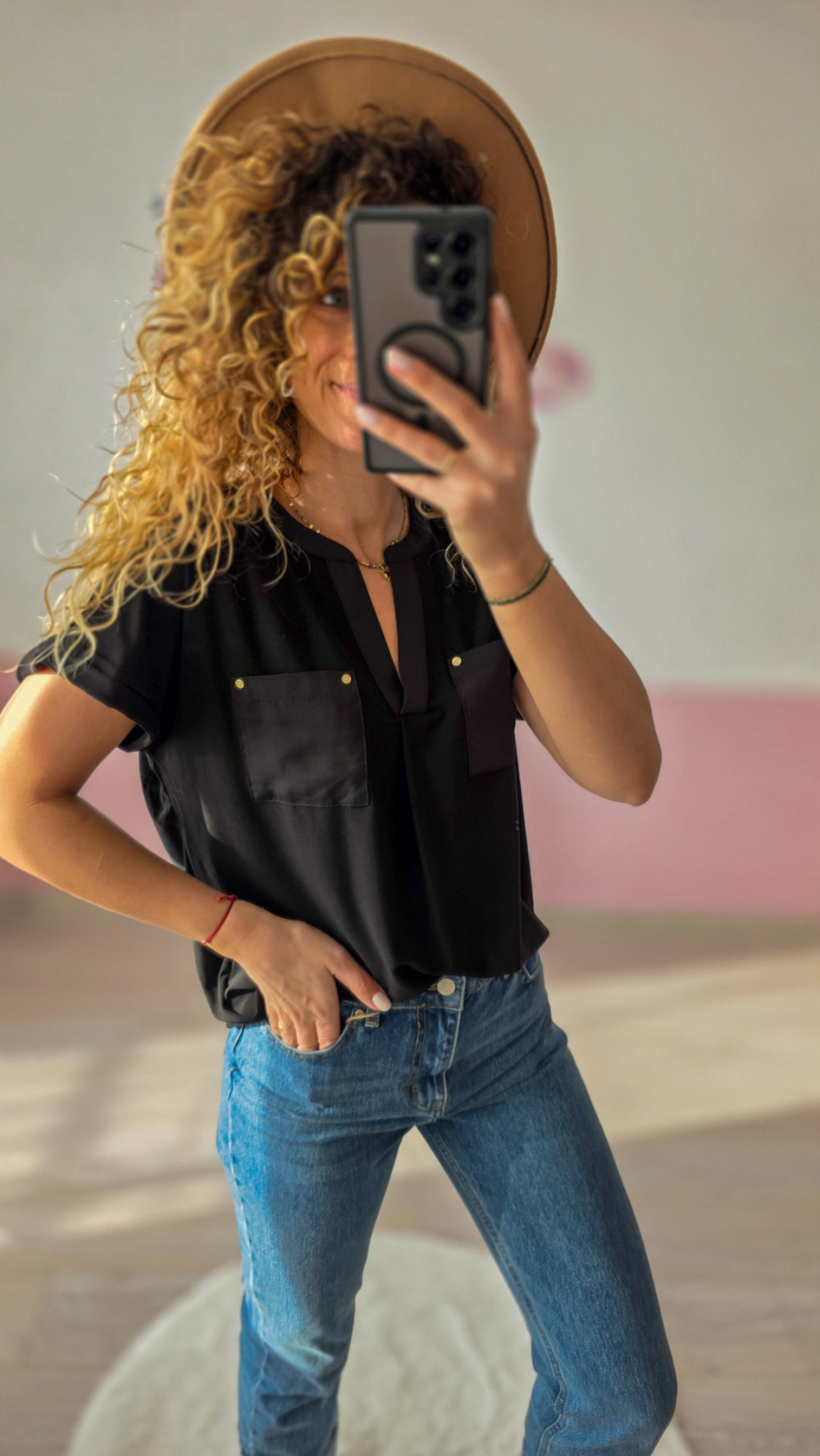 Ta czarna bluzka o prostym, eleganckim kroju to must-have w garderobie każdej kobiety. Wykonana z lekkiej, przyjemnej tkaniny, zapewnia komfort i przewiewność. Dekolt w kształcie litery V wysmukla szyję, a dwie ozdobne kieszonki z delikatnymi złotymi guzikami dodają jej nowoczesnego charakteru. Luźny fason pięknie się układa, tworząc efekt lekkości i swobody. Idealna do biura, na spotkania oraz na codzienne wyjścia. Pasuje zarówno do spodni materiałowych, jak i ulubionych jeansów.