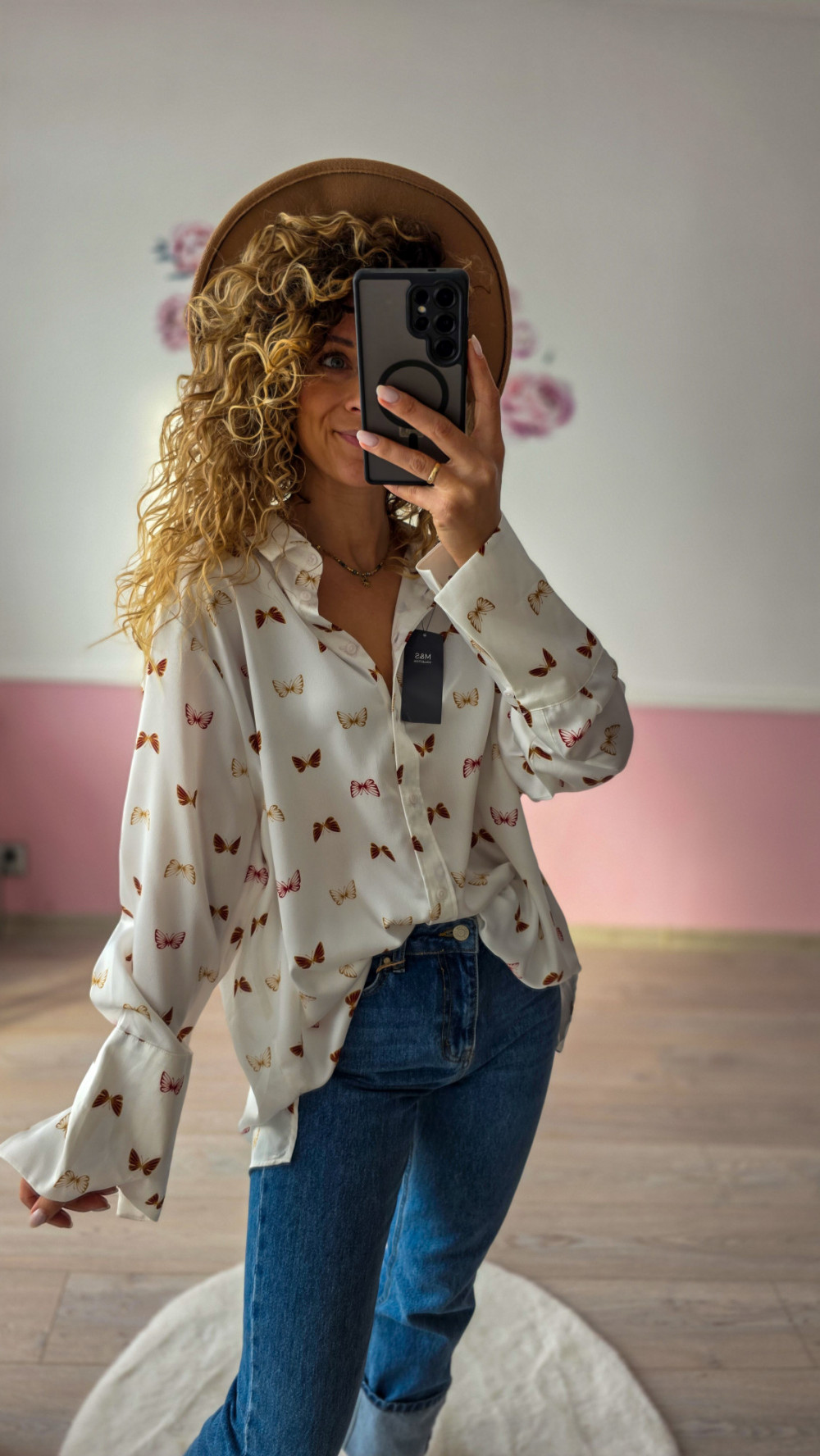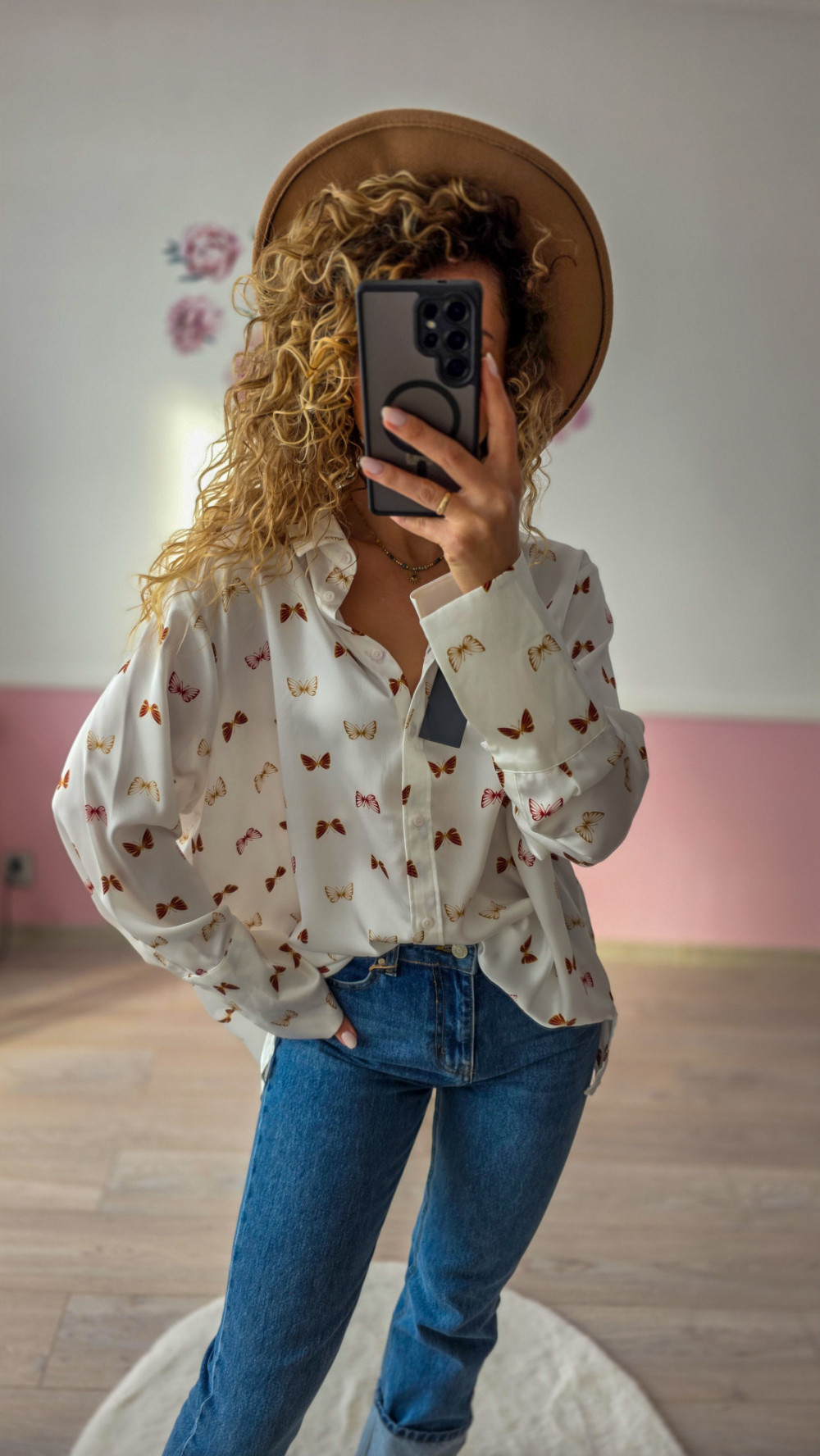 Damska koszula oversize z motylami – biała elegancka koszula z wzorem, lekka i wygodna
