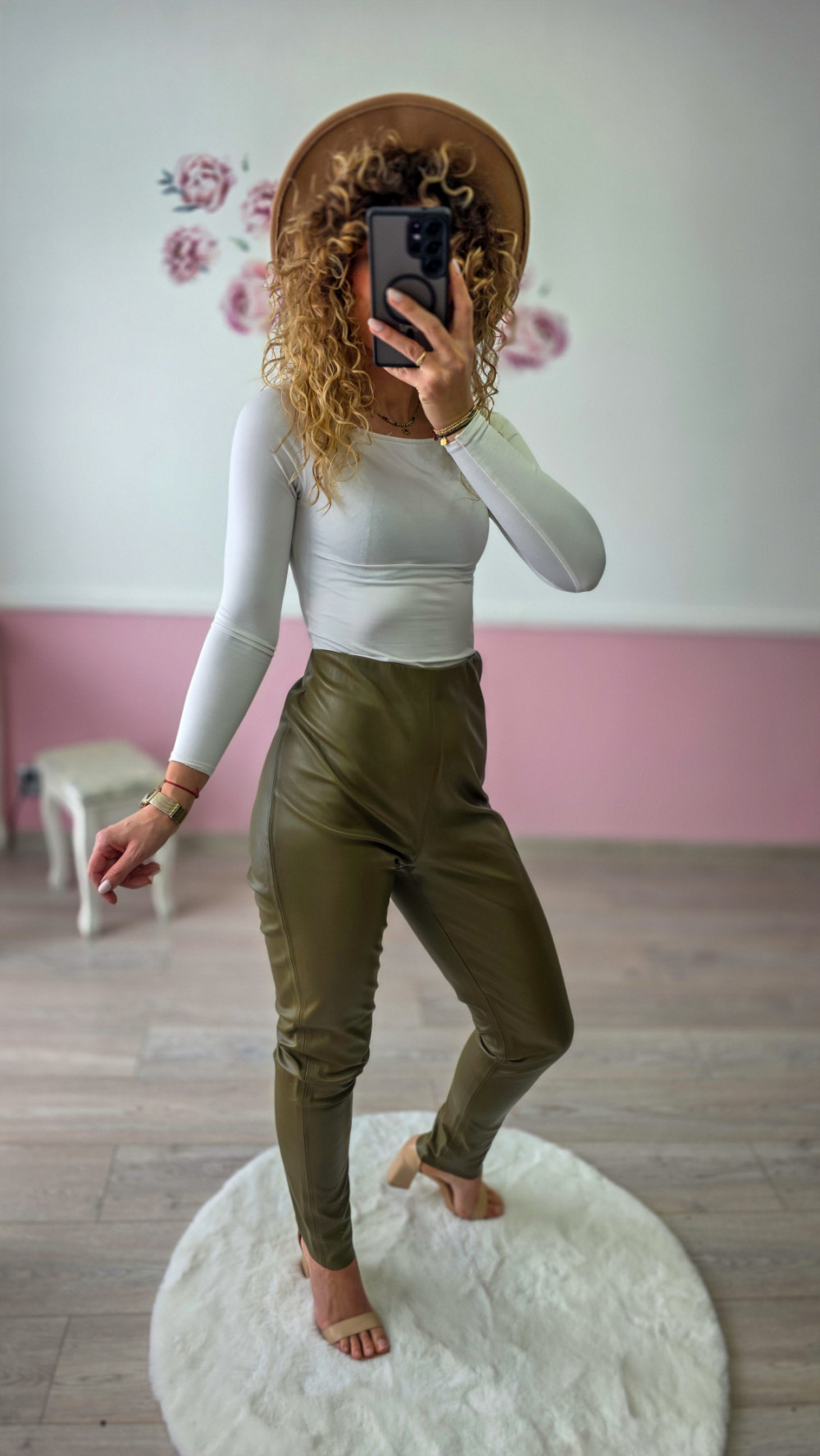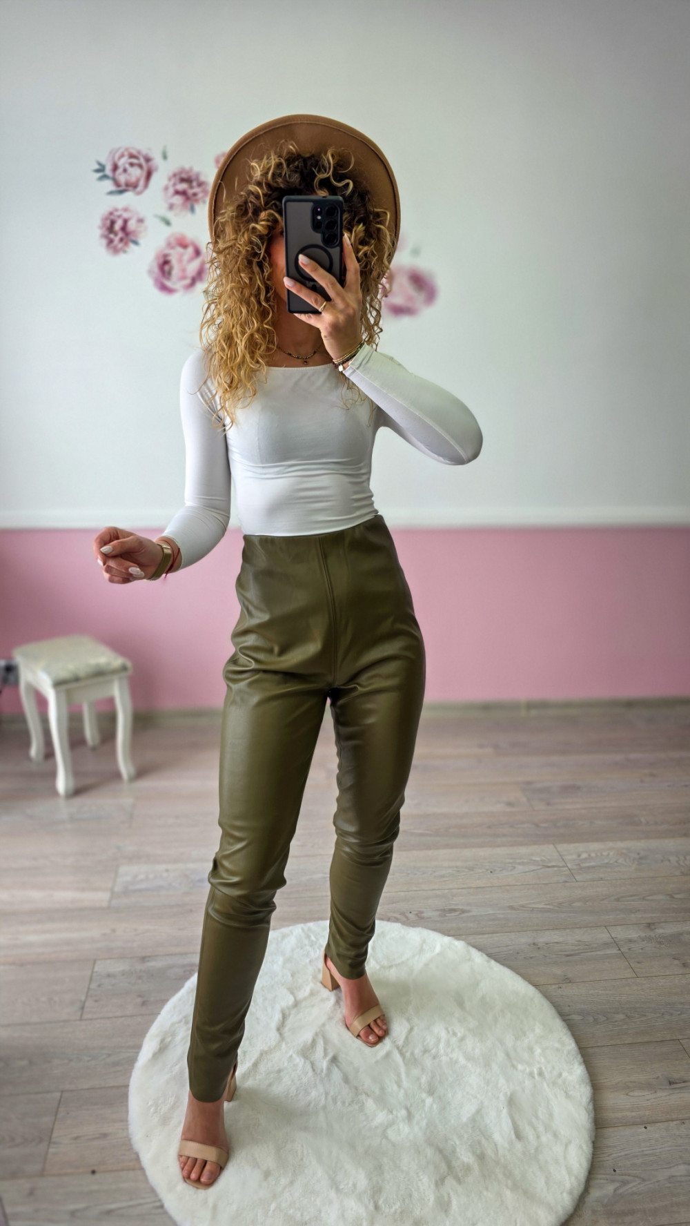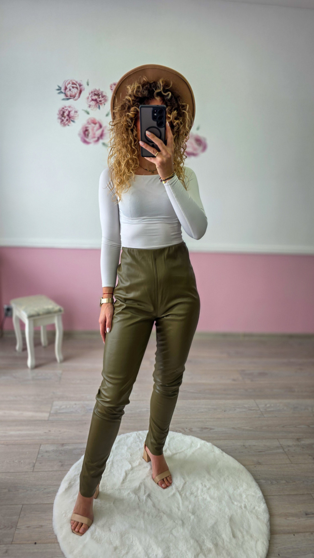 Oliwkowe spodnie z ekoskóry z wysokim stanem – dopasowane spodnie damskie