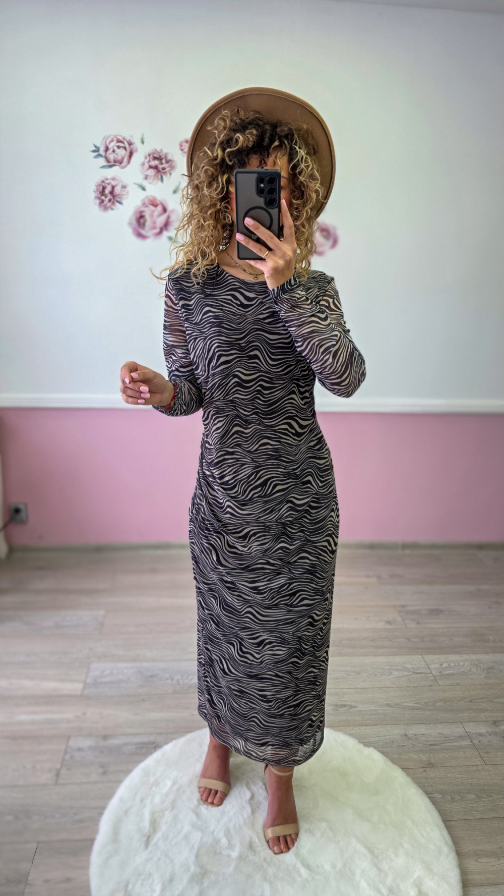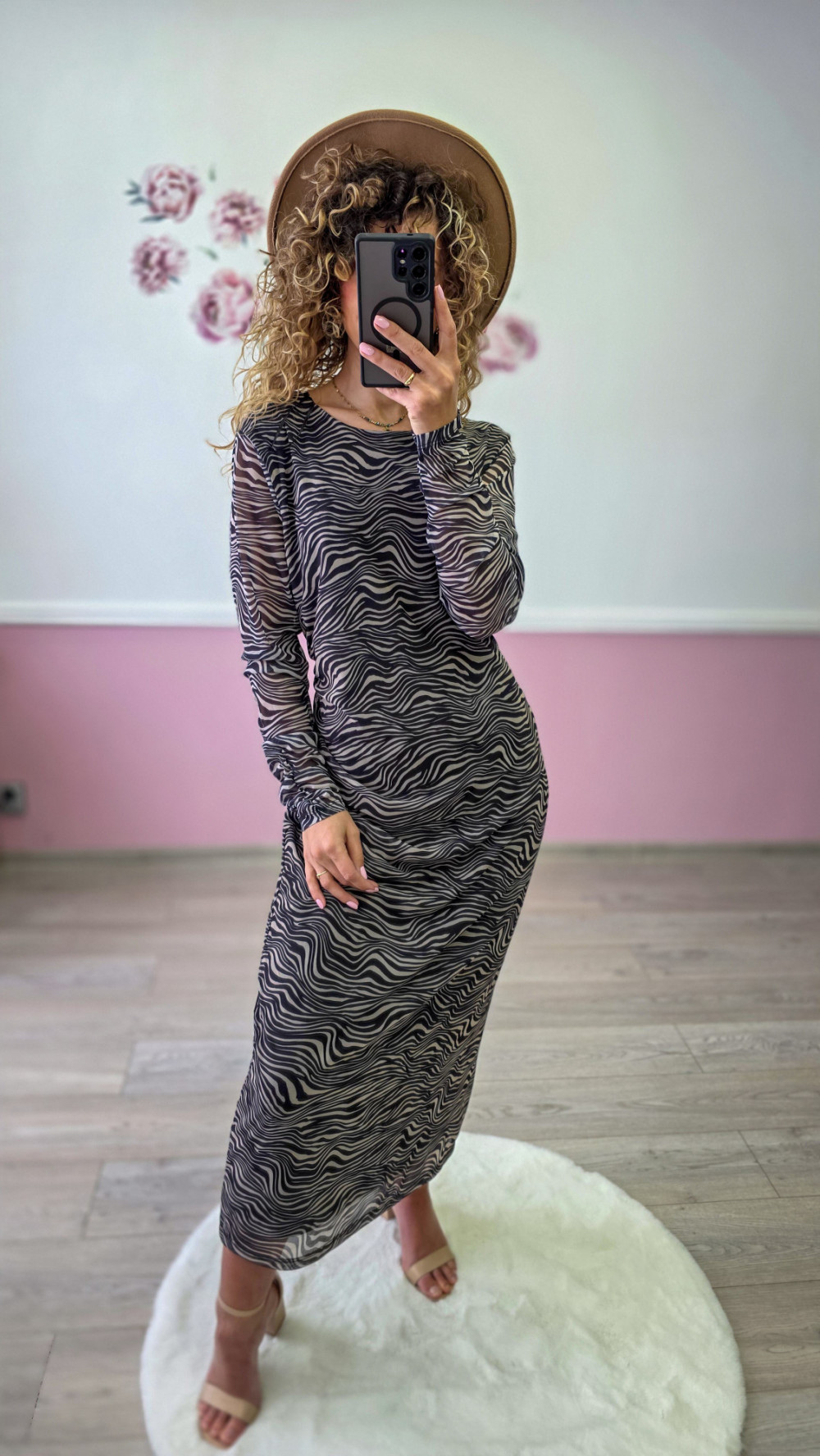 Sukienka maxi w zwierzęcy wzór – dopasowana sukienka z długim rękawem