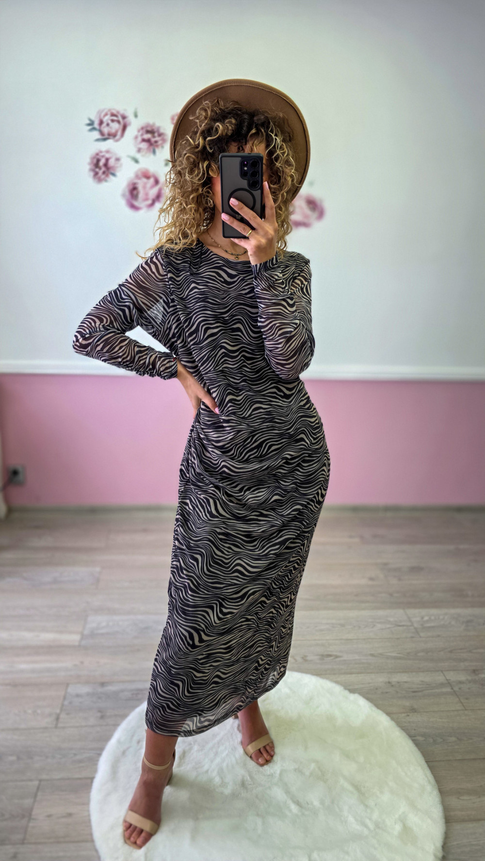 Efektowny print inspirowany motywem zebra w odcieniach beżu i czerni przyciąga uwagę i nadaje stylizacji modowego charakteru. Długi rękaw oraz zabudowany dekolt równoważą wyrazisty wzór, tworząc harmonijną i stylową całość.