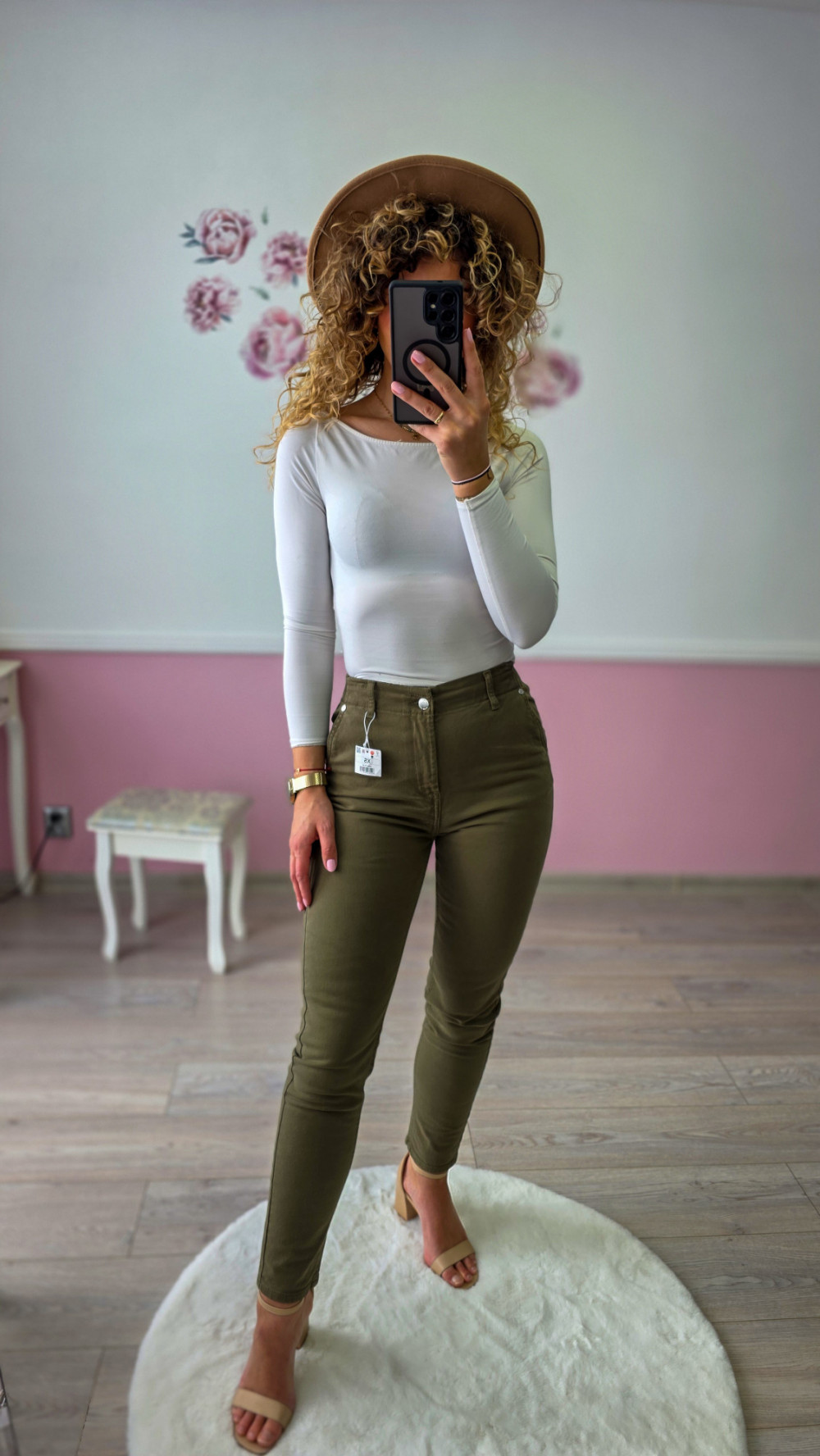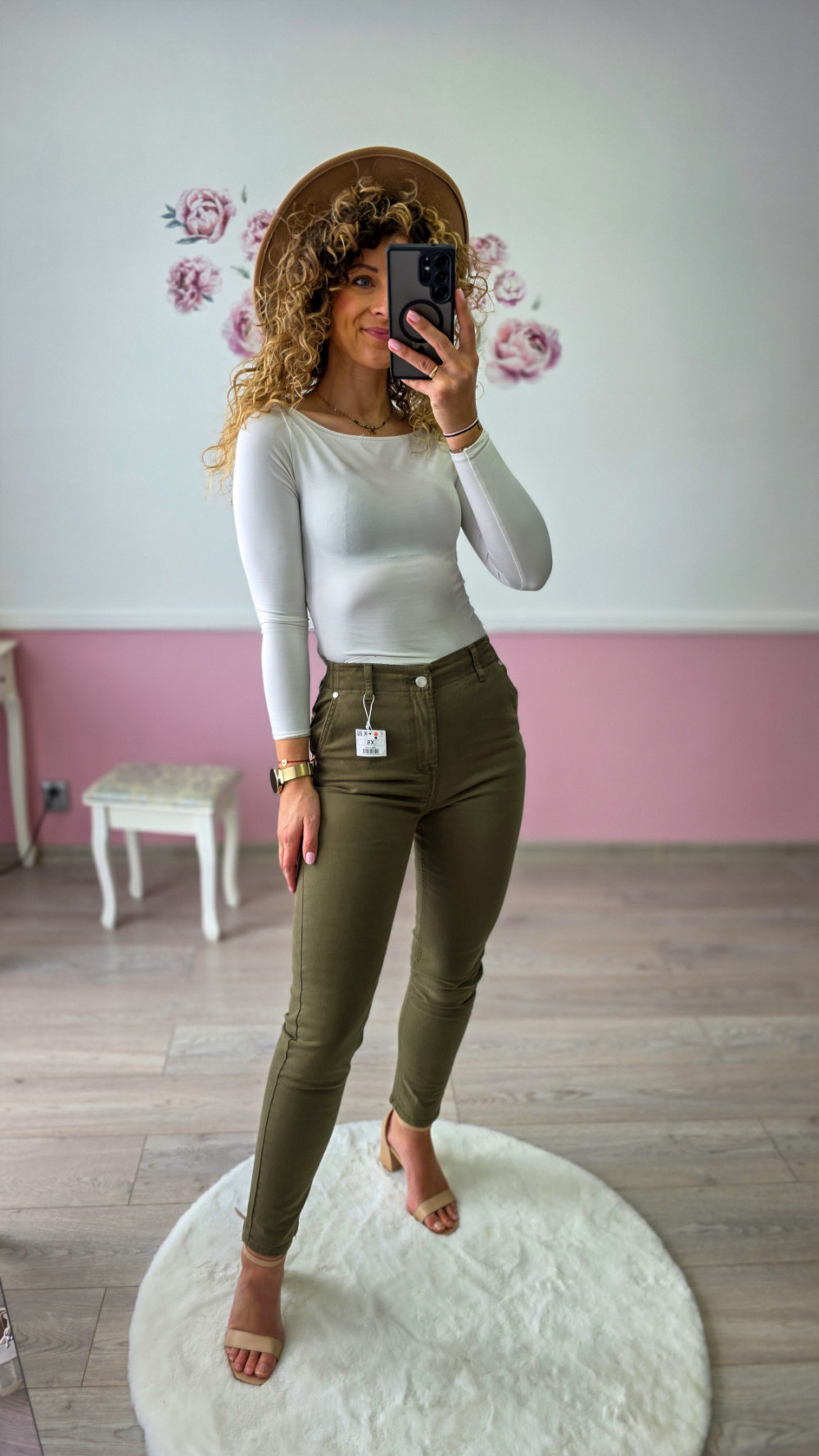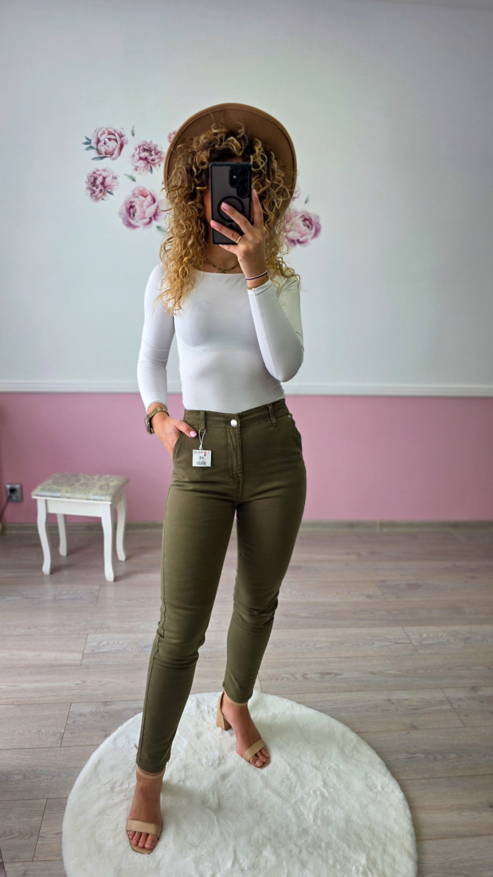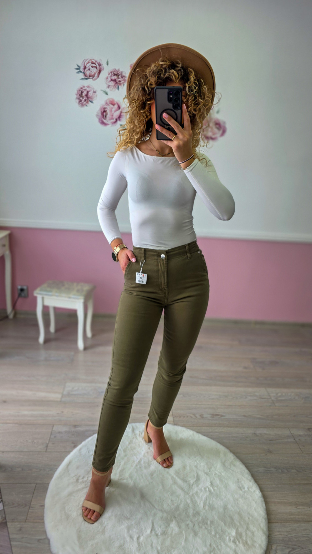 Oliwkowe spodnie slim fit z wysokim stanem – wygodne, elastyczne, idealne na co dzień
