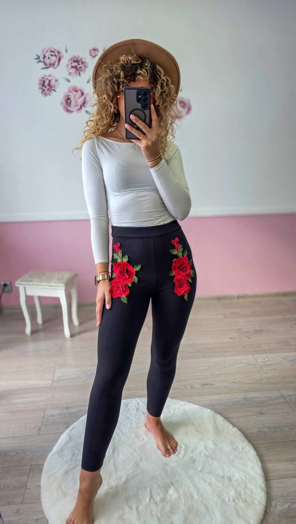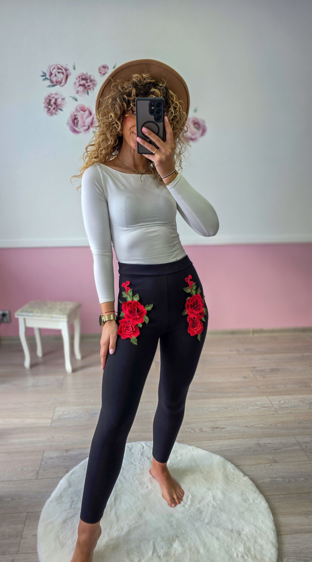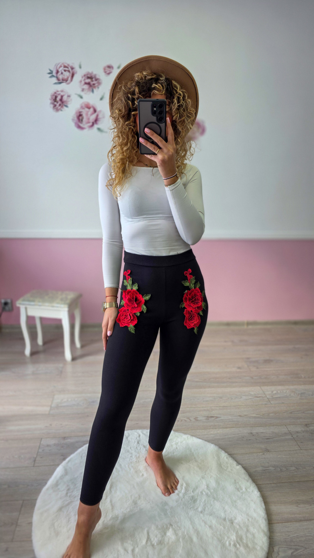 Czarne legginsy damskie z haftowanymi czerwonymi różami – elastyczne, modelujące, wyjątkowe