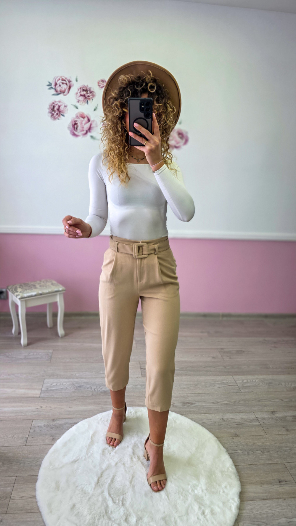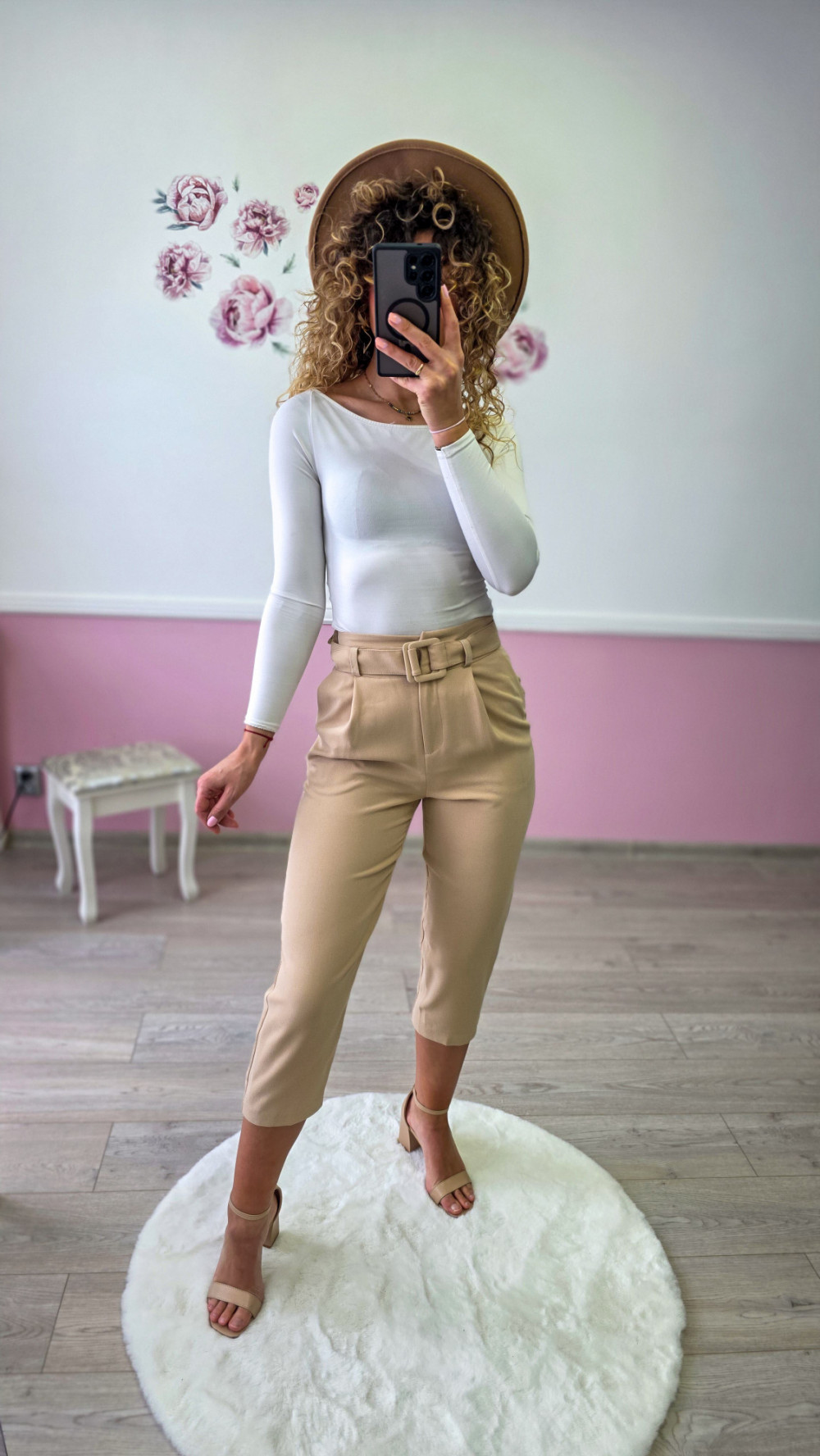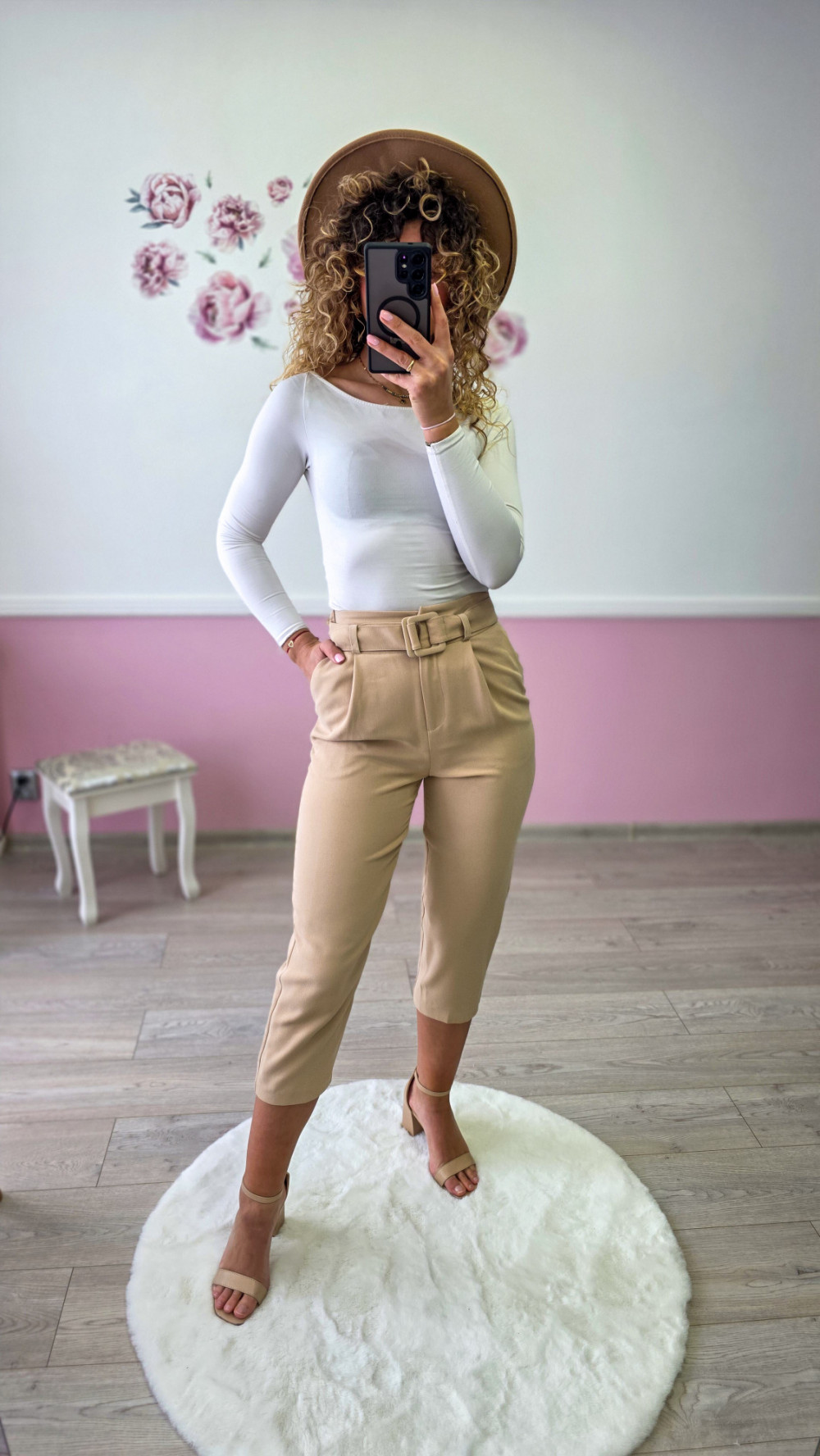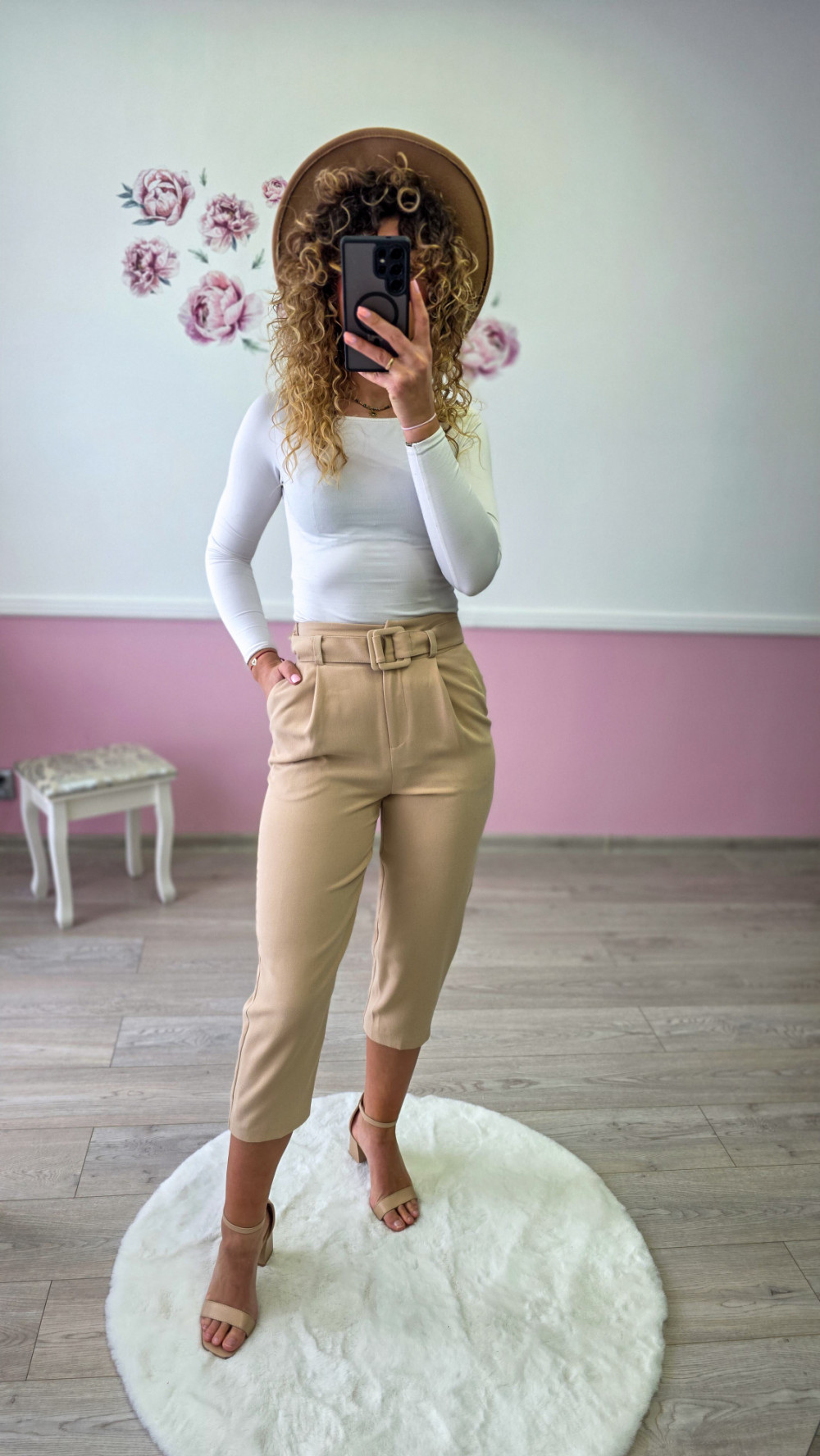 Beżowe spodnie cygaretki 3/4 z paskiem – eleganckie, wysoki stan, klasyczny krój