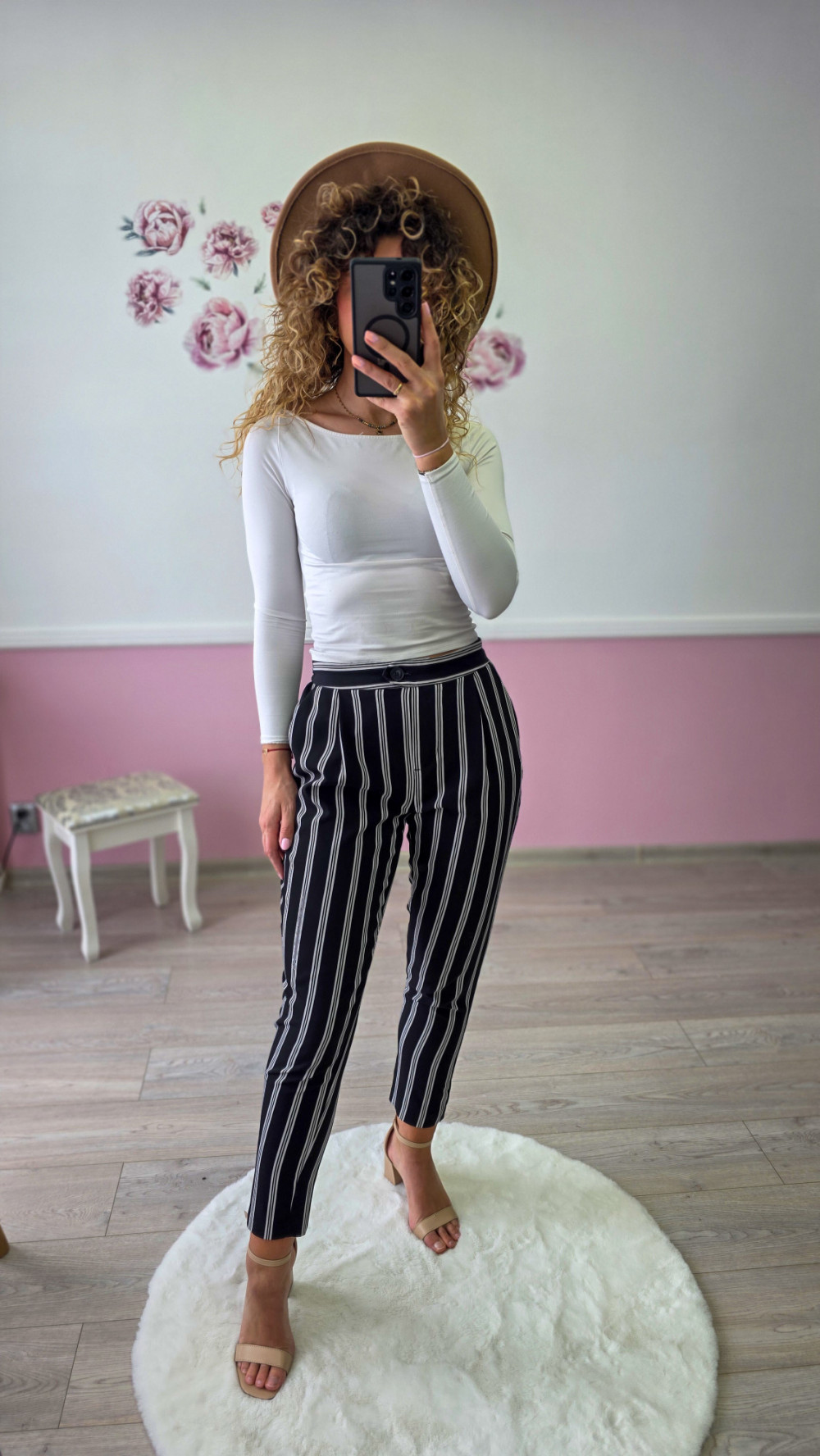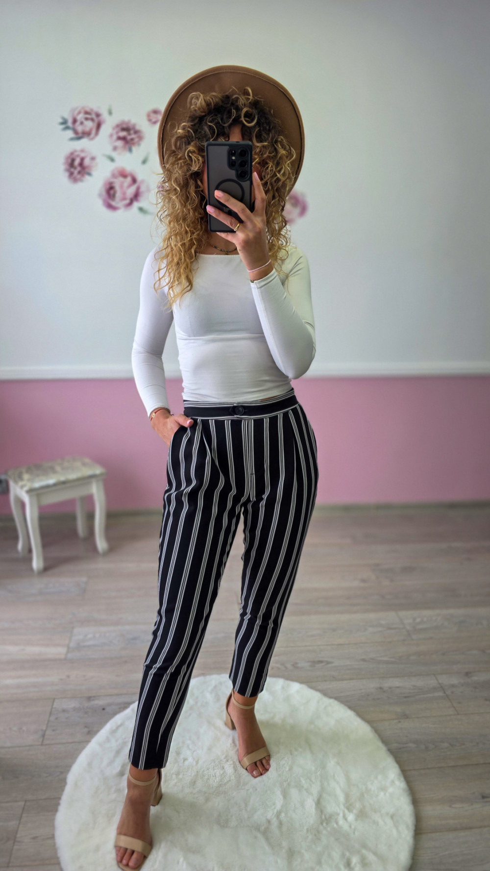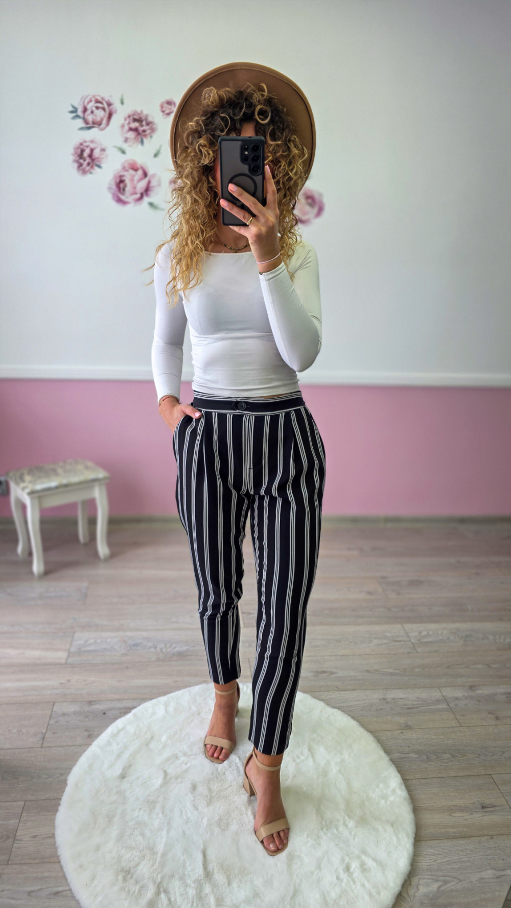 Wykonane z przyjemnego, lekkiego materiału, który nie krępuje ruchów i doskonale układa się na sylwetce, sprawdzą się w stylizacjach biurowych, biznesowych i casualowych. Klasyczna czerń przełamana białymi paskami sprawia, że spodnie łatwo zestawić z jednolitymi bluzkami, koszulami czy prostymi topami.