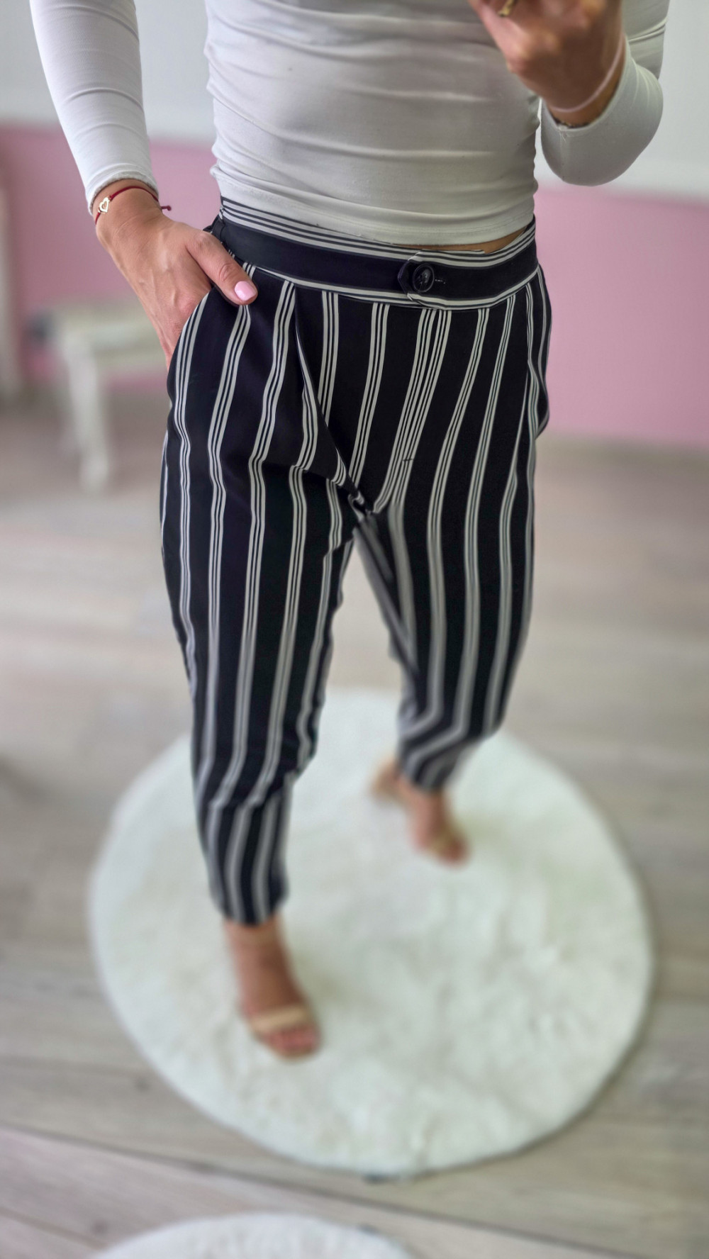 Czarne spodnie damskie w paski – eleganckie, zwężane, średni stan