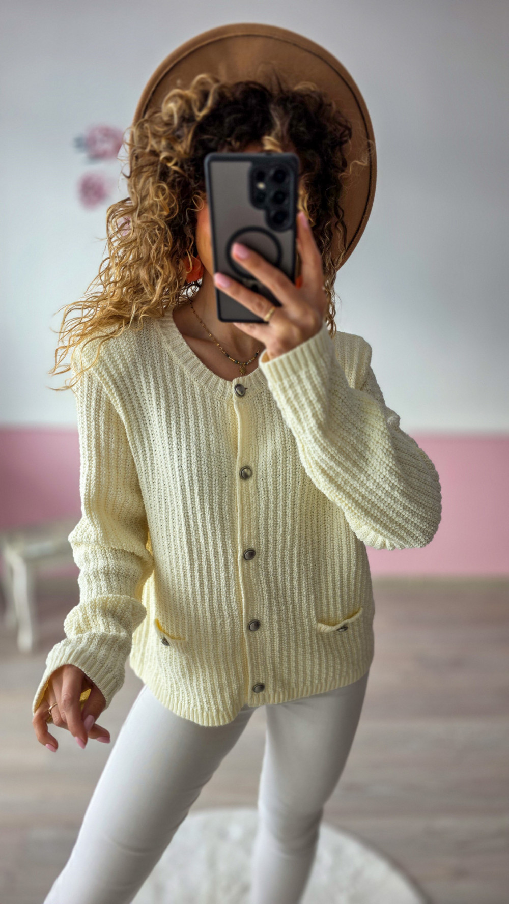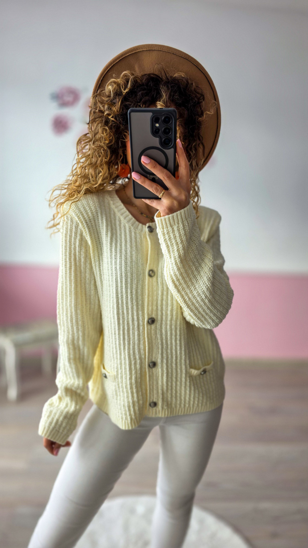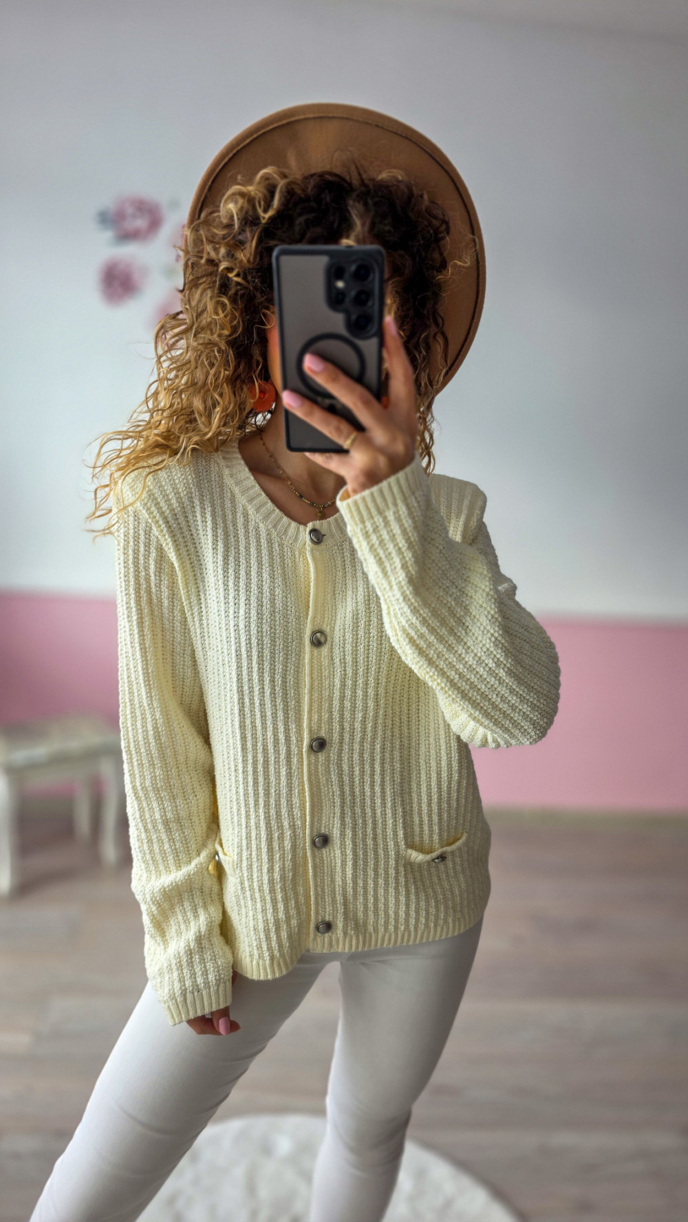 Ten kremowy kardigan to idealna propozycja dla kobiet, które cenią miękkie, przytulne swetry o eleganckim i jednocześnie modernistycznym wykończeniu. Prążkowana, mięsista dzianina pięknie układa się na sylwetce, tworząc ciepłą, wygodną i stylową warstwę na chłodniejsze dni. Model został wyposażony w delikatne poduszki na ramionach, które subtelnie podkreślają linię ramion, nadając całej stylizacji bardziej zdefiniowaną, modną formę. Klasyczne guziki tworzą ponadczasowy akcent, a dwa małe kieszonki dodają całości uroku i praktyczności. Kardigan w kremowym odcieniu świetnie komponuje się z jasnymi spodniami i denimem, tworząc stylizacje idealne na co dzień, do pracy, na spotkania czy weekendowe wyjścia. To uniwersalny, kobiecy sweter, który łączy wygodę, subtelną elegancję i nowoczesny akcent w postaci poduszek na ramionach, stając się must-have w garderobie na wiele sezonów.