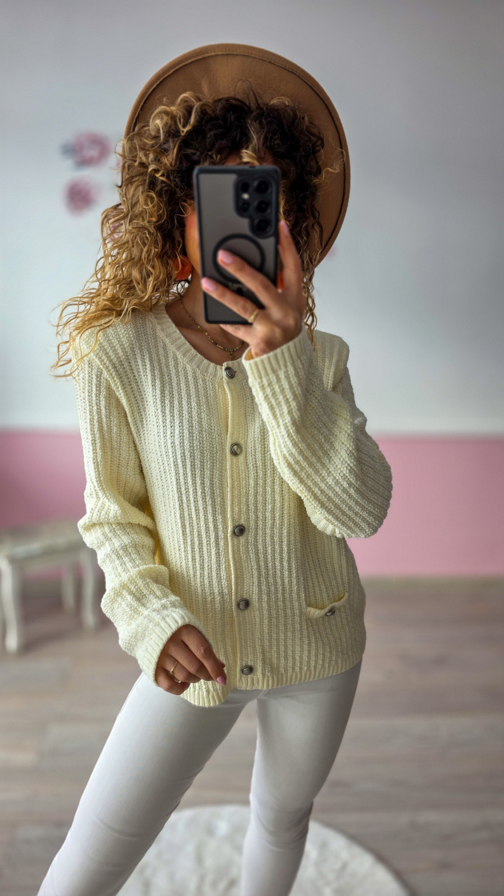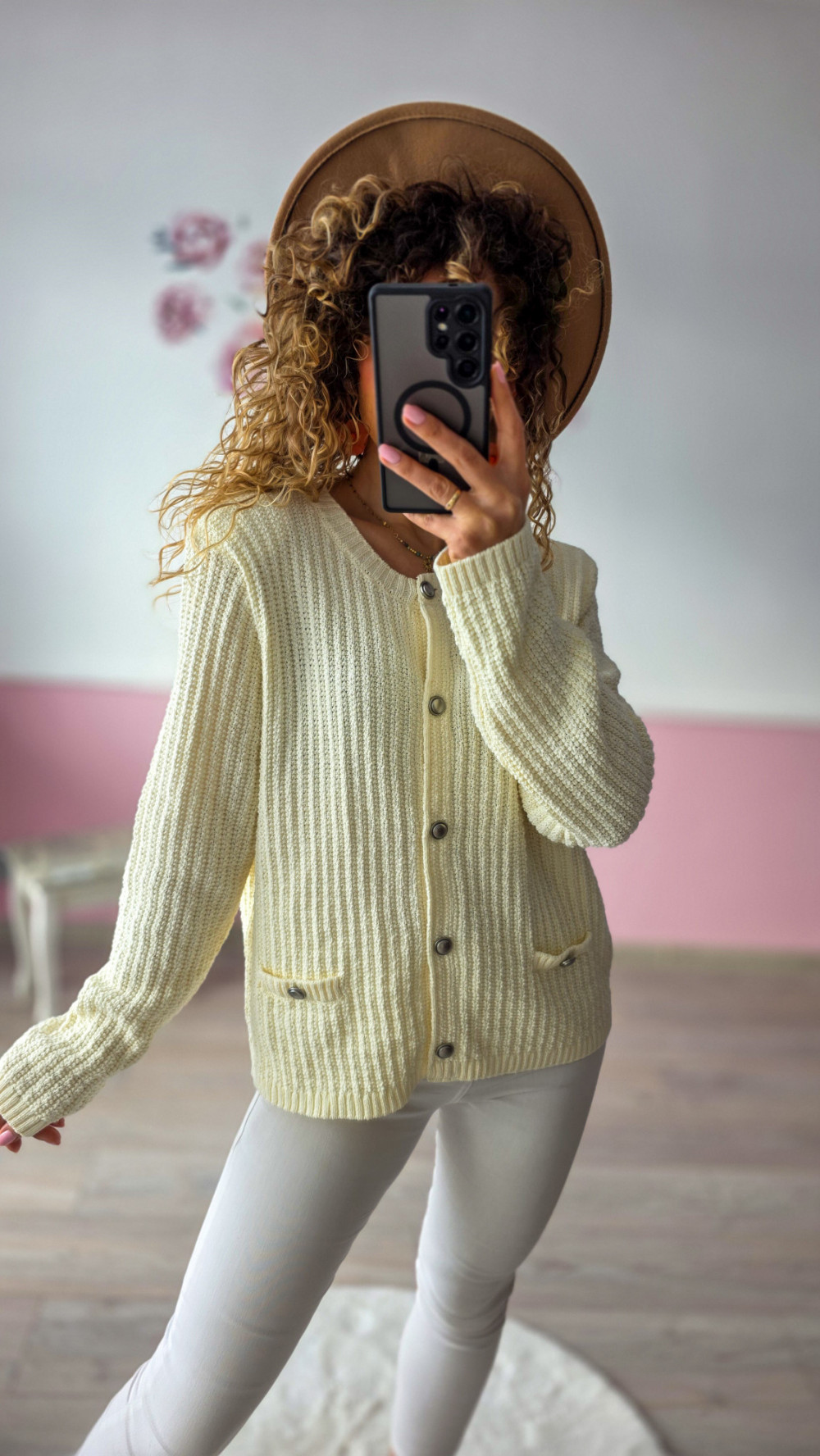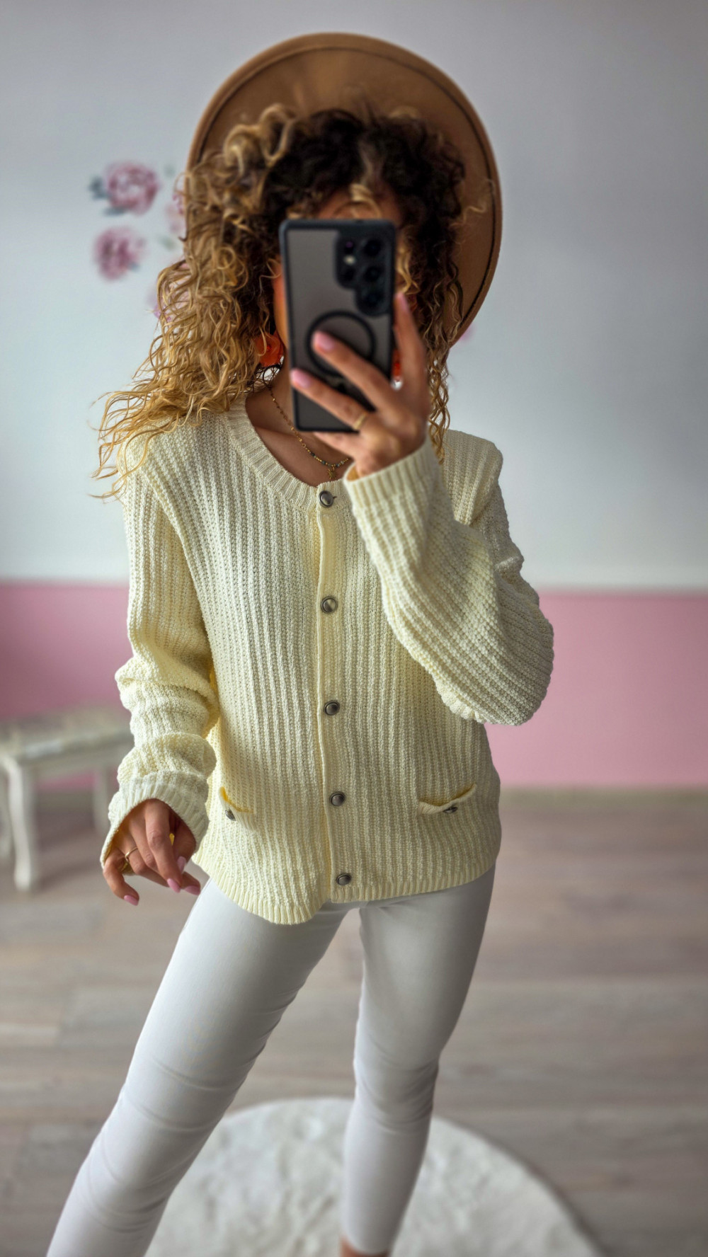 Ten kremowy kardigan to idealna propozycja dla kobiet, które cenią miękkie, przytulne swetry o eleganckim i jednocześnie modernistycznym wykończeniu. Prążkowana, mięsista dzianina pięknie układa się na sylwetce, tworząc ciepłą, wygodną i stylową warstwę na chłodniejsze dni. Model został wyposażony w delikatne poduszki na ramionach, które subtelnie podkreślają linię ramion, nadając całej stylizacji bardziej zdefiniowaną, modną formę. Klasyczne guziki tworzą ponadczasowy akcent, a dwa małe kieszonki dodają całości uroku i praktyczności. Kardigan w kremowym odcieniu świetnie komponuje się z jasnymi spodniami i denimem, tworząc stylizacje idealne na co dzień, do pracy, na spotkania czy weekendowe wyjścia. To uniwersalny, kobiecy sweter, który łączy wygodę, subtelną elegancję i nowoczesny akcent w postaci poduszek na ramionach, stając się must-have w garderobie na wiele sezonów.