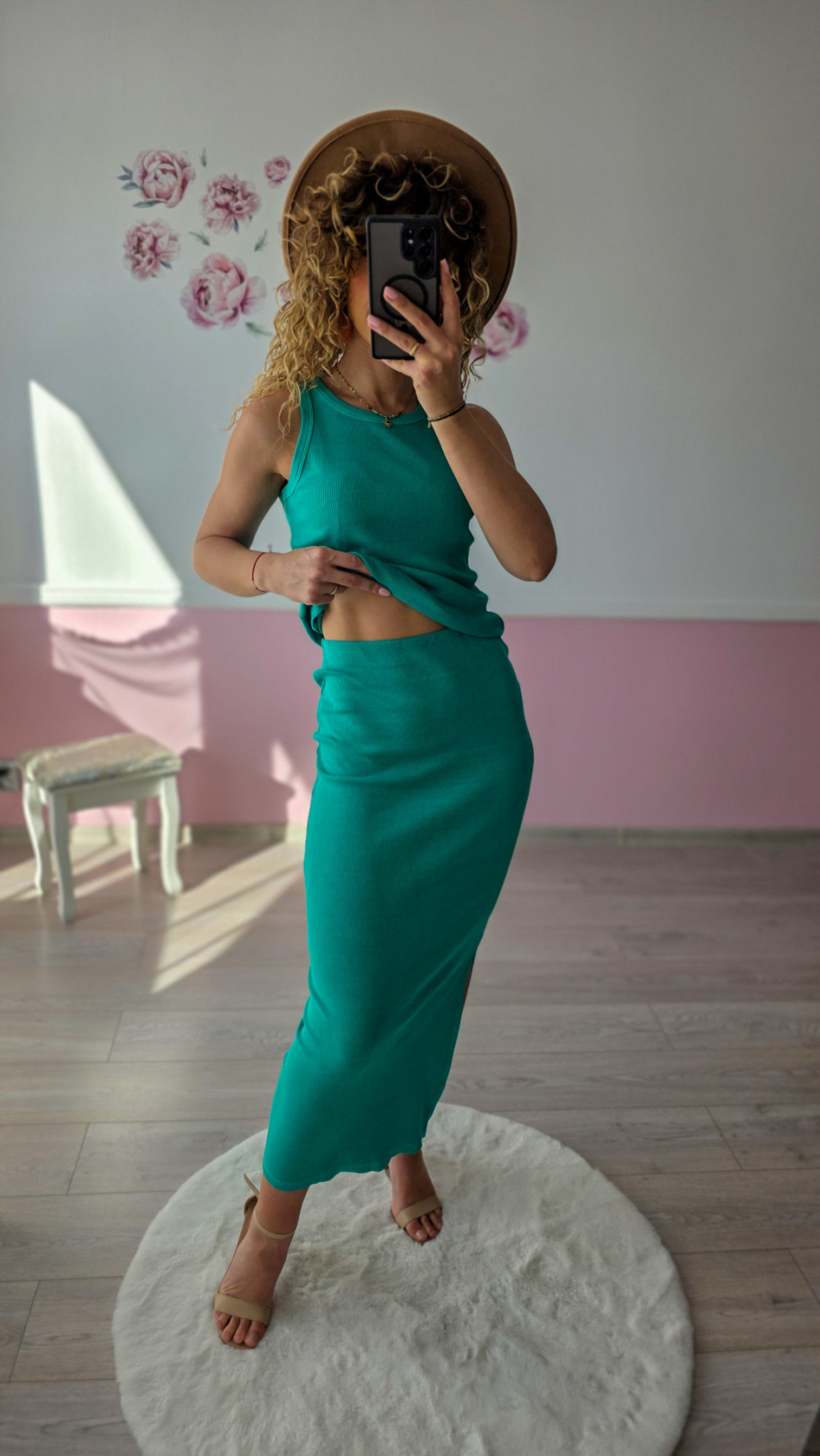 Damski zielony komplet prążkowany – dopasowany letni top na ramiączkach i spódnica midi z rozcięciem