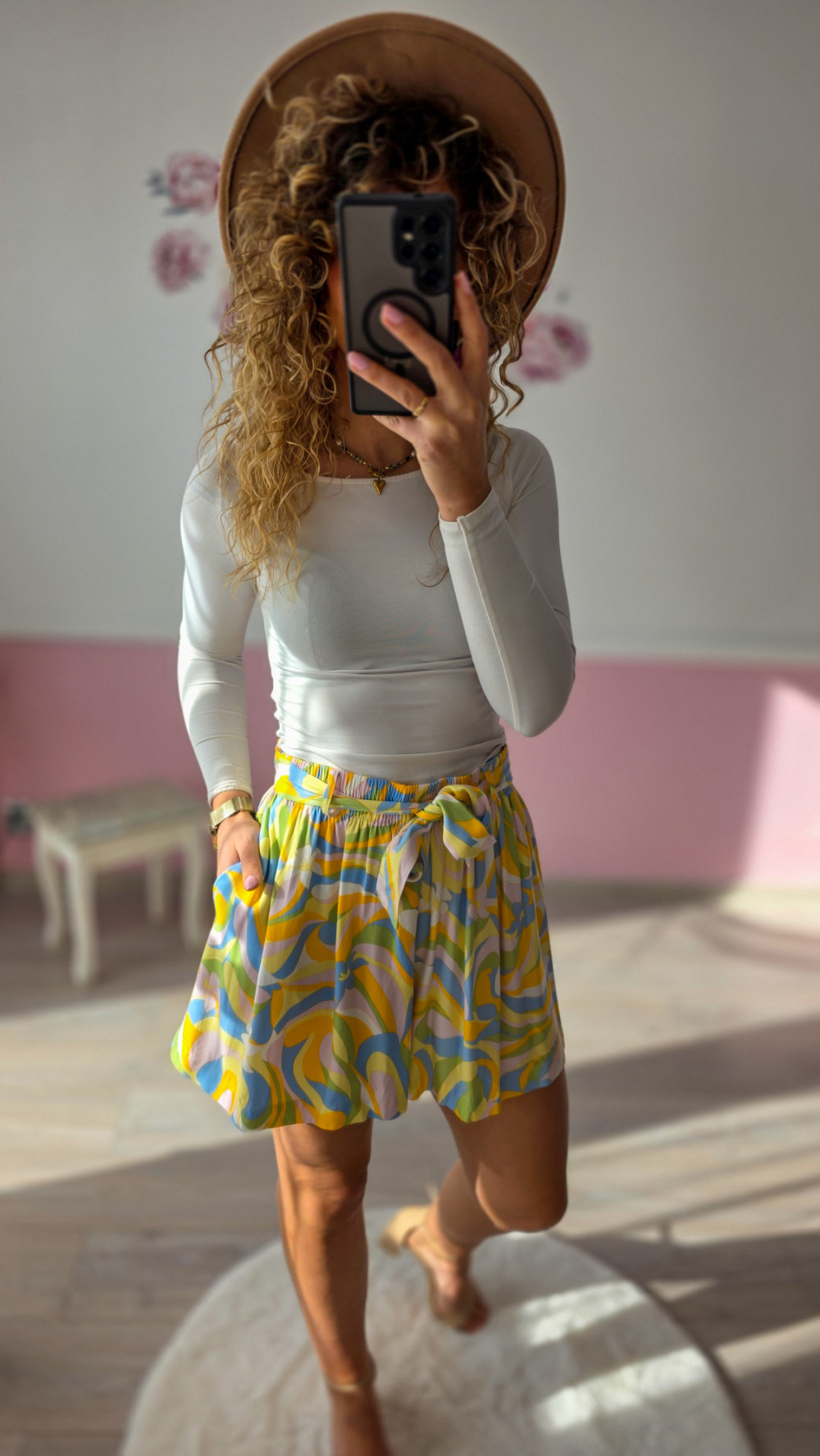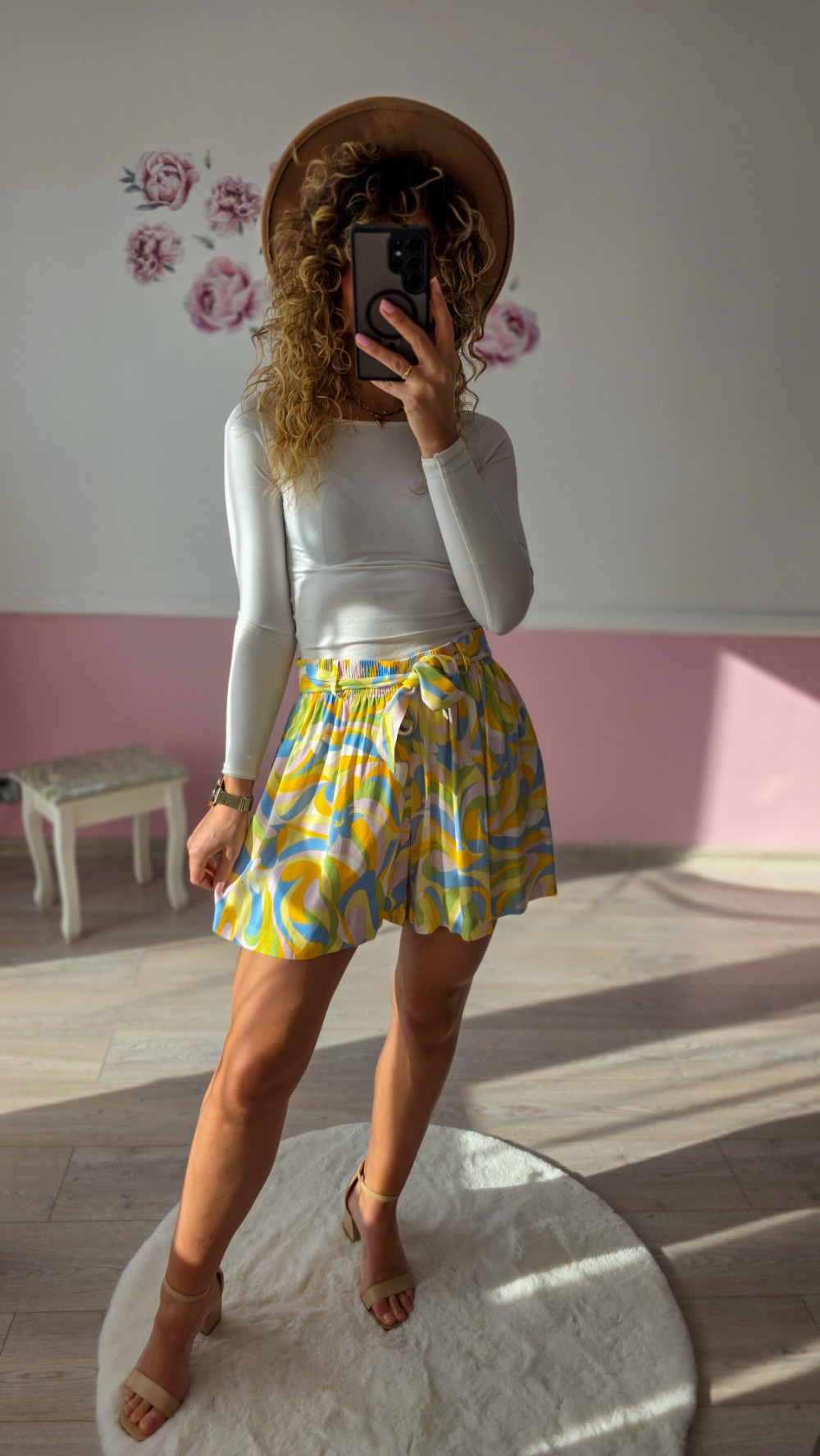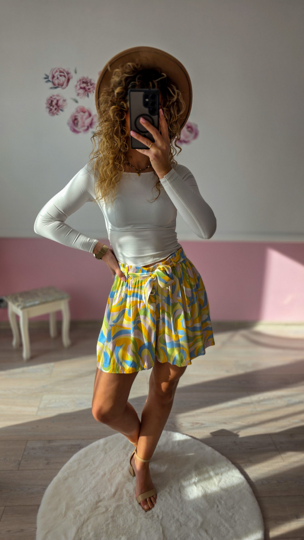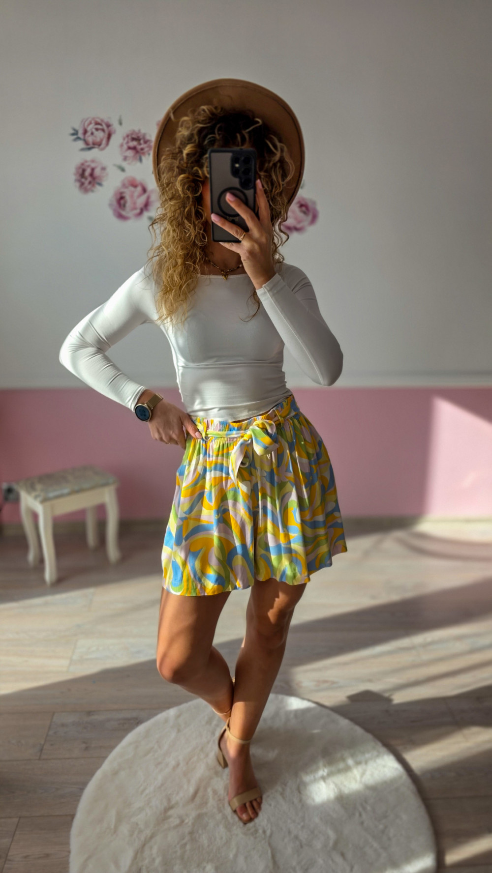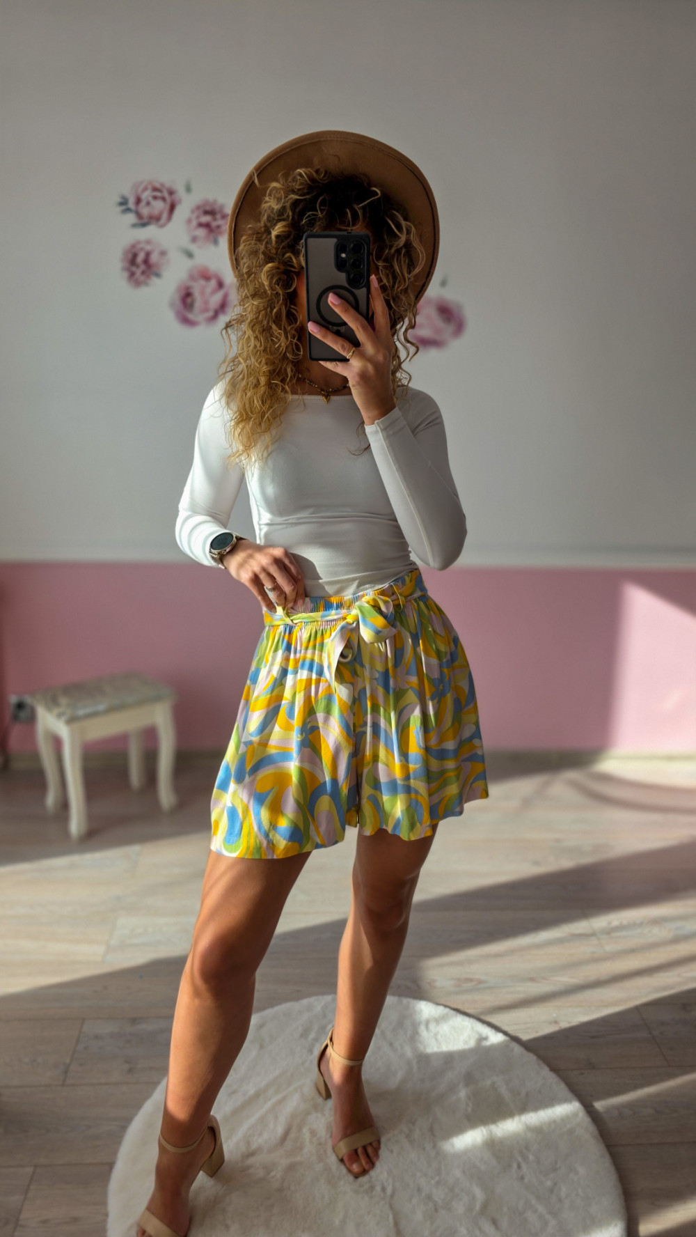 Kolorowe szorty z wiskozy z efektownym wiązaniem w pasie to idealny wybór na lato. Wykonane z lekkiej, oddychającej wiskozy, zapewniają pełen komfort nawet podczas największych upałów. Elastyczny pas z dekoracyjnym wiązaniem podkreśla talię, a swobodny krój gwarantuje wygodę i pełną swobodę ruchów. Energetyczny, abstrakcyjny wzór w odcieniach żółci, niebieskiego i zieleni sprawia, że szorty pięknie ożywiają stylizację i przyciągają uwagę. Idealne na wakacje, spacery, plażę czy codzienne letnie zestawy. Model z PROMOD, który łączy styl, wygodę i modny letni vibe.