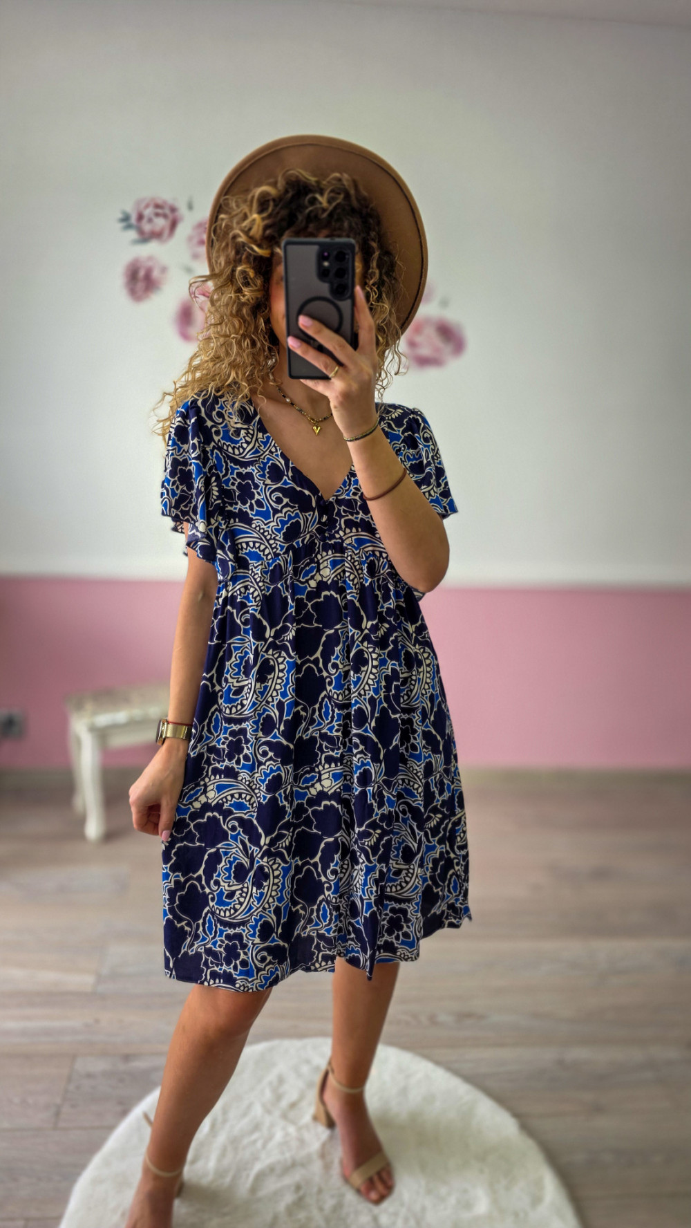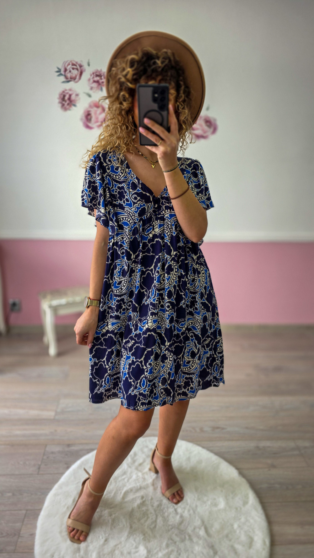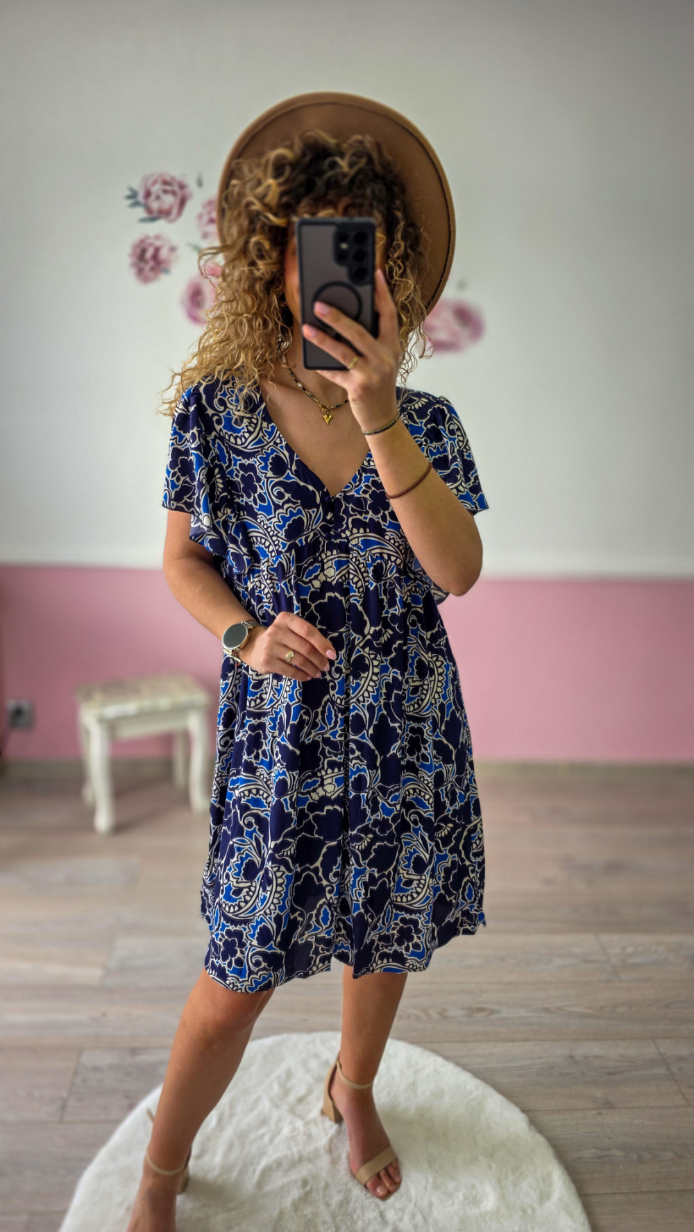 Granatowa sukienka mini we wzory to lekki, kobiecy model idealny na co dzień, do pracy, na randkę czy letnie wyjazdy. Zwiewny fason z pięknym dekoltem V subtelnie podkreśla sylwetkę, a delikatne rękawki dodają całości dziewczęcej lekkości. Wzorzysty print w odcieniach niebieskiego i bieli prezentuje się niezwykle stylowo, a wygodny materiał zapewnia komfort przez cały dzień. To sukienka, która świetnie sprawdzi się zarówno w casualowych, jak i bardziej eleganckich stylizacjach.
