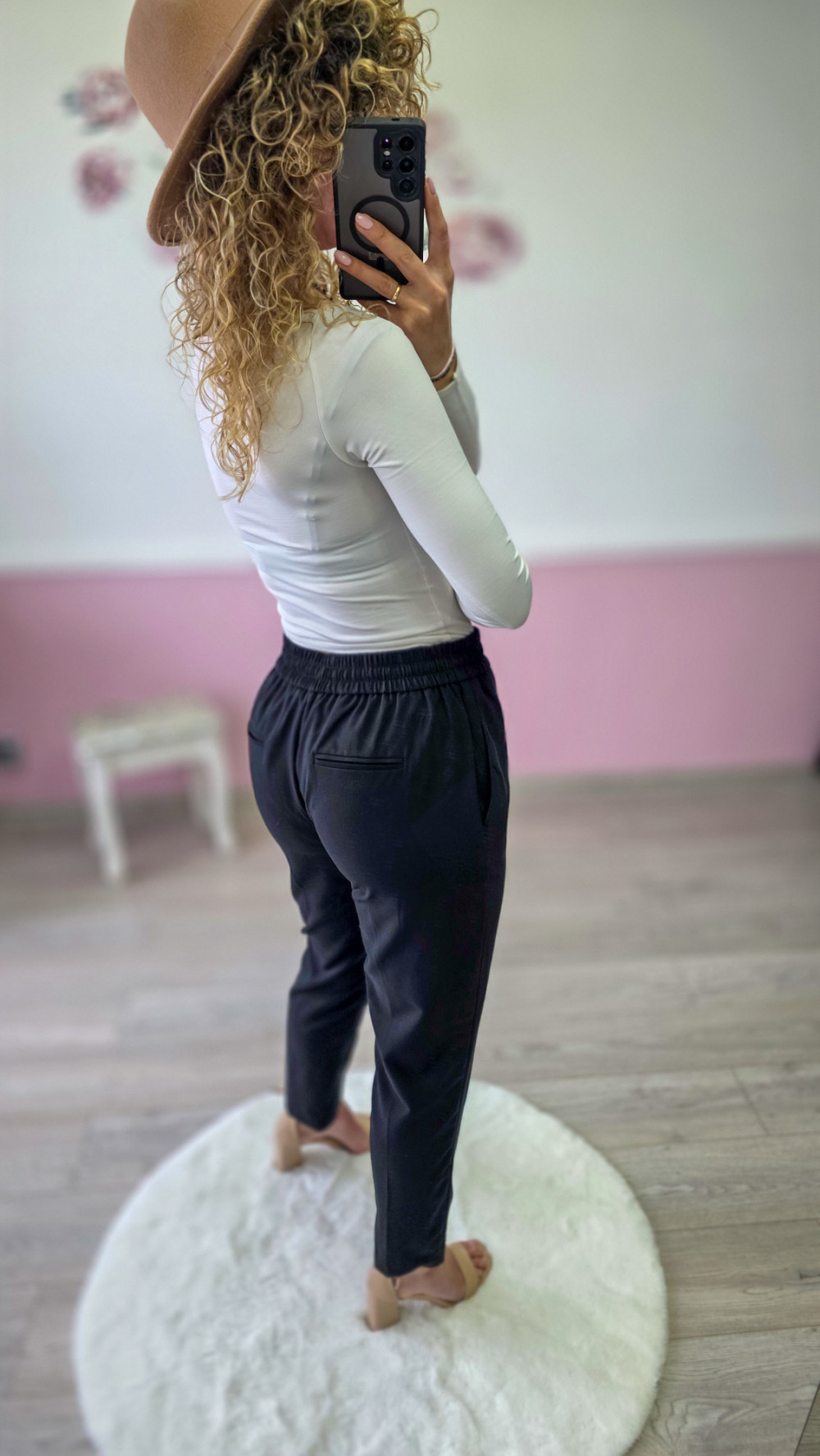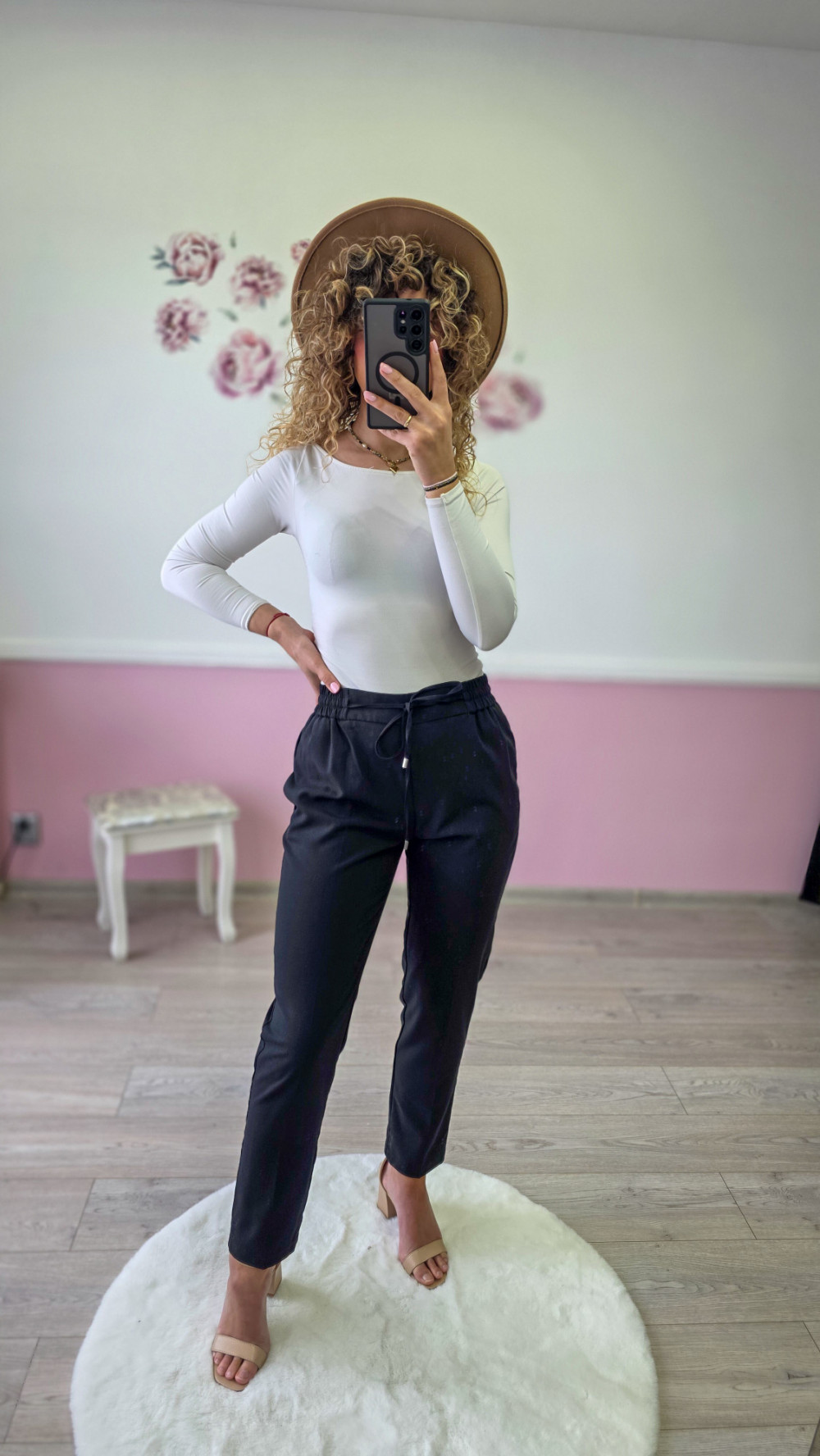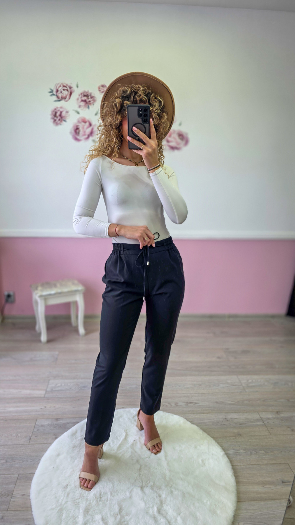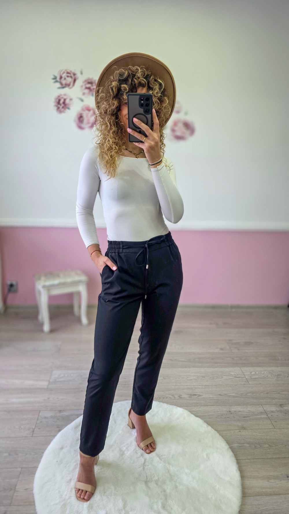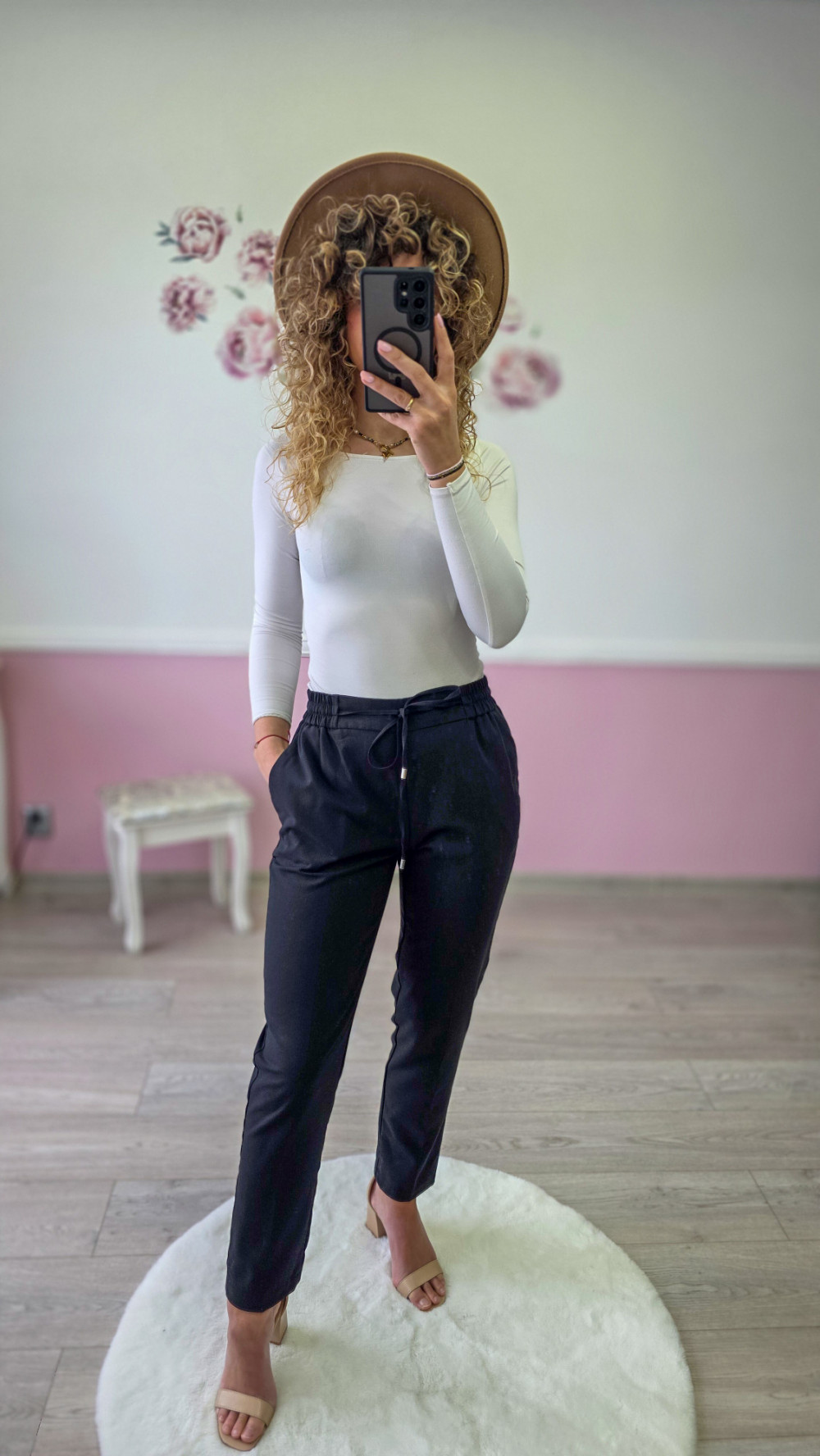 Klasyczne i bardzo wygodne czarne spodnie materiałowe o zwężanym kroju, idealne zarówno na co dzień, jak i do pracy. Miękki, przyjemny materiał pięknie układa się na sylwetce, a elastyczna gumka w pasie oraz sznurek do regulacji zapewniają pełen komfort noszenia. Spodnie posiadają praktyczne kieszenie, dzięki czemu są nie tylko stylowe, ale również funkcjonalne.