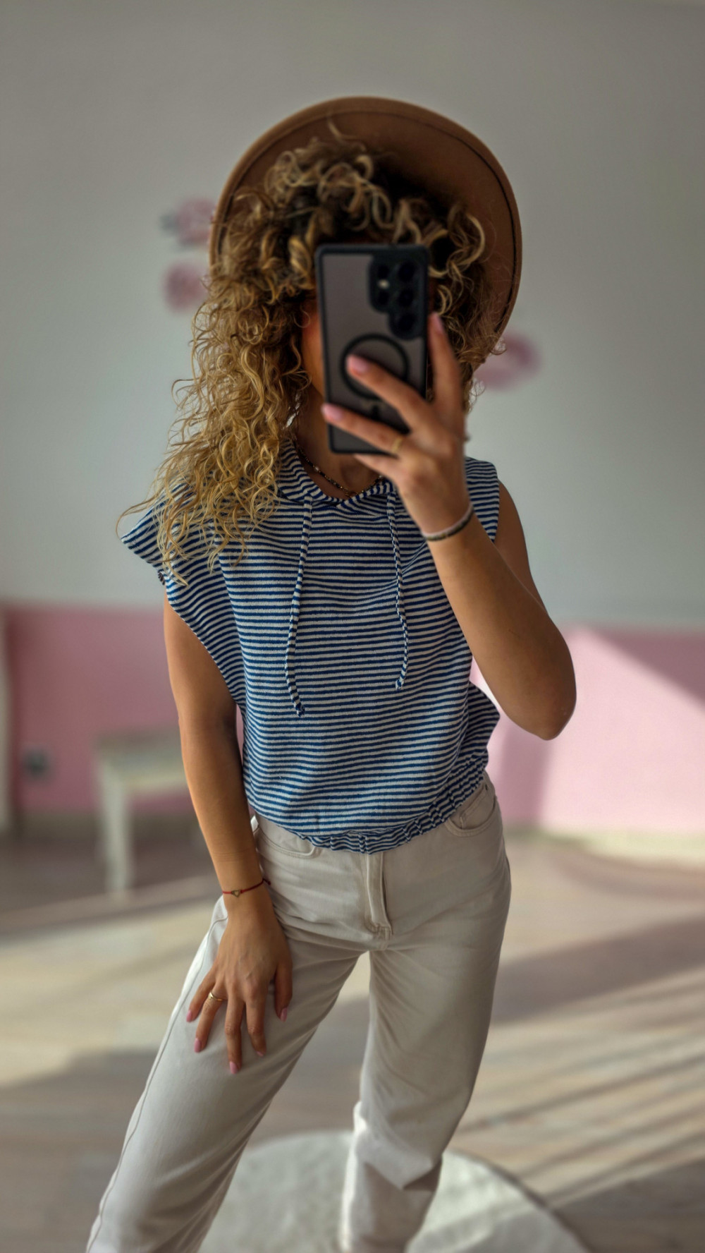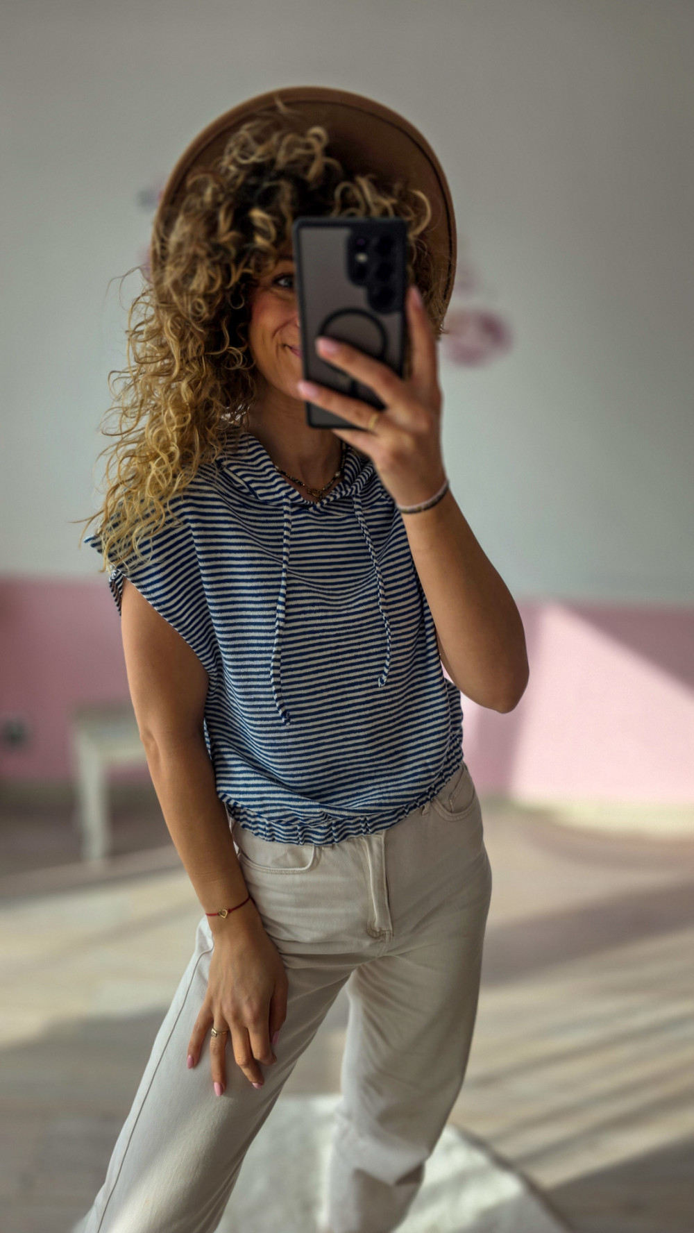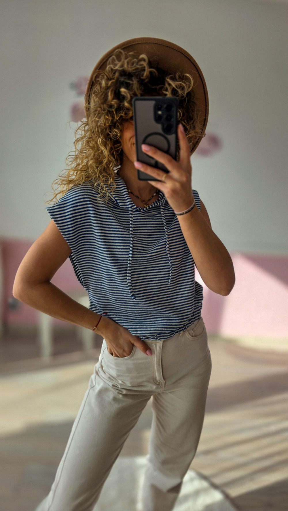 Koszulka w paski z kapturem – bawełniany top bez rękawów, granatowo-biały, casualowy i lekki
