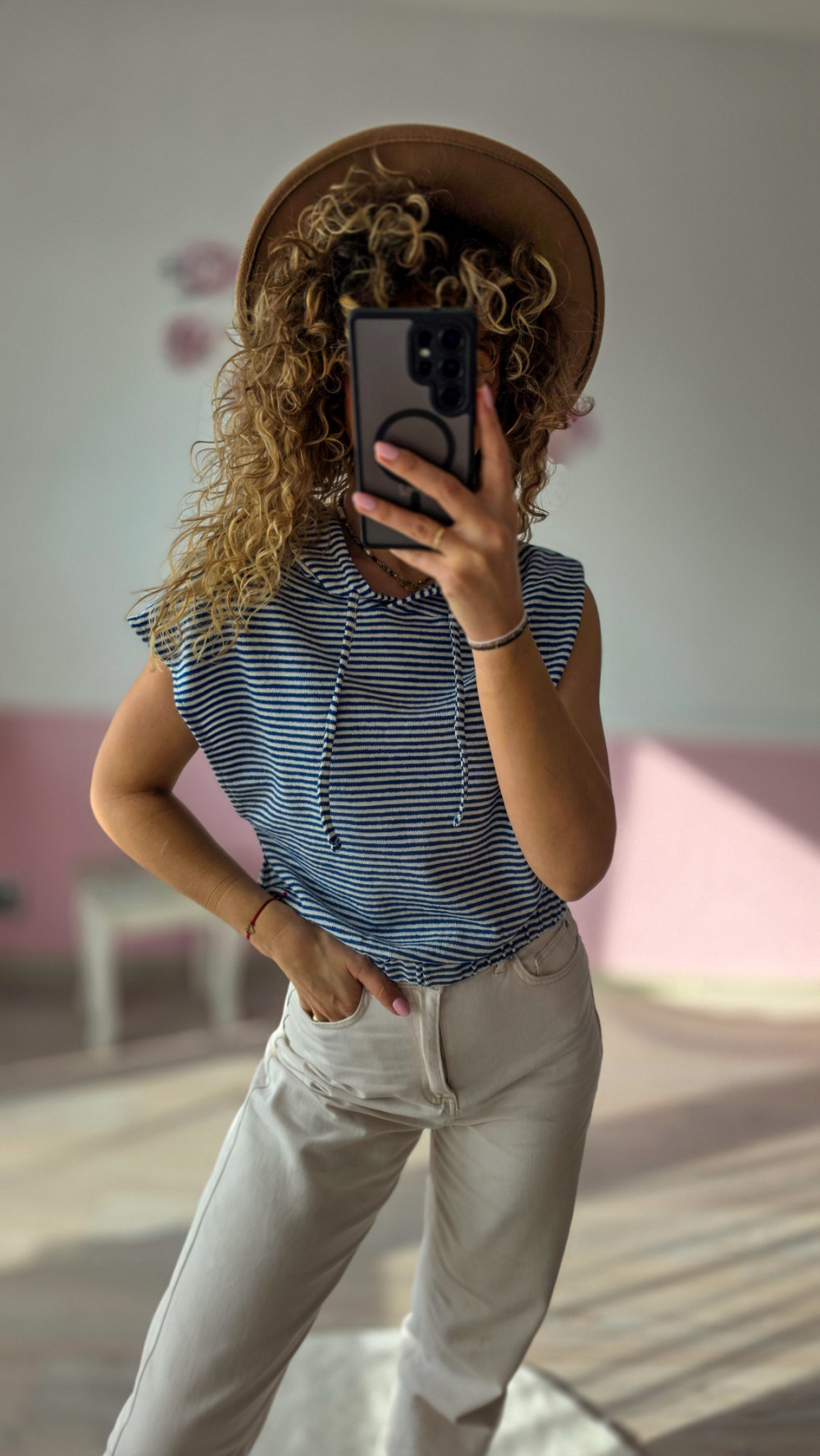 Top jest świetnym wyborem do jeansów, szortów czy spódniczek — tworzy stylizacje casualowe, sportowe i plażowe. To idealny element garderoby dla osób ceniących luz, wygodę i ponadczasowy wzór w paski.