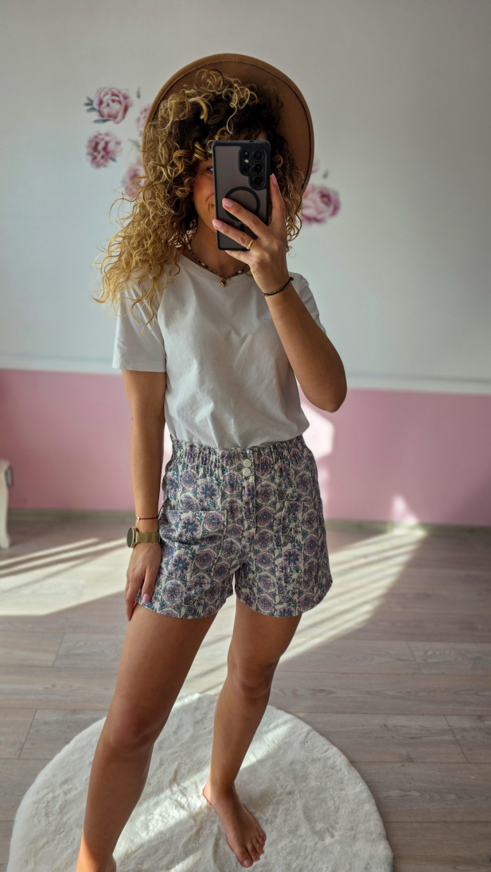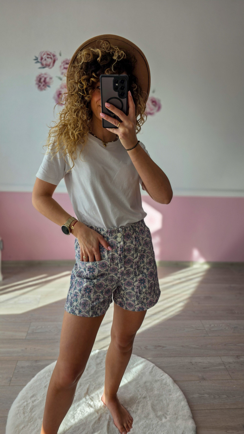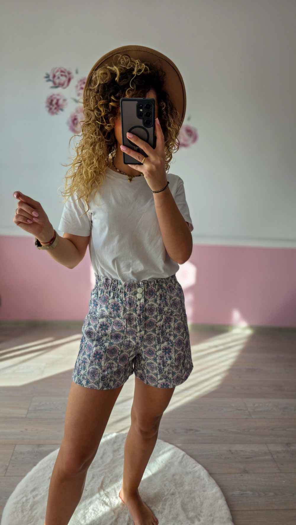 Lekkie, wygodne szorty damskie ze średnim stanem w subtelny, boho wzór. Elastyczna talia z marszczeniem oraz podwójnym guzikiem zapewnia idealne dopasowanie do sylwetki, nie uciskając i nie ograniczając ruchów. Miękki, przewiewny materiał sprawia, że spodenki świetnie sprawdzą się w upalne dni – na co dzień, na wakacjach czy weekendowych wyjazdach.