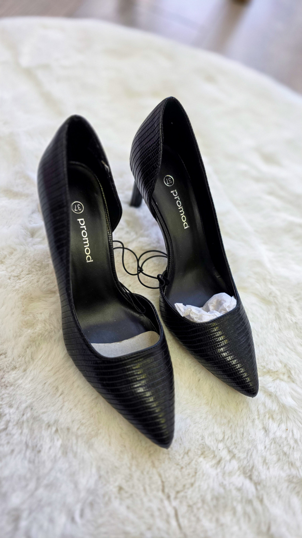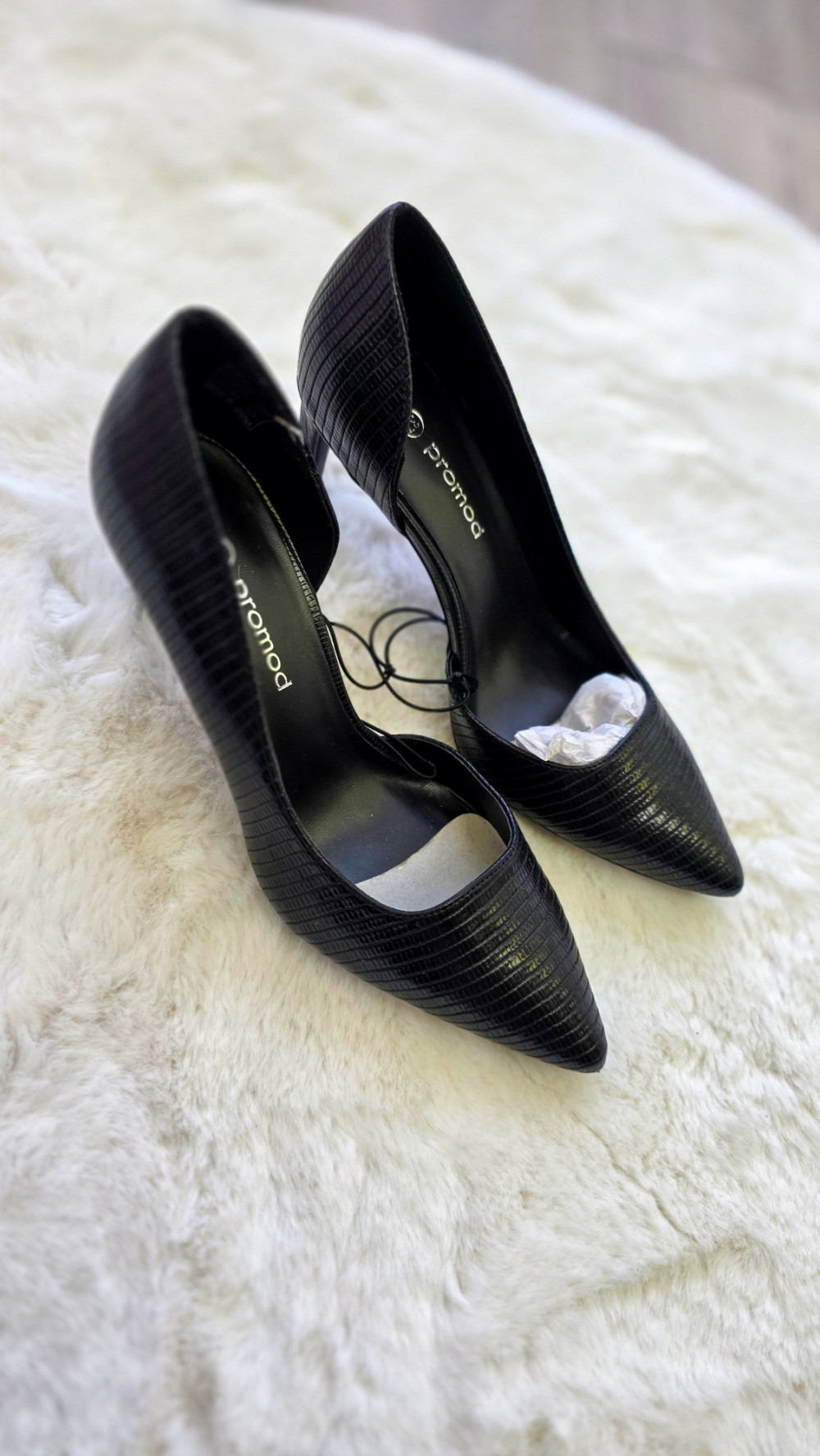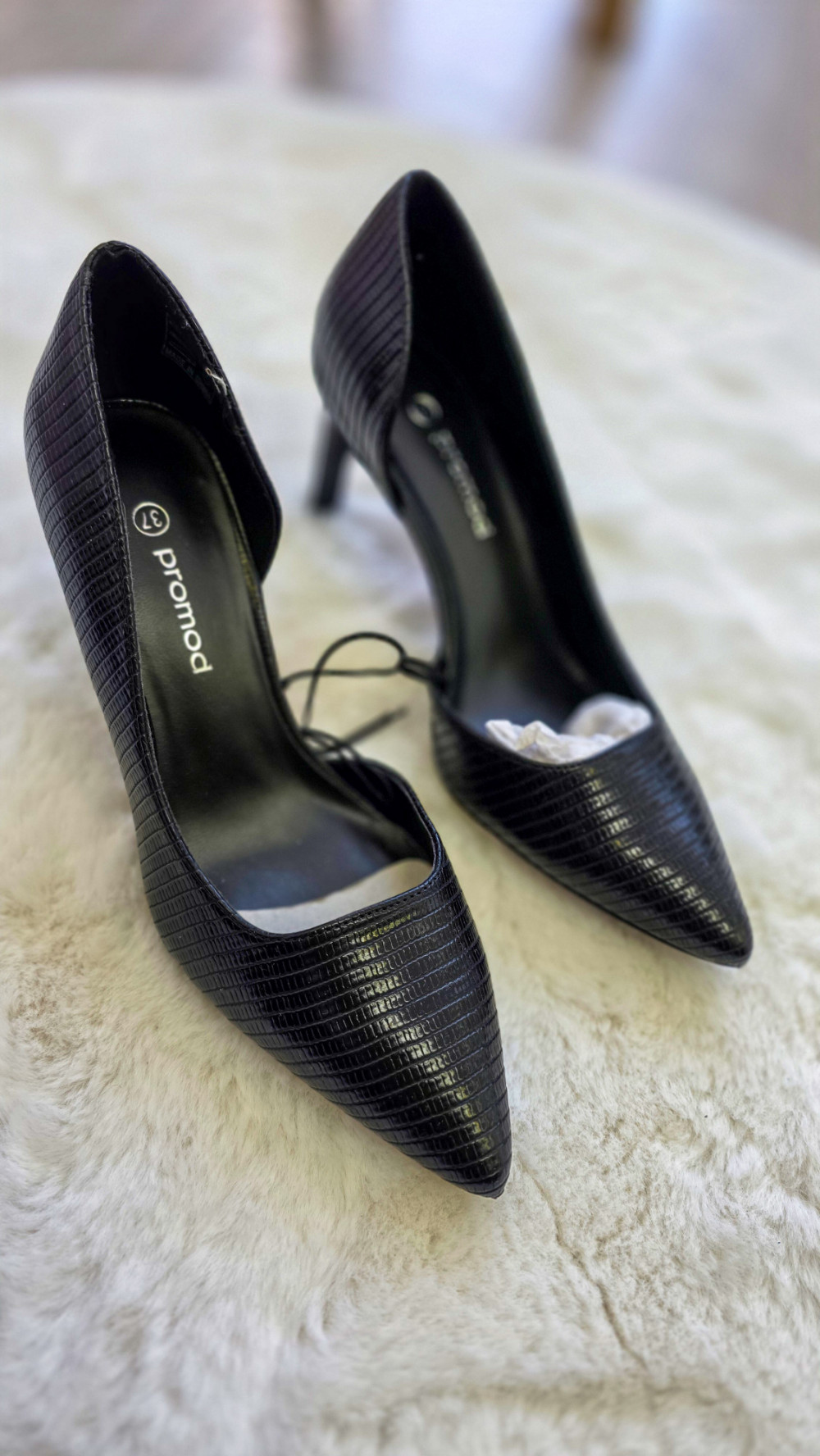 Czarne szpilki PROMOD w rozmiarze 37 to ponadczasowy model dla kobiet ceniących elegancję i wygodę. Smukły nosek, subtelna faktura imitująca skórkę oraz klasyczny obcas tworzą idealne czółenka na każdą okazję – od pracy, przez imprezę, po wieczorne wyjścia.