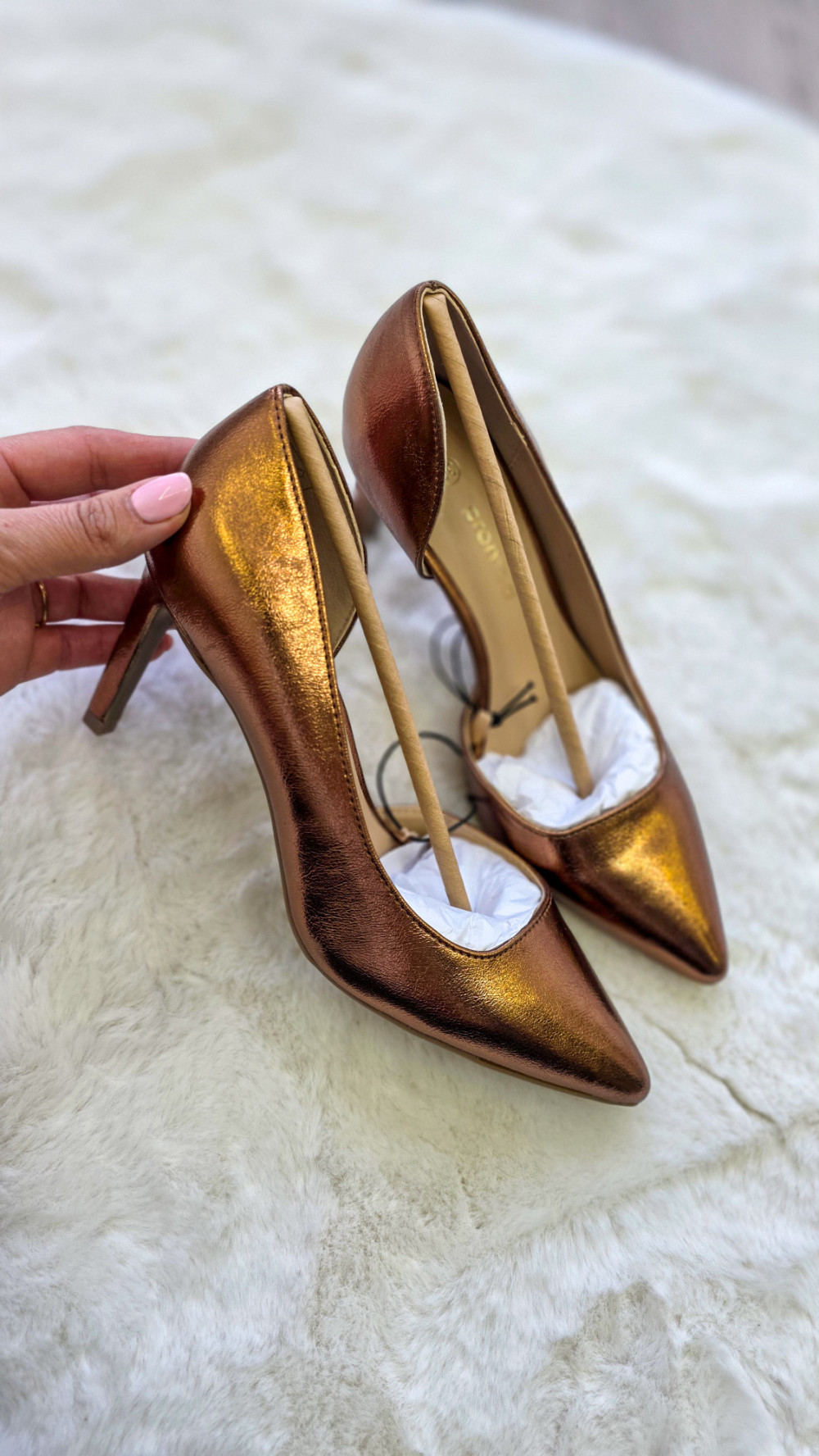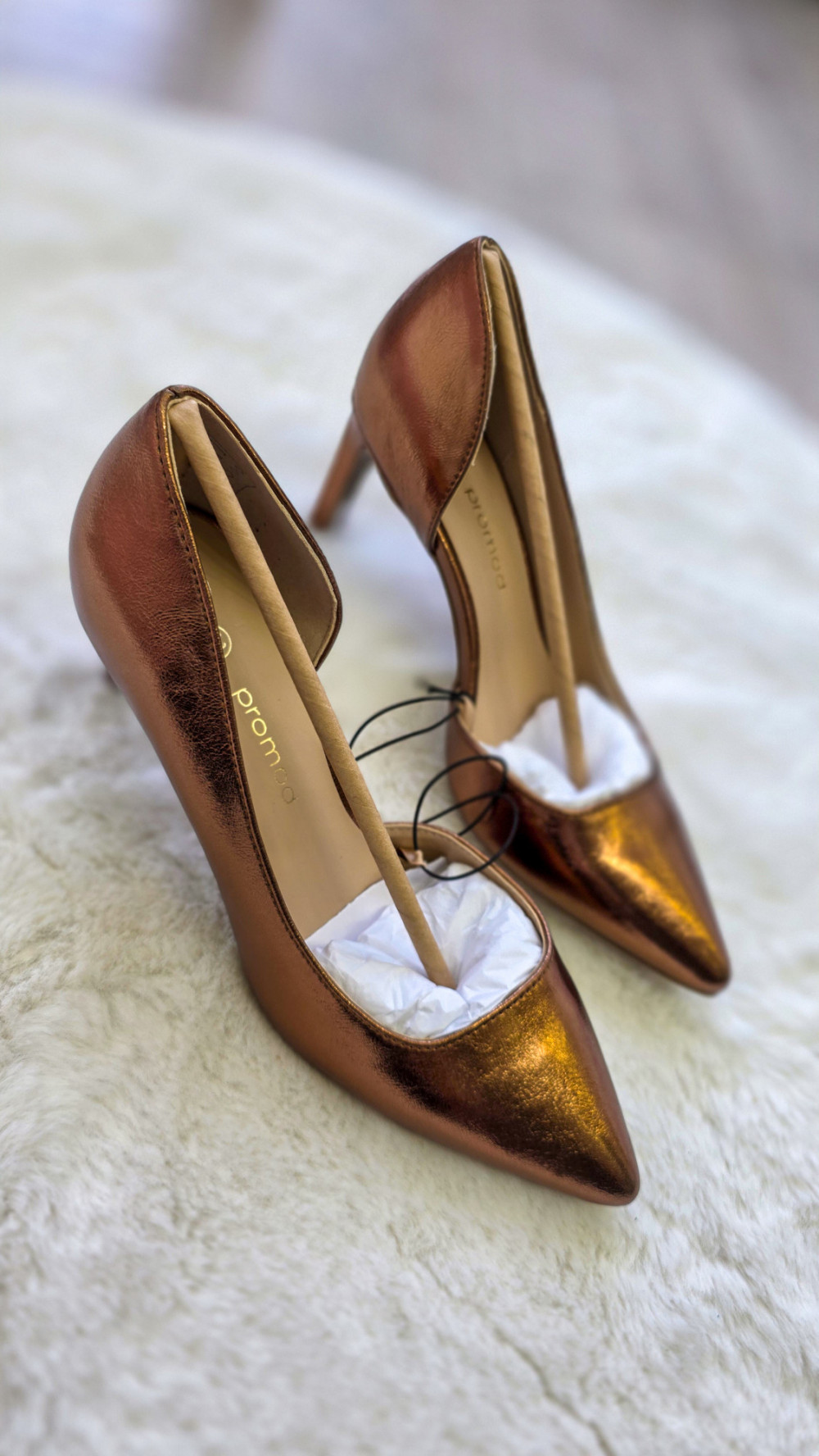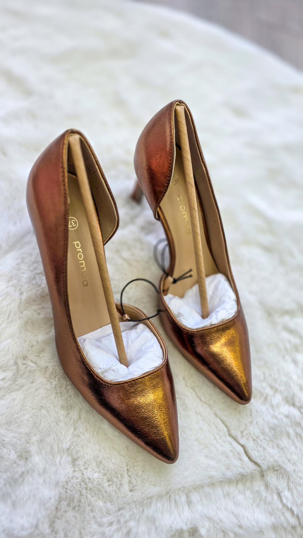 Modne szpilki PROMOD w rozmiarze 37 o metalicznym, miedzianym wykończeniu to propozycja dla kobiet lubiących przyciągać spojrzenia. Połyskująca powierzchnia, smukły obcas i elegancki fason sprawiają, że te czółenka świetnie sprawdzą się na wesele, imprezę, randkę czy wyjątkowe wyjście.